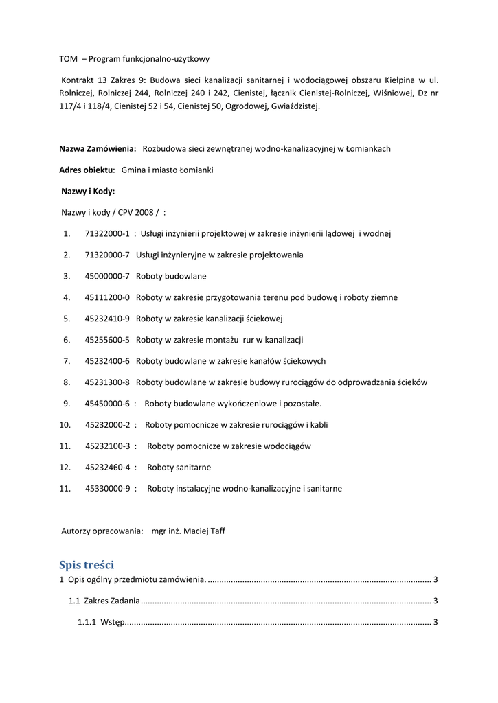 TOM – Program funkcjonalno-użytkowy Kontrakt 13 Zakres 9: Budowa sieci kanalizacji sanitarnej i wodociągowej obszaru Kiełpina w ul. Rolniczej, Rolniczej 244, Rolniczej 240 i 242, Cienistej, łącznik Cienistej-Rolniczej, Wiśniowej, Dz nr 117/4 i 118/4, Cienistej 52 i 54, Cienistej 50, Ogrodowej, Gwiaździstej. Nazwa Zamówienia: Rozbudowa sieci zewnętrznej wodno-kanalizacyjnej w Łomiankach Adres obiektu: Gmina i miasto Łomianki Nazwy i Kody: Nazwy i kody / CPV 2008 / : 1. 71322000-1 : Usługi inżynierii projektowej w zakresie inżynierii lądowej i wodnej 2. 71320000-7 Usługi inżynieryjne w zakresie projektowania 3. 45000000-7 Roboty budowlane 4. 45111200-0 Roboty w zakresie przygotowania terenu pod budowę i roboty ziemne 5. 45232410-9 Roboty w zakresie kanalizacji ściekowej 6. 45255600-5 Roboty w zakresie montażu rur w kanalizacji 7. 45232400-6 Roboty budowlane w zakresie kanałów ściekowych 8. 45231300-8 Roboty budowlane w zakresie budowy rurociągów do odprowadzania ścieków 9. 45450000-6 : Roboty budowlane wykończeniowe i pozostałe. 10. 45232000-2 : Roboty pomocnicze w zakresie rurociągów i kabli 11. 45232100-3 : Roboty pomocnicze w zakresie wodociągów 12. 45232460-4 : Roboty sanitarne 11. 45330000-9 : Roboty instalacyjne wodno-kanalizacyjne i sanitarne Autorzy opracowania: mgr inż. Maciej Taff Spis treści 1 Opis ogólny przedmiotu zamówienia. ................................................................................................. 3 1.1 Zakres Zadania .............................................................................................................................. 3 1.1.1 Wstęp..................................................................................................................................... 3 1.1.2 Spodziewane efekty inwestycji.............................................................................................. 5 1.1.3 Zobowiązania Wykonawcy .................................................................................................... 5 1.1.4. Zakres przedmiotu zamówienia ............................................................................................ 5 1.2 Aktualne uwarunkowania wykonania przedmiotu zamówienia. ............................................... 11 1.2.1 System gospodarki wodno-ściekowej w Łomiankach ......................................................... 11 1.2.3 Opis przedmiotu zamówienia .............................................................................................. 12 1.2.3 Opis zagospodarowania ....................................................................................................... 12 1.3 Ogólne właściwości funkcjonalno - użytkowe. ........................................................................... 14 1.3.1 Kanalizacja sanitarna .......................................................................................................... 14 1.3.2 Przepompownie ścieków. ................................................................................................... 16 1.3.4 Budowa sieci wodociągowej................................................................................................ 18 1.3.5 Kolizje oraz przejścia przez przeszkody .............................................................................. 18 1.4 Szczegółowe właściwości funkcjonalno - użytkowe. ................................................................. 19 2 Opis Wymagań Zamawiającego w stosunku do przedmiotu zamówienia ....................................... 19 2.1 Forma Dokumentacji Projektowej do opracowania przez Wykonawcę. ................................... 19 2.1.1 Dokumentacja Projektowa. ................................................................................................ 19 2.1.2 Dokumentacja Powykonawcza. ........................................................................................... 20 2.2 Szczegółowe cechy zamówienia dotyczące rozwiązań technicznych ......................................... 21 2.2.1 . Rozpoczęcie Robót ............................................................................................................. 21 2.2.2 Zajęcie terenu ....................................................................................................................... 21 2.2.3 Zajęcia terenu ..................................................................................................................... 21 2.2.4. Sprzęt ................................................................................................................................... 21 2.2.5. Transport ............................................................................................................................. 22 2.2.6 . Składowanie........................................................................................................................ 22 2.2.7. Roboty ziemne ..................................................................................................................... 22 2.2.8 Roboty montażowe ............................................................................................................. 23 2.2.9. MONTAŻ RUROCIĄGÓW...................................................................................................... 24 2.2.10 Odtworzenia nawierzchni .................................................................................................. 24 2.2.11 Wymagania technologiczne............................................................................................... 25 2.2.12 Wymagania materiałowe................................................................................................. 26 2.2.13 Przepompownie ścieków ................................................................................................... 28 2.2.14 Wymagania materiałowe .........................................................................................
