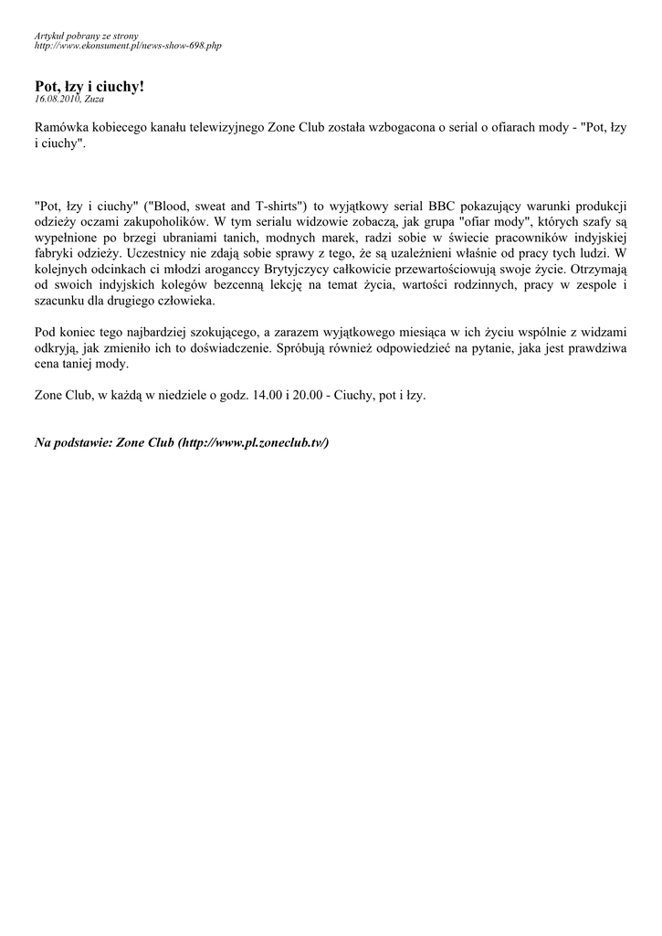 Zone Club, w każdą w niedziele o godz. 14.00 i 20.00 - Ciuchy, pot i łzy.