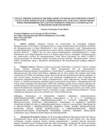 UWAGA: PROSZĘ ZAPOZNAĆ SIĘ DOKŁADNIE Z WARUNKAMI NINIEJSZEJ UMOWY LICENCYJNEJ. KORZYSTANIE Z OPROGRAMOWANIA LUB USŁUG TREND MICRO PRZEZ PRZEDSIĘBIORCÓW LUB INNE PODMIOTY PODLEGA NASTĘPUJĄCYM WARUNKOM I OGRANICZENIOM Umowa Licencyjna Trend Micro Licencja Odpłatna oraz Licencja na Okres Próbny na Usługi i Oprogramowanie dla Przedsiębiorstw oraz SMB Data: Wrzesień 2013 Wersja Polska 1. Zakres Umowy. Niniejsza Umowa ma zastosowanie do wszystkich rodzajów oprogramowania Trend Micro („Oprogramowanie”), usług sprzedawanych jako produkty niezależne od Oprogramowania („Usługi Samodzielne”) oraz usług stanowiących część Oprogramowania („Usługi Integralne”), które są sprzedawane na rzecz małych i średnich przedsiębiorców („Small and Medium Business” / „SMB”) oraz na rzecz dużych przedsiębiorstw („Przedsiębiorstwa”). Usługi Samodzielne oraz Usługi Integralne zwane są w dalszej części Umowy „Usługami”. Niniejsza umowa ma zastosowanie również do oprogramowania Trend Micro Encryption for Email („TMEE”) wykorzystywanego do osobistego użytku. Powołana powyżej definicja „Oprogramowanie” zawiera TMEE. Świadczenie usług o charakterze profesjonalnym lub specjalistycznym podlega odrębnym umowom. 2. Wiążąca Umowa. Niniejsza Umowa Licencyjna Trend Micro („Umowa”) stanowi wiążącą umowę zawartą pomiędzy Trend Micro Incorporated lub jej upoważnionym przedstawicielem/powiązanym licencjodawcą („Trend Micro”) a podmiotem, który będzie korzystać z Oprogramowania lub Usług Trend Micro, odpłatnie lub na okres próbny lub osobami, które będą wykorzystywać TMEE do osobistego użytku. Pracownik lub inny przedstawiciel takiego podmiotu, w tym również dalszy sprzedawca (reseller) lub niezależny współpracownik, który zainstaluje lub zarejestruje Oprogramowanie lub Usługi („Przedstawiciel”), musi zaakceptować warunki niniejszej Umowy w imieniu powyższego podmiotu przed rozpoczęciem korzystania z Oprogramowania lub Usług. Osoby instalujące lub rejestrujące TMEE dla osobistego użytku również muszą zaakceptować warunki niniejszej Umowy przed rozpoczęciem korzystania z TMEE. W niniejszej Umowie podmioty, których Przedstawiciel zaakceptował w sposób wiążący warunki niniejszej Umowy oraz osoby, które zaakceptowały warunki niniejszej Umowy, określone są jako „Państwo/Państwa/Państwu”. Proszę wydrukować niniejszą Umowę oraz zachować ją w formie elektronicznej. UWAGA: PARAGRAF 19 NINIEJSZEJ UMOWY OKREŚLA OGRANICZENIA ODPOWIEDZIALNOŚCI TREND MICRO. PARAGRAFY 8, 15, 16 I 17 ZAWIERAJĄ OGRANICZENIA NASZEJ ODPOWIEDZIALNOŚCI Z TYTUŁU RĘKOJMI ORAZ PRZYSŁUGUJĄCE PAŃSTWU UPRAWNIENIA. PARAGRAF 10 OKREŚLA ISTOTNE WARUNKI KORZYSTANIA Z OPROGRAMOWANIA I USŁUG. ZAŁĄCZONA INSTRUKCJA O PRYWATNOŚCI I BEZPIECZEŃSTWIE OKREŚLA DANE, KTÓRE PRZEKAZUJECIE PAŃSTWO TREND MICRO KORZYSTAJĄC Z OPROGRAMOWANIA. PRZED ZAAKCEPTOWANIEM WARUNKÓW NINIEJSZEJ UMOWY, PROSIMY DOKŁADNIE ZAPOZNAĆ SIĘ Z TREŚCIĄ POWYŻSZYCH PARAGRAFÓW. 3. Akceptacja Warunków Umowy. (a) W przypadku pobierania Oprogramowania lub Usług za pośrednictwem naszej strony internetowej (zarówno odpłatnie, na okres próbny jak i dla użytku osobistego), warunki niniejszej Umowy zostaną zaakceptowane i stosunek umowny powstanie poprzez naciśnięcie przez Przedstawiciela lub osobę korzystającą z programu dla użytku osobistego znajdującego się poniżej przycisku lub pola „Akceptuję”, „OK” lub „Tak”, przed rozpoczęciem pobierania lub instalacji. (b) Jeżeli Oprogramowanie jest instalowane z płyty (CD)/DVD znajdującej się w pakiecie, warunki niniejszej Umowy będą uważane za zaakceptowane i stosunek umowny powstanie z chwilą zerwania przez Przedstawiciela lub osobę korzystającą z programu dla użytku osobistego pieczęci na opakowaniu płyty CD/DVD. (c) Jeżeli podmiot już korzysta z wersji do testów lub innej wersji Oprogramowania lub Usługi, warunki niniejszej Umowy będą uważane za zaakceptowane przez ten podmiot w zakresie odpłatnego korzystania z takiego Oprogramowania lub Usługi, jeżeli jego Przedstawiciel lub osoba korzystająca z programu dla użytku osobistego wprowadzi klucz rejestracyjny lub kod aktywacyjny (w zależności od tego, co nastąpi pierwsze). 4. Odrzucenie Warunków Umowy. Jeżeli dana osoba nie jest upoważniona do zaakceptowania warunków Umowy w imieniu podmiotu, lub jeżeli Przedstawiciel lub osoba korzystająca z programu dla użytku osobistego nie wyraża zgody na jakiekolwiek postanowienie lub warunek Umowy, proszę nacisnąć znajdujący się poniżej przycisk lub pole „Nie Akceptuję” lub „Nie” lub proszę nie wprowadzać klucza rejestracyjnego ani kodu aktywacyjnego, nie zrywać pieczęci na opakowaniu płyty CD/DVD oraz nie korzystać z Oprogramowania lub Usług. JEŻELI DANY PODMIOT NIE WYRAŻA ZGODY NA JAKIEKOLWIEK POSTANOWIENIE LUB WARUNEK UMOWY ORAZ PRZED UZYSKANIEM INFORMACJI O NINIEJSZEJ UMOWIE UIŚCIŁ OPŁATY, WÓWCZAS MOŻE ON W TERMINIE 30 DNI OD OTRZYMANIA POTWIERDZENIA ZAMÓWIENIA LUB CERTYFIKATU LICENCJI ZWRÓCIĆ SIĘ DO DYSTRYBUTORA W CELU UZYSKANIA ZWROTU ZAPŁACONYCH KWOT. 5. Pierwszeństwo Stosowania Umowy. Instalując Oprogramowanie lub rozpoczynając korzystanie z Usługi możecie zostać Państwo poproszeni o zaakceptowanie warunków tej lub podobnej wersji, umowy licencyjnej Trend Micro dla użytkowników końcowych albo umowy licencyjnej podmiotu trzeciego. W takim przypadku pierwszeństwo będą miały postanowienia pierwszej wersji umowy licencyjnej Trend Micro, którą Państwo zaakceptowali w sposób wiążący, niezależnie od postanowień jakiejkolwiek umowy licencyjnej dla użytkowników końcowych, o zaakceptowanie której zostali Państwo poproszeni. Jeżeli jednak Oprogramowanie lub Usługi są przedmiotem umowy lub porozumienia zawartego z Trend Micro w formie pisemnej, pierwszeństwo będą miały postanowieni