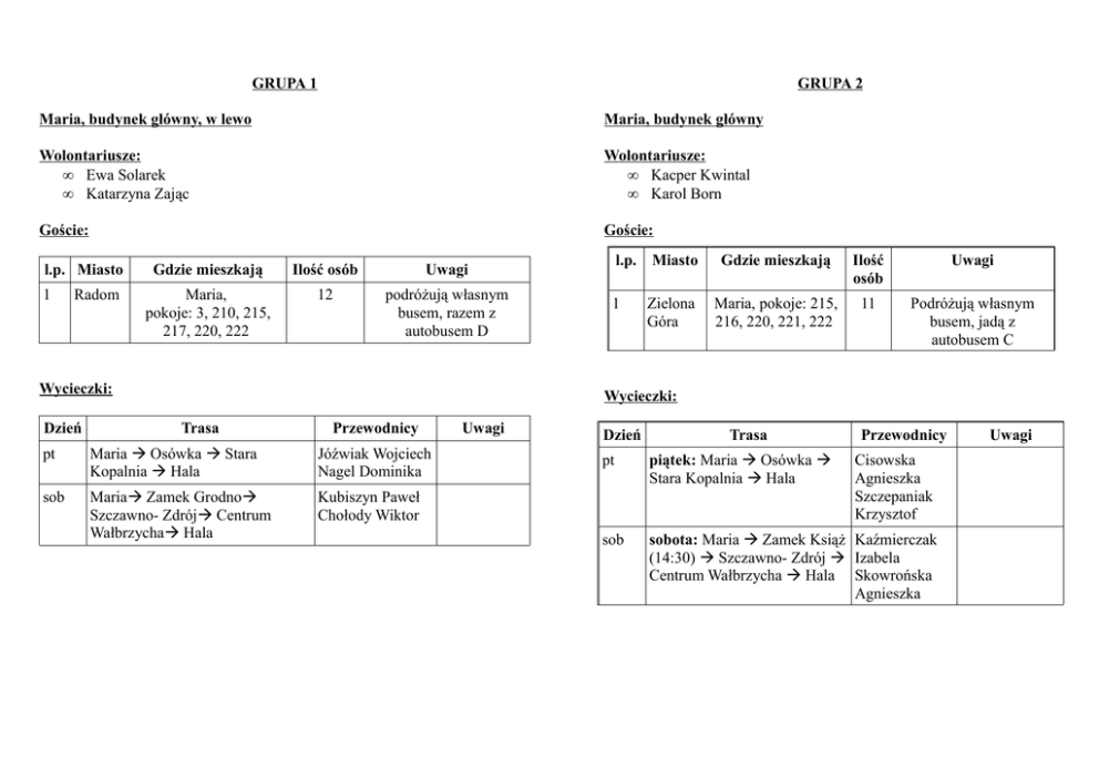 GRUPA 1 GRUPA 2 Maria, budynek główny, w lewo Maria, budynek główny Wolontariusze: • Ewa Solarek • Katarzyna Zając Wolontariusze: • Kacper Kwintal • Karol Born Goście: Goście: l.p. Miasto 1 Radom Gdzie mieszkają Ilość osób Uwagi Maria, pokoje: 3, 210, 215, 217, 220, 222 12 podróżują własnym busem, razem z autobusem D Wycieczki: Dzień l.p. Miasto 1 Zielona Góra Gdzie mieszkają Ilość osób Uwagi Maria, pokoje: 215, 216, 220, 221, 222 11 Podróżują własnym busem, jadą z autobusem C Wycieczki: Trasa Przewodnicy pt Maria Osówka Stara Kopalnia Hala Jóźwiak Wojciech Nagel Dominika sob Maria Zamek Grodno Szczawno- Zdrój Centrum Wałbrzycha Hala Kubiszyn Paweł Chołody Wiktor Uwagi Dzień Trasa Przewodnicy pt piątek: Maria Osówka Stara Kopalnia Hala sob sobota: Maria Zamek Książ Kaźmierczak (14:30) Szczawno- Zdrój Izabela Centrum Wałbrzycha Hala Skowrońska Agnieszka Cisowska Agnieszka Szczepaniak Krzysztof Uwagi GRUPA 3 GRUPA 4 Mokrzeszów Mokrzeszów Wolontariusze: • Patrycja Majerska • Sylwia Lichwa Wolontariusze: • Edyta Bojor • Adam Pogorzelski Goście: Goście: l.p. 1 Miasto Gdzie mieszkają Ilość osób Białystok Mokrzeszów 8 Uwagi l.p. podróżują własnym busem, jadą z MOK B Wycieczki: Dzień 1 Miasto Kraków Gdzie mieszkają Ilość osób Mokrzeszów 10 Uwagi podróżują własnym bbusem, jadą z MOK A Wycieczki: Trasa Przewodnicy pt Mokrzeszów Stara Kopalnia Centrum Wałbrzycha Hala Żak Jolanta Czerwenka Michał sob Mokrzeszów Świdnica Szczawno- Zdrój Hala Dudkiewicz Tomasz Krawczyk Adam Uwagi Dzień Trasa Przewodnicy pt Mokrzeszów Stara Kopalnia Centrum Wałbrzycha Hala Skiba Małgorzata Serafinowski Bartłomiej sob Mokrzeszów Palmiarnia Jedlinka (16:15) Hala Kłos Agata Piotrowska Ewelina Uwagi GRUPA 5 GRUPA 6 Mokrzeszów, autobus MOK B Mokrzeszów, MOK B Wolontariusze: • Barbara Brzozowska • Magdalena Kornacka Wolontariusze: • Aleksandra Misek • Aleksandra Ludwikowska Goście: Goście: l.p. 1 2 Miasto Gdzie mieszkają Ilość osób Biała Podlaska Mokrzeszów 5 Poznań Mokrzeszów l.p. Uwagi Gdzie mieszkają Ilość osób 1 Rzeszów Mokrzeszów 11 2 Skierniewice Mokrzeszów 11 Uwagi 14 Wycieczki: Wycieczki: Dzień Miasto Trasa Przewodnicy Uwagi Dzień Trasa Przewodnicy pt Mokrzeszów Stara Kopalnia Centrum Wałbrzycha Hala Żak Jolanta Czerwenka Michał pt Mokrzeszów Stara Kopalnia Centrum Wałbrzycha Hala Żak Jolanta Czerwenka Michał sob Mokrzeszów Świdnica Szczawno- Zdrój Hala Dudkiewicz Tomasz Krawczyk Adam sob Mokrzeszów Świdnica Szczawno- Zdrój Hala Dudkiewicz Tomasz Krawczyk Adam Uwagi GRUPA 7 GRUPA 8 Mokrzeszów, Autokar MOK A Mokrzeszów, MOK A Wolontariusze: • Paulina Suma • Paula Nowak Wolontariusze: • Monika Wojtas • Anna Zawada Goście: Goście: l.p. Miasto Gdzie mieszkają Ilość osób Uwagi l.p. Miasto Gdzie mieszkają Ilość osób 1 Siedlce Mokrzeszów 10 1 Tarnobrzeg Mokrzeszów 11 2 Swarzędz Mokrzeszów 11 2 Tczew Mokrzeszów 10 Wycieczki: Dzień Uwagi Wycieczki: Trasa Przewodnicy Uwagi Dzień Trasa Przewodnicy pt Mokrzeszów Stara Kopalnia Centrum Wałbrzycha Hala Skiba Małgorzata Serafinowski Bartłomiej pt Mokrzeszów Stara Kopalnia Centrum Wałbrzycha Hala Skiba Małgorzata Serafinowski Bartłomiej sob Mokrzeszów Palmiarnia Jedlinka (16:15) Hala Kłos Agata Piotrowska Ewelina sob Mokrzeszów Palmiarnia Jedlinka (16:15) Hala Kłos Agata Piotrowska Ewelina Uwagi GRUPA 9 MARIA, budynek główny w lewo, autobus F GRUPA 10 Maria, budynek główny, w prawo, Domek, autokar E Wolontariusze: • Patrycja Bińkowska • Wojtek Brosig Wolontariusze: • Natalia Mierzejewska • Sara Stefaniak • Magda Wesołowska • Jarek Pacek Goście: l.p. Miasto Goście: l.p. Gdzie mieszkają/ pokoje Ilość osób 1 Trzebinia 4, 4d 2 2 Augustów 119,12 3 3 Strzelce Opolskie 116,12 2 4 Zabrze 112,12 2 5 Rawa Mazowiecka 5, 9, 212, 215, 217 10 6 Elbląg 4, 4a, 4b, 4d, 4e 9 7 Pisz Starostwo 4, 4a, 4c, 211 5 8 Głogów 115, 117, 119, 121 9 Uwagi Miasto Gdzie mieszkają Ilość osób 211, 31, 30, 35, 26, 36, 38 12 31,35 5 70, 72, 46 3 1 Ostróda Starostwo 2 Zgierz 3 Olsztyn + Olsztyn Urząd Marsz. 4 Września 71,72 3 5 Prudnik 70,73 3 6 Opole 73,74 3 Uwagi Wycieczki: Wycieczki: Dzień Trasa Przewodnicy Uwagi Dzień Trasa Przewodnicy pt Maria Szczawno- Zdrój Stara Kopalnia Centrum Wałbrzycha Hala Olczyk Katarzyna Sachs Agnieszka pt Maria Centrum Wałbrzycha Stara Kopalnia Hala Białas Magdalena Woźniak Marta Młyńczyk Katarzyna sob Maria Zamek Grodno Palmiarnia Hala Koper Katarzyna Kufojanis Dominika Puszka Justyna sob Maria Jedlinka (14:30) Centrum Wałbrzycha Hala Mazurek Monika Nawrocka Marta Uwagi GRUPA 12 GRUPA 13 Maria, budynek główny, na wprost, autokar E Maria, Marysieńka, autokar C Wolontariusze: • Monika Szymańska Wolontariusze: • Kinga Ćmikiewicz • Magdalena Kowalska Goście: Goście: l.p. Miasto Gdzie mieszkają Ilość osób Uwagi Miasto Gdzie mieszkają Ilość osób 1 Dobrzeń Wielki 51,52 2 2 2 Gdynia 50, 51, 56 9 11,12 2 3 Legnica 9 13, 14, 40 3 54, 55, 57, 58, 59 Przemyśl 13,14 2 7 Rumia 13,14 2 8 Sochaczew 13,14 2 1 Kamień Pomorski 11,12 2 2 Kępno 46,47 2 3 Kluczbork 11,12 4 Myślenice 5 Pisz Miasto 6 Uwagi Wycieczki: Wycieczki: Dzień l.p. Trasa Przewodnicy Uwagi Dzień Trasa Przewodnicy pt Maria Centrum Wałbrzycha Stara Kopalnia Hala Białas Magdalena Woźniak Marta Młyńczyk Katarzyna pt Maria Osówka Stara Kopalnia Hala sob Maria Jedlinka (14:30) Centrum Wałbrzycha Hala Mazurek Monika Nawrocka Marta sob Maria Zamek Książ (14:30) Kaźmierczak Izabela Szczawno- Zdrój Centrum Skowrońska Wałbrzycha Hala Agnieszka Cisowska Agnieszka Szczepaniak Krzysztof Uwagi GRUPA 14 RUPA 15 Maria, Marysieńka A, Marysieńka, Autokar C Maria, Osiemdziesiątki, kierowcy budynek główny, autokar D Wolontariusze: • Małgorzata Łachmacka Wolontariusze: • Justyna Pawłowska Goście: Goście: l.p. Miasto l.p. Ilość osób 53, 54, 60, 61, 62 10 1 Dębica 2 Częstochowa 1