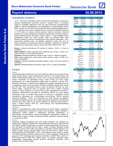 Biuro Maklerskie Deutsche Bank Polska Raport dzienny 30.06.2015 WIADOMOŚCI ZE ŚWIATA Rynki Wczoraj po wszystkich rynkach przeszła fala wyprzedaży ryzykownych Deutsche Bank Polska S.A. aktywów spowodowana zerwaniem rozmów w sprawie Grecji, co otworzyło drogę do możliwego ogłoszenia przez ten kraj technicznej niewypłacalności (władze w Atenach zapowiedziały, że przypadająca na dzisiaj płatność wobec MFW w kwocie 1,6 mld EUR nie zostanie dokonana). Indeks Stoxx600 spadł o -2,7%, głównie przez mocno taniejące banki w eurolandzie. S&P500 obniżył się o -2,1% także za sprawą mocnej przeceny branży finansowej. Ucieczka inwestorów w stronę bezpiecznych aktywów spowodowała umocnienie długu w Stanach Zjednoczonych, Niemczech, Anglii i Japonii. Z kolei obligacje krajów peryferyjnych strefy euro mocno spadły. Zniżki cen dotknęły także rynek towarowy, głównie surowców energetycznych (ropa naftowa zniżkowała o -2%), nieznacznie podrożało złoto. Na giełdach azjatyckich doszło dziś rano do odbicia indeksów po wczorajszych mocnych spadkach, zmienność na chińskich indeksach jest nadal bardzo wysoka, jednak dziś indeks CSI300 rósł o +5%. Indeks Wartość Zmiana Obrót (m ln zł) WIG20 mWIG40 sWIG80 WIG 2 291,23 -1,82% 503,48 3 687,82 -1,70% 91,96 12 869,38 -1,43% 39,84 52 905,49 Największe wzrosty -1,73% Kurs 654,27 Zmiana DSS 0,26 zł +52.94% BIOTON 6,32 zł +21.07% CORMAY 2,07 zł Kurs +7.81% Zmiana Największe spadki QUERCUS 6,79 zł -9.47% EKOEXPORT 12,51 zł -9.28% KERDOS Najaktywniejsi 1,04 zł Kurs Obrót (m ln zł) PZU 430,55 zł 102,43 PKOBP 30,75 zł 100,38 KGHM 107,45 zł Wartość 63,59 Zmiana S&P500 2 057,64 -2,09% DJIA 17 596,35 -1,95% Nasdaq 4 958,47 -2,40% Xetra DAX 11 083,20 -3,56% CAC 40 4 869,82 -3,74% FTSE 100 6 620,48 -1,97% Bovespa 53 014,21 -1,86% Hang Seng 26 316,95 +1,40% +0,60% Niemcy: Inflacja konsumencka CPI wzrosła w czerwcu +0,3% r/r, mniej od oczekiwań. Wielka Brytania: Podaż pieniądza M4 zwiększyła się w maju o +0,5% m/m, wobec wzrostu o +0,4% miesiąc wcześniej. Hiszpania: Sprzedaż detaliczna wzrosła w maju +3,4% r/r, słabiej od prognoz. USA: Indeks podpisanych umów kupna domów wzrósł w maju o +0,9% m/m, mniej od oczekiwań. Japonia: Produkcja sprzedana przemysłu spadła w maju -2,2% m/m, gorzej od oczekiwań. Japonia: Sprzedaż detaliczna wzrosła w maju +3,0% r/r, lepiej od oczekiwań. Indeksy światowe a Nikkei 20 235,73 Chiny_ A-Shares 4 463,29 +5,10% Surowce Cena Zmiana Ropa Brent 61,97 -1,92% Ropa WTI 58,23 -2,36% Złoto 1 178,40 +0,32% +0,12% POLSKA Giełda Warszawska giełda podobnie jak inne rynki światowe znalazły się wczoraj pod silną presją podaży akcji po fiasku weekendowych rozmów co do dalszej pomocy dla Grecji. Indeks WIG20 spadał rano o ponad -3,5%, co jak się okazało później było dobrym momentem do zajmowania pozycji. Puste karnety po stronie kupna spowodowały, że w wielu przypadkach spółki traciły na wartości o ponad -10%, ponieważ inwestorzy w obawie przed pogłębieniem spadków powstrzymywali się ze składaniem zleceń po stronie popytu. Dobrym przykładem takiego stanu rzeczy jest PKO BP, które zanotowało poranny dołek na poziomie 29 PLN, po czym istotnie odbiło i zakończyło dzień na poziomie 30,75 PLN (-2,38%). Poprawa sytuacji na wielu spółkach to w sporej mierze efekt napływajacych informacji o gotowości przedstawicieli wierzycieli do wznowienia rozmów ze stroną grecką (inwestorzy uznali, że istnieje wciąż szansa na zawarcie w najbliższym czasie przynajmniej czasowego tzw. pomostowego porozumienia). WIG20 skończył notowania spadkiem -1,82%, co w porównaniu ze skalą przeceny na giełdach zachodnioeuropejskich (ponad -3%) należy potraktować pozytywnie. Wskaźnikowi naszych blue chips udało się też obronić wsparcie na poziomie 2250 punktów i dojść w okolice poziomu 2300 pkt., wokół którego dziś najprawdopodobniej odbywać się będzie handel. Obligacje Zgodnie z przewidywaniami polski dług podobnie jak innych krajów o podobnym ratingu inwestycyjnym doświadczył wczoraj silnej przeceny. Spadki dotknęły w największym stopniu papiery o najdłuższych terminach zapadalności, co doprowadziło do wystromienia krzywej dochodowości. Rentowności obligacji 5letnich poszły w górę o +9,1bps do poziomu 2,786%, natomiast 10-letnich wzrosły o +12,2bps do 3,370%. Waluty Notowania złotego pozostawały pod silną presją osłabiania się, podobnie jak polskie akcje i obligacje. Spadki PLN nie był jednak tak duże jak np. walut Rumunii czy Węgier. Analitycy argumentują, że presja na deprecjację złotówki utrzyma się, choć jej skala nie powinna być już duża z uwagi na solidne podstawy naszej gospodarki (wysoki wzrost PKB, niski deficyt na rachunku obrotów bieżacych czy bardzo wysokie rezerwy walutowe NBP). Dziś rano PLN traci do dolara -0,5%, ponieważ spada kurs EUR/USD o -0,6%, po wczorajszym silnym wybiciu o prawie +2% (efekt zamykania krótkich pozycji na euro). Frank szwajcarski utrzymuje się powyżej 4 PLN i wyceniany jest w porannym handlu na 4,0307 PLN, z kolei za 1 EUR trzeba płacić 4,1895 PLN. Należy dodać, że większej aprecjacji waluty szwajcarskiej przeszkodziła wczoraj poranna interwencja dokonana przez tamtejszy bank centralny (SNB). -8.77% Miedź 5 796,50 Srebro 15,74 -0,25% Waluty Kurs Zmiana EUR/USD 1,1236 +2,29% EUR/PLN 4,1898 +0,15% USD/PLN 3,7283 -2,05% CHF/PLN 4,0273 -0,48% GBP/PLN 5,8666 -1,78% Rentowności obligacji 10-letnich Zmiana Polska 3.355 USA 2.3260 -6.07% Niemcy 0.796 -13.76% Hiszpania 2.333 +10.26% Włochy 2.368 +10.14% Grecja 14.671 +35.09% Turcja 9.180 +0.44% Japonia 0.445 -7.29% Chiny 3.634 +0.11% Indie 7.891 +0.91% +3.49% WIG WIG (54,034.66, 54,160.75, 53,115.11, 53,203.70, -730.332) 58000 57500 57000 56500 56000 55500 55000 54500 54000 53500 53000 52500 52000 51500 51000 50500 50000 49500 49000 16 23 30 7 July 14 21 28 4 11 18 August 25 1 8 15 September 22 29 6 13 Octobe