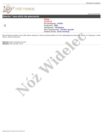 Informacje o produkcie Utworzono 06-03-2017 Blacha "non-stick do pieczenia Cena : 23,25 zł Nr katalogowy : 87851 Producent : SNB Dostępność : Dostępny Stan magazynowy : bardzo wysoki Średnia ocena : brak recenzji le c Blacha Polskiej produkcji, firmy SNB. Blacha wykonana z blachy pokrytej powłoką non stick zapobiegającą przywieraniu potraw. To tradycyjne i trwałe blachy, idalne do pieczenia N óż W id e Materiał: blacha z powłoką non-stick Wymiary: dł 31 cm/ szer. 27 cm Wygenerowano w programie www.oscGold.com