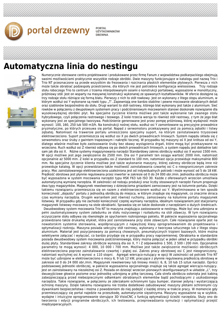 Automatyczna linia do nestingu Numerycznie sterowane centra projektowane i produkowane przez firmę Fanum z województwa podkarpackiego obejmują swoimi możliwościami praktycznie wszystkie rodzaje obróbki. Dwie maszyny funkcjonujące w katalogu pod nazwą Trio i Trio NT przeznaczone są przede wszystkim do frezowania i rozcinania płaskich elementów płytowych. Pierwsza z nich może także obrabiać podzespoły przestrzenne, dla których nie jest potrzebna konfiguracja wieloosiowa. Trzy rodzaje stołu roboczego Trio to centrum z trzema interpolowanymi osiami o konstrukcji portalowej, wyposażone w monolityczny, próżniowy stół. Jest on wsparty na masywnej konstrukcji wykonanej ze spawanych kształtowników. W ofercie dostępne są trzy rodzaje stołu różniące się formą blatu. Pierwszy z nich to stół rowkowy. Jest on wykonany z litego stopu aluminium, w którym wzdłuż osi Y wykonane są rowki typu „T’. Zapewniają one bardzo stabilne i pewne mocowanie obrabianych detali oraz szablonów bezpośrednio do stołu. Drugi wariant to stół rastrowy, którego blat wykonany jest także z aluminium. Sieć rowków w połączeniu z dwupolowym systemem pracy i podciśnieniowym mocowaniem stanowi doskonałe rozwiązanie dla wysokowydajnej obróbki płyt. Na specjalne życzenie klienta możliwe jest także wykonanie tak zwanego stołu hybrydowego, czyli połączenia rastrowego i teowego. Z kolei trzecia wersja to również stół rastrowy, z tym że jego blat wykonany jest ze specjalnego tworzywa. Podciśnienie generowane jest przez pompę próżniową, której wydajność może wynosić: 100, 160, 250 lub 500 m3/h. Na konstrukcji nośnej stołu, wzdłuż osi Y zamontowane są precyzyjne prowadnice pryzmatyczne, po których przesuwa się portal. Napęd z serwomotoru przekazywany jest za pomocą zębatki i listwy zębatej. Natomiast na trawersie portalu umieszczono specjalny suport, na którym zainstalowano trzyosiowe elektrowrzeciono. Suport przemieszcza się wzdłuż osi X po dwóch prowadnicach liniowych. System napędu składa się z serwomotoru oraz śruby z gwintem trapezowym i nakrętki tocznej. W przypadku tej maszyny oś X jest krótsza od osi Y, dlatego właśnie możliwe było zastosowanie śruby bez obawy wystąpienia drgań, które mogą być przekazywane na wrzeciono. Ruch wzdłuż osi Z również odbywa się po dwóch prowadnicach liniowych, a system napędu jest dokładnie taki sam jak dla osi X. Różne systemy magazynowania narzędzi Standardowy zakres obróbczy wzdłuż osi X wynosi 1500 mm. W opcji możliwe jest jego zwiększenie do 2500 mm. Dla osi Y parametr ten osiąga wartość 2000 mm, natomiast opcjonalnie aż 5000 mm. Z kolei w przypadku osi Z standard to 100 mm, natomiast opcja przewiduje maksymalnie 800 mm. Na specjalne życzenie klienta możliwe jest także wykonanie maszyny, której zakresy obróbcze będą inne niż przewiduje katalog. W opcji przewidziano także możliwość zainstalowania czwartej osi C o nieograniczonym zakresie pracy. Moc zainstalowanego elektrowrzeciona uzależniona jest od indywidualnych potrzeb i może wynosić od 5 do 18 kW. Prędkość obrotowa jest płynnie regulowana przez inwerter w zakresie od 0 do 24 000 obr./min. Jednostka obróbcza może być wyposażona w system mocowania narzędzi typu HSK F63 lub ISO 30. Każde z oferowanych wrzecion umożliwia automatyczną wymianę narzędzia. W zależności od rodzaju produkcji oraz liczby stosowanych narzędzi Fanum proponuje dwa typy magazynków. Magazynek rewolwerowy z dziesięcioma gniazdami zamocowany jest na kolumnie portalu. Dzięki takiemu rozwiązaniu przemieszcza się on razem z elektrowrzecionem wzdłuż osi Y. Wyeliminowano w ten sposób konieczność „dojazdu” portalu z jednostką obróbczą do miejsca, w którym znajduje się magazynek, co znacznie skraca czas wymiany narzędzia. Drugim wariantem jest również ruchomy, zamocowany na kolumnie portalu magazynek listwowy. W przypadku gdy nie zachodzi konieczność częstej wymiany narzędzia, idealnym rozwiązaniem jest stacjonarny magazynek listwowy mocowany na stole obrabiarki. Sprawdza się on także doskonale z narzędziami o dużych średnicach. Dwuobwodowy system mocowania Trio NT to maszyna znajdująca zastosowanie w nestingu. Może być ona uzbrojona w pełni zautomatyzowany system załadunku ze stołu nożycowego i rozładunku na stół zdawczy. W tym rozwiązaniu oczyszczanie stołu odbywa się równolegle ze spychaniem rozkrojonego pakietu. W pakiecie wyposażenia opcjonalnego przewidziano także drukarkę etykiet, która jest zainstalowana przy stole zdawczym. Całe rozwiązanie oparte jest na nowatorskim systemie sterowania, współpracującym z najwyższej klasy oprogramowaniem do projektowania i optymalizacji rozkroju. Maszyna posiada sekcyjny stół rastrowy, wykonany z tworzywa sztucznego lub z litego stopu aluminium. Materiał jest pozycjonowany za pomocą chowanych, pneumatycznych trzpieni bazowych, które można selektywnie załączać i wyłączać, co bardzo przydaje się w przypadku pracy naprzemiennej. Obrabiarka w standardzie posiada dwuobwodowy system mocowania podciśnieniowego, który można połączyć w jeden układ w przypadku obróbki dużej płyty. Standardowe zakresy obróbcze wynoszą dla osi X, Y i Z odpowiednio 1 500, 2 500 i 200 mm. Opcjonalnie parametry te mogą wynosić: 4 000, 10 000 i 700 mm. Możliwe jest także zwiększenie możliwości obróbczych elektrowrzeciona poprzez zainstalowanie czwartej i piątej osi. Zakres pracy obrotowej osi C jest nieograniczony, natomiast wychylnej osi A wynosi ± 110 stopni. Agregat wiercąco-nutujący w opcji W zależności od potrzeb Trio NT może być uzbrojone w elektrowrzeciono o mocy 6, 9 lub 12 kW, pracujące z płynnie regulowaną prędkością obrotową w zakresie od 0 do 24 000 obr./min. Magazynek rewolwerowy lub liniowy mieści: 6, 8, 10 lub 15 sztuk narzędzi. Oprócz podstawowej jednostki obróbczej, w pakiecie wyposażenia op