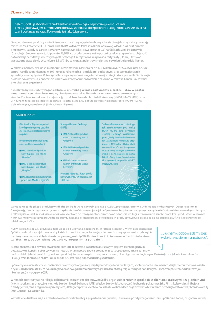 Dbamy o klientów Celem Spółki jest dostarczanie klientom wyrobów o jak najwyższej jakości. Zasadą przedsiębiorstwa jest terminowość dostaw, rzetelność i bezpośredni dialog. Firma zawsze płaci na czas i dostarcza na czas. Konkuruje też jakością serwisu. Dwa podstawowe produkty – miedź i srebro – charakteryzują się bardzo wysoką stabilną jakością. Katody zwierają minimum 99,99% czystej Cu. Oprócz nich KGHM wytwarza także miedzianą walcówkę, wlewki oraz drut z miedzi beztlenowej. Katody są zarejestrowane w najwyższym jakościowo gatunku „A” na Giełdach Metali w Londynie i Szanghaju. Srebro o zawartości powyżej 99,99% Ag produkowane jest w postaci gąsek oraz granulatu. Ich jakość potwierdzają certyfikaty światowych giełd. Srebro jest zarejestrowane i posiada certyfikaty „Dobrej Dostawy” wystawione przez giełdy w Londynie (LBMA) i Dubaju oraz zarejestrowane jest na nowojorskiej giełdzie Nymex. W zakresie odpowiedzialności za produkt przełomowym zdarzeniem dla KGHM Polska Miedź S.A. było przejęcie od central handlu zagranicznego w 1991 roku handlu miedzią i produktami pochodnymi oraz scentralizowanie sprzedaży w samej Spółce. W ten sposób zaczęła się budowa długoterminowej strategii, która pozwoliła Firmie wejść na nowe rynki zbytu, a jednocześnie umożliwiła zdobywanie doświadczeń zarówno w zakresie handlu, jak również produkcji oraz organizacji. Konsekwencją wysokich wymagań partnerów było wzbogacenie as or t y ment u o s r ebr o i oł ów w pos t aci met alicznej , r en i dr ut bezt lenowy . Zobligowało to także Firmę do zastosowania międzynarodowych standardów i – w konsekwencji – rejestrację marek handlowych dla miedzi katodowej (HMGB, HMGS, HML) poza Londynem, także na giełdzie w Szanghaju (rejestracja na LME odbyła się wcześniej) oraz srebra (KGHM HG) na giełdach międzynarodowych (LBMA, Dubai i Nymex). Wymagania co do jakości produktów i dbałość o środowisko naturalne spowodowały wprowadzenie norm ISO do oddziałów hutniczych. Obecnie normy te funkcjonują jako zintegrowany system zarządzania jakością obejmujący: jakość produktu, bezpieczeństwo pracy i zarządzanie środowiskiem naturalnym. Jednym z celów systemu jest zaspokojenie oczekiwań klienta co do transparentności zachowań odnośnie obsługi, utrzymywania jakości produkcji i produktów. W ramach norm ISO możliwe jest przeprowadzanie audytu klienckiego bezpośrednio w oddziałach produkcyjnych, co przekłada się na budowę zaufania kooperacyjnego udzielonego Spółce. KGHM Polska Miedź S.A. przykłada dużą wagę do budowania bezpośrednich relacji z klientami. W tym celu organizacja Spółki została tak zaprojektowana, aby każda istotna informacja docierająca do pojedynczego pracownika była szybko przekazywana do pozostałych struktur organizacyjnych Spółki. Dewiza, która jest stosowana wobec kontrahentów, to: "Sł uchamy , odpowiadamy bez zwł ok i, r eaguj emy na pot r zeby ". Istotne znaczenie ma również stworzenie klientom możliwości zapoznania się z całym ciągiem technologicznym, począwszy od kopalń, a skończywszy na hutach. W ten sposób Spółka pokazuje, że w sposób jawny i transparentny podchodzi do jakości produktu, poziomu produkcji i nowoczesnych rozwiązań stosowanych w ciągu technologicznym. Kształtuje to lojalność kontrahentów i buduje świadomość, że KGHM Polska Miedź S.A. jest firmą odpowiedzialną społecznie. Spółka czynnie uczestniczy w spotkaniach branżowych organizacji międzynarodowych oraz w targach, konferencjach i seminariach, dzięki czemu zdobywa wiedzę o rynku. Będąc uczestnikiem rynku międzynarodowego można zauważyć, jak bardzo istotną rolę w relacjach handlowych – zarówno po stronie odbiorców, jak i konkurentów – odgrywa CSR. W ramach podtrzymywania relacji z odbiorcami i otoczeniem biznesowym Spółka organizuje cor ocznie s pot k ania z k lient ami k r aj owy mi i zagr aniczny mi (w tym spotkania promocyjne w trakcie London Metal Exchange (LME) Week w Londynie). Jednocześnie chce się pokazywać jako Firma kultywująca i dbająca o tradycje związane z regionem i przemysłem, dlatego zaprasza klientów do udziału w obchodach organizowanych w ramach przedsiębiorstwa świąt branżowych, tj. Dnia Górnika i Dnia Hutnika. Wszystkie te działania mają na celu budowanie trwałych relacji z jej partnerami i rynkiem, utrwalanie pozytywnego wizerunku Spółki oraz dobrej, długoterminowej współpracy. Przyczyniają się również do ugruntowania pozycji marki KGHM Polska Miedź S.A. i jej produktów w kraju i na świecie.