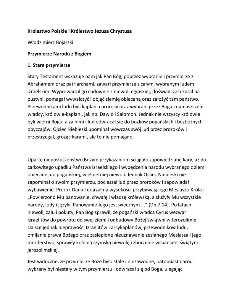 Królestwo Polskie i Królestwo Jezusa Chrystusa Włodzimierz Bojarski Przymierze Narodu z Bogiem 1. Stare przymierze Stary Testament wskazuje nam jak Pan Bóg, poprzez wybranie i przymierze z Abrahamem oraz patriarchami, zawarł przymierze z całym, wybranym ludem izraelskim. Wyprowadził go cudownie z niewoli egipskiej, doświadczał i karał na pustyni, pomagał wywalczyć i objąć ziemię obiecaną oraz założyć tam państwo. Przewodnikami ludu byli kapłani i prorocy oraz wybrani przez Boga i namaszczeni władcy, królowie-kapłani, jak np. Dawid i Salomon. Jednak nie wszyscy królowie byli wierni Bogu, a za nimi i lud odwracał się do bożków pogańskich i bezbożnych obyczajów. Ojciec Niebieski upominał wówczas swój lud przez proroków i przestrzegał, grożąc karami, ale to nie pomagało. Uparte nieposłuszeństwo Bożym przykazaniom ściągało zapowiedziane kary, aż do całkowitego upadku Państwa Izraelskiego i wypędzenia narodu wybranego z ziemi obiecanej do pogańskiej, wieloletniej niewoli. Jednak Ojciec Niebieski nie zapominał o swoim przymierzu, pocieszał lud przez proroków i zapowiadał wybawienie. Prorok Daniel dojrzał na wysokości przybywającego Mesjasza-Króla : „Powierzono Mu panowanie, chwałę i władzę królewską, a służyły Mu wszystkie narody, ludy i języki. Panowanie Jego jest wiecznym ...” (Dn.7,14). Po latach niewoli, żalu i pokuty, Pan Bóg sprawił, że pogański władca Cyrus wezwał Izraelitów do powrotu do swej ziemi i odbudowy Bożej świątyni w Jerozolimie. Dalsze jednak nieprawości Izraelitów i arcykapłanów, przewodników ludu, omijanie prawa Bożego oraz zaślepione nieuznawanie zesłanego Mesjasza i jego morderstwo, sprawiły kolejną rzymską niewolę i zburzenie wspaniałej świątyni jerozolimskiej. Jest widoczne, że przymierze Boże było stałe i niezawodne, natomiast naród wybrany był niestały w tym przymierzu i odwracał się od Boga, ulegając podszeptom szatańskim. Pan Bóg był miłosierny, ale i sprawiedliwy; upominał i karał srogo swoich wybranych. Ta historia biblijna jest dla nas cenną nauką, pozwalającą lepiej zrozumieć także historię naszego narodu oraz poznać, jak pokutą i przestrzeganiem prawa Bożego kształtować teraźniejszość i budować lepszą przyszłość. 2. Nowe przymierze Ojciec Niebieski zesłał Swego Syna, aby pełniej objawił Bożą moc i miłosierdzie oraz jeszcze bardziej przybliżył przymierze swoje z ludem wybranym, z tymi wszystkimi, którzy uwierzą i przyjmą Jego prawo oraz będą budowali Królestwo Boże. W niedzielę palmową lud jerozolimski wołał z entuzjazmem: „Błogosławiony Król, który przychodzi w imię Pańskie !” i słał swoje szaty pod Jego nogi (Łk.19,38). Pan Jezus nauczył nas codziennej modlitwy : „Ojcze nasz, który jesteś w niebie, święć się imię Twoje, przyjdź Królestwo Twoje ...”. A gdy faryzeusze zapytywali, Pana Jezusa kiedy przyjdzie to Królestwo Boże, odpowiedział im: „Królestwo Boże nie przyjdzie dostrzegalnie, ani nie powiedzą <Oto tu jest> albo <tam>. Oto bowiem Królestwo Boże jest pośród was.” (Łk.17,20-21).Wskazał więc, że ma ono charakter społeczny, a nie tylko indywidualny i wewnętrzny oraz że dotyczy nie tylko narodu wybranego, ale i innych narodów dotąd pogańskich: „Idźcie i nauczajcie wszystkie narody, ...”. Wprawdzie Królestwo Boże nie jest z tego świata, ale jest budowane na tym świecie. Apostołowie i rozproszeni wierni, Izraelici, Grecy i prozelici, co raz szerzej głosili tę naukę poganom. Dotarła ona wkrótce i do Rzymu, a Bóg okazał swe miłosierne wybranie także innym narodom. Rzymski cesarz Konstantyn 28.10.312 roku ujrzał wielki znak krzyża świętego i wskazanie, że w tym znaku zwycięży swoich przeciwników (In hoc signo vincis). Uwierzył i pod Saxa Ruba w walnej bitwie rozgromił pogańskie wojska Maksencjusza. Podjął wezwanie do przymierza swojego państwa i narodu z Bogiem, a jego matka, cesarzowa św. Helena poszukiwała w Jerozolimie i 14.09.326 roku odnalazła relikwię Krzyża Świętego. Uroczyste podwyższenie Krzyża Świętego stanowiło fundamentalny akt ugruntowania chrześcijaństwa i cesarstwa w Rzymie i Bizancjum oraz przybliżyło budowę Królestwa Bożego. Na przełomie VIII i IX wieku równie doniosłe było wielkie dzieło budowy uniwersalnego państwa chrześcijańskiego przez Karola Wielkiego, jego sojusz z Papieżem oraz liturgiczna koronacja w Rzymie na cesarza w 800 r. Ideę karolińską kontynuował cesarz Otto III, (przybywający w roku 1000 do Gniezna). W międzyczasie chrześcijaństwo dotarło i zagościło w państwie Wielkomorawskim, a następnie w Czechach, sięgając na Ruś i do księstwa Wiślan (Wiślica). Objawione Prawo Boże jest zapisane w jakiś sposób również w sumieniu i sercu każdego człowieka, stanowiąc także uniwersalne prawo natury. Dlatego uznanie i respektowanie tego prawa w życiu publicznym i państwowym oraz w życiu osobistym służy budowaniu uniwersalnego, trwałego ładu, sprawiedliwości i pokoju, budowaniu Królestwa Bożego Jezusa Chrystusa. 3. Przymierze z Polską Dzięki wielkiej łasce Bożej książę Polan Mieszko I, podejmując dzieło organizacji Państwa Polskiego, postanowił zbudować je na wieczystym, Bożym fundamencie. Za żonę wybrał chrześcijankę, czeską księżnę Dobrawę oraz w roku 966 poddał się prawu Bożemu i ochrzcił się z całym dworem i drużyną rycerską. Nadzwyczajnym dopełnieniem tego aktu było w 992 roku oddanie Polski pod protekcję Papieża (akt Dagome index). Jednak „Nie wyście mnie wybrali, ale Ja was wybrałem i przeznaczyłem was na to, abyście szli i owoc przynosili i by owoc wasz trwał ...” (J.15, 16). Mieszko I podjął to powołanie i zawarł wieczyste przymierze naszego Narodu z Bogiem. Mówiąc o Chrzcie Świętym trzeba wyraźnie odróżniać indywidualny chrzest poszczególnych osób, nie zmieniający istotnie stosu