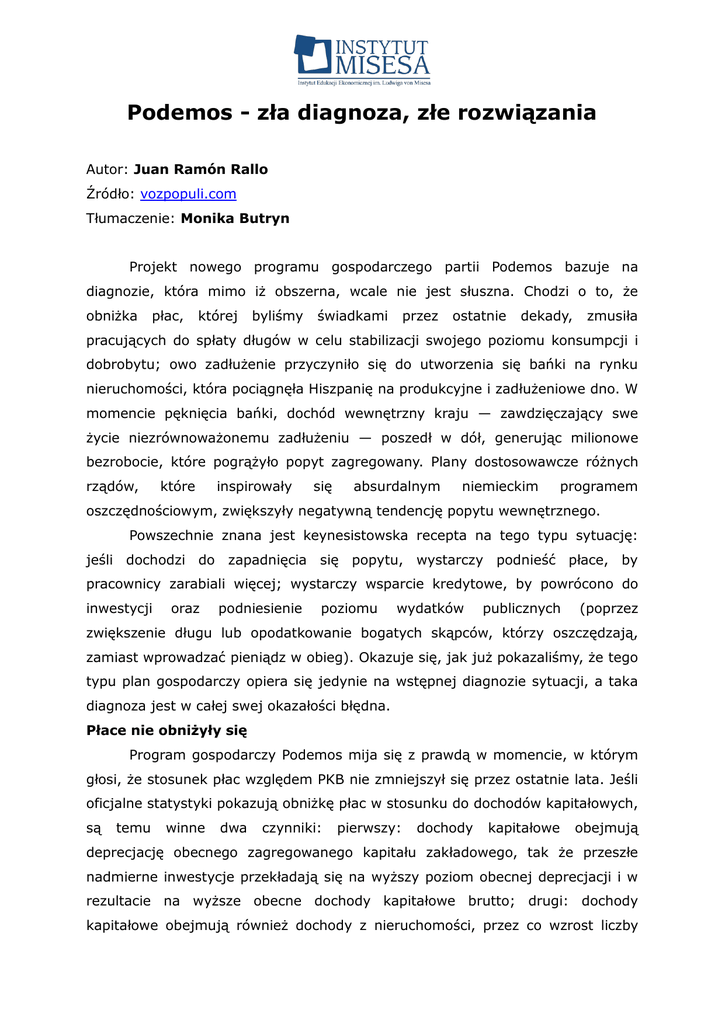 Podemos - zła diagnoza, złe rozwiązania Autor: Juan Ramón Rallo Źródło: vozpopuli.com Tłumaczenie: Monika Butryn Projekt nowego programu gospodarczego partii Podemos bazuje na diagnozie, która mimo iż obszerna, wcale nie jest słuszna. Chodzi o to, że obniżka płac, której byliśmy świadkami przez ostatnie dekady, zmusiła pracujących do spłaty długów w celu stabilizacji swojego poziomu konsumpcji i dobrobytu; owo zadłużenie przyczyniło się do utworzenia się bańki na rynku nieruchomości, która pociągnęła Hiszpanię na produkcyjne i zadłużeniowe dno. W momencie pęknięcia bańki, dochód wewnętrzny kraju — zawdzięczający swe życie niezrównoważonemu zadłużeniu — poszedł w dół, generując milionowe bezrobocie, które pogrążyło popyt zagregowany. Plany dostosowawcze różnych rządów, które inspirowały się absurdalnym niemieckim programem oszczędnościowym, zwiększyły negatywną tendencję popytu wewnętrznego. Powszechnie znana jest keynesistowska recepta na tego typu sytuację: jeśli dochodzi do zapadnięcia się popytu, wystarczy podnieść płace, by pracownicy zarabiali więcej; wystarczy wsparcie kredytowe, by powrócono do inwestycji oraz podniesienie poziomu wydatków publicznych (poprzez zwiększenie długu lub opodatkowanie bogatych skąpców, którzy oszczędzają, zamiast wprowadzać pieniądz w obieg). Okazuje się, jak już pokazaliśmy, że tego typu plan gospodarczy opiera się jedynie na wstępnej diagnozie sytuacji, a taka diagnoza jest w całej swej okazałości błędna. Płace nie obniżyły się Program gospodarczy Podemos mija się z prawdą w momencie, w którym głosi, że stosunek płac względem PKB nie zmniejszył się przez ostatnie lata. Jeśli oficjalne statystyki pokazują obniżkę płac w stosunku do dochodów kapitałowych, są temu winne dwa czynniki: pierwszy: dochody kapitałowe obejmują deprecjację obecnego zagregowanego kapitału zakładowego, tak że przeszłe nadmierne inwestycje przekładają się na wyższy poziom obecnej deprecjacji i w rezultacie na wyższe obecne dochody kapitałowe brutto; drugi: dochody kapitałowe obejmują również dochody z nieruchomości, przez co wzrost liczby mieszkań własnościowych generuje widoczny wzrost dochodów kapitałowych. Podsumowując, dane nie pokazują powiększającej się pauperyzacji pracowników na rzecz kapitalistów, lecz efekt boomu kredytowego skierowanego na spłacenie rosnących inwestycji w dobra kapitałowe i nieruchomości. W rzeczywistości średnie płace realne wzrosły nieznacznie między 2001 a 2007 rokiem: według rocznego badania kosztu pracy oscylowały pomiędzy wartościami nominalnymi rzędu 16 561 euro rocznie a 20 246 euro (a więc między wartościami realnymi rzędu 20 088 euro a 20 246 euro). Płace nie tworzą długów ani baniek W odcięciu od ewolucji, jaką przeszły płace, należy jasno podkreślić, że nie mają one żadnego związku z tworzeniem się baniek mieszkaniowych. Może miałoby jakiś sens łączenie z niskimi płacami apogeum zadłużeniowego skierowanego na stabilizację poziomu bieżącej konsumpcji — ale nie, jeśli dług został w większości wykorzystany w celu nabywania mieszkań. A mieszkanie to trwałe dobro konsumpcyjne, które znakomita większość mieszkańców nabywa drogą kredytu, bez względu na poziom wzrostu ich płac. A czy jeśli płace realne w latach 2001—2007 zwiększyłyby się o 20%, Hiszpanie zrezygnowaliby z hipotek (czy to ze względu na to, że przestali marzyć o własnym domu, czy na to, że mogliby go kupić bez konieczności zadłużenia się)? Nie, oczywiście, że nie: najwyższe z płac prawdopodobnie jeszcze zwiększyłyby rozmiar bańki mieszkaniowej (a banki mogłyby z jeszcze większą ochotą udzielać kredytów). Podobnie, nawet przyjmując, że niskie płace wygenerowałyby większy popyt na kredyty u obywateli — jeśli oferta kredytowa byłaby tak surowa, jak być powinna — ów niepohamowanego, większy taniego popyt kredytowy zadłużenia. Wobec nie tego przybrałby ostateczna postaci przyczyna ekspansywności kredytowej wynika z naszego nikczemnie zorganizowanego systemu finansowego, któremu przewodzi państwowy monopol, znany jako bank centralny. W żadnym wypadku geneza naszego boomu kredytowego nie wiąże się ze zmianą w zakresie płac: one nie tylko nie obniżyły się, a nawet lekko wzrosły, a poza tym popyt na nieruchomości nie ma nigdy związku z poziomem płac. Powodem naszego boomu kredytowego była sztuczna redukcja stóp procentowych zapoczątkowana w 2001 roku przez Rezerwę Federalną USA do spółki z Europejskim Bankiem Centralnym — to ta ingerencja w wysokość prowizji kredytowych popchnęła rodziny i firmy w kierunku zadłużenia i zniekształciła naszą strukturę produkcji. Krach popytu to krach podaży Zrzucanie naszych obecnych problemów na popyt zagregowany będący konsekwencją pęknięcia bańki kredytowej to kolejny błąd. To tylko powierzchowna prawda: było tak, że wydatki całkowite w gospodarce spadały za każdym razem, gdy ludzie przestawali zadłużać się w celu nabycia mieszkania. Lecz należy patrzeć głębiej niż tylko na powierzchnię — całkowity popyt w gospodarce to nic innego jak jej aktualna podaż (kiedy płacimy gotówką) lub jej przyszła podaż (gdy płacimy kredytem). To znaczy — jeśli chcemy czegoś dziś, to musimy dać coś w zamian dziś (zapłatę gotówką) lub jutro (kredytem). Hiszpańska gospodarka funkcjonowała do 2007 roku, utrzymując swój ówczesny popyt za pomocą podaży z przyszłości — mówiąc dokładniej, wydawaliśmy pieniądze w teraźniejszości, zadłużając się względem zagranicy, ręcząc jej, że zamortyzujemy dług za pomocą bardzo dużej przyszłej produkcji. Sęk w tym, że im więcej wydawaliśmy na kredyt, tym bardziej zniekształcaliśmy nasz model produkcji (dokładając kolejne cegiełki do budowy bańki) i stawaliśmy się mniej z