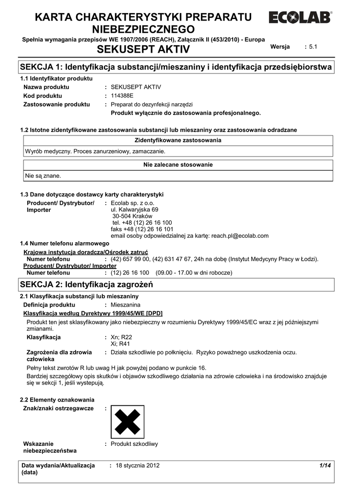karta charakterystyki preparatu niebezpiecznego - Ecolab