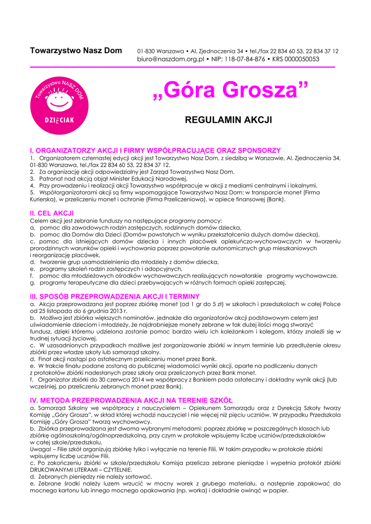 Towarzystwo Nasz Dom 01-830 Warszawa • Al. Zjednoczenia 34 • tel./fax 22 834 60 53, 22 834 37 12 [email protected] • NIP: 118-07-84-876 • KRS 0000050053 ▬▬▬▬▬▬▬▬▬▬▬▬▬▬▬▬▬▬▬▬▬▬▬▬▬▬▬▬▬▬▬▬▬▬▬▬▬▬▬▬▬▬▬▬▬▬▬▬▬ „Góra Grosza” REGULAMIN AKCJI I. ORGANIZATORZY AKCJI I FIRMY WSPÓŁPRACUJĄCE ORAZ SPONSORZY 1. Organizatorem czternastej edycji akcji jest Towarzystwo Nasz Dom, z siedzibą w Warszawie, Al. Zjednoczenia 34, 01-830 Warszawa, tel./fax 22 834 60 53, 22 834 37 12. 2. Za organizację akcji odpowiedzialny jest Zarząd Towarzystwa Nasz Dom. 3. Patronat nad akcją objął Minister Edukacji Narodowej. 4. Przy prowadzeniu i realizacji akcji Towarzystwo współpracuje w akcji z mediami centralnymi i lokalnymi. 5. Współorganizatorami akcji są firmy wspomagające Towarzystwo Nasz Dom: w transporcie monet (Firma Kurierska), w przeliczeniu monet i ochronie (Firma Przeliczeniowa), w opiece finansowej (Bank). II. CEL AKCJI Celem akcji jest zebranie funduszy na następujące programy pomocy: a. pomoc dla zawodowych rodzin zastępczych, rodzinnych domów dziecka, b. pomoc dla Domów dla Dzieci (Domów powstałych w wyniku przekształcenia dużych domów dziecka), c. pomoc dla istniejących domów dziecka i innych placówek opiekuńczo-wychowawczych w tworzeniu prorodzinnych warunków opieki i wychowania poprzez powołanie autonomicznych grup mieszkaniowych i reorganizację placówek, d. tworzenie grup usamodzielnienia dla młodzieży z domów dziecka, e. programy szkoleń rodzin zastępczych i adopcyjnych, f. pomoc dla młodzieżowych ośrodków wychowawczych realizujących nowatorskie programy wychowawcze, g. programy terapeutyczne dla dzieci przebywających w różnych formach opieki zastępczej. III. SPOSÓB PRZEPROWADZENIA AKCJI I TERMINY a. Akcja przeprowadzana jest poprzez zbiórkę monet (od 1 gr do 5 zł) w szkołach i przedszkolach w całej Polsce od 25 listopada do 6 grudnia 2013 r. b. Możliwa jest zbiórka większych nominałów, jednakże dla organizatorów akcji podstawowym celem jest uświadomienie dzieciom i młodzieży, że najdrobniejsze monety zebrane w tak dużej ilości mogą stworzyć fundusz, dzięki któremu udzielona zostanie pomoc bardzo wielu ich koleżankom i kolegom, którzy znaleźli się w trudnej sytuacji życiowej. c. W uzasadnionych przypadkach możliwe jest zorganizowanie zbiórki w innym terminie lub przedłużenie okresu zbiórki przez władze szkoły lub samorząd szkolny. d. Finał akcji nastąpi po ostatecznym przeliczeniu monet przez Bank. e. W trakcie finału podane zostaną do publicznej wiadomości wyniki akcji, oparte na podliczeniu danych z protokołów zbiórki nadesłanych przez szkoły oraz przeliczonych przez Bank monet. f. Organizator zbiórki do 30 czerwca 2014 we współpracy z Bankiem poda ostateczny i dokładny wynik akcji (lub wcześniej, po przeliczeniu zebranych monet przez Bank). IV. METODA PRZEPROWADZENIA AKCJI NA TERENIE SZKÓŁ a. Samorząd Szkolny we współpracy z nauczycielem – Opiekunem Samorządu oraz z Dyrekcją Szkoły tworzy Komisję „Góry Grosza”, w skład której wchodzi nauczyciel i nie więcej niż pięciu uczniów. W przypadku Przedszkola Komisję „Góry Grosza” tworzą wychowawcy. b. Zbiórka przeprowadzana jest dwoma wybranymi metodami: poprzez zbiórkę w poszczególnych klasach lub zbiórkę ogólnoszkolną/ogólnoprzedszkolną, przy czym w protokole wpisujemy liczbę uczniów/przedszkolaków w całej szkole/przedszkolu. Uwaga! – Filie szkół organizują zbiórkę tylko i wyłącznie na terenie Filii. W takim przypadku w protokole zbiórki wpisujemy liczbę uczniów Filii. c. Po zakończeniu zbiórki w szkole/przedszkolu Komisja przelicza zebrane pieniądze i wypełnia protokół zbiórki DRUKOWANYMI LITERAMI – CZYTELNIE. d. Zebranych pieniędzy nie należy sortować. e. Zebrane środki należy luzem wrzucić w mocny worek z grubego materiału, a następnie zapakować do mocnego kartonu lub innego mocnego opakowania (np. worka) i dokładnie owinąć w papier. f. Nie należy pakować pieniędzy w rulony, torebki plastikowe, szkło itp. g. Pojedyncza paczka nie powinna przekraczać 20 kg. W przypadku zebrania większej ilości monet należy zapakować dwie lub więcej paczek i dołączyć do tego oddzielny protokół. h. Paczkę wysyłamy bezpłatnie za pośrednictwem wskazanej przez Towarzystwo Nasz Dom firmy kurierskiej, która dostarcza paczki bezpośrednio do firmy przeliczeniowej (paczki mogą być wysyłane pocztą tylko na koszt szkoły/przedszkola). i. Oryginał Protokółu Zbiórki należy przesłać pocztą na adres: Towarzystwo Nasz Dom, Al. Zjednoczenia 34, 01-830 Warszawa, kopię protokołu należy włożyć do paczki, zgodnie z załączoną instrukcją pakowania. j. Po zapakowaniu monet należy na każdej paczce nakleić dołączony do pakietu list przewozowy i uzupełnić go wpisując adres szkoły, następnie zadzwonić na podany numer telefonu firmy przewozowej, a kurier odbierze od Państwa paczkę z monetami (dokładna procedura powiadamiania kurierów w załączonej instrukcji). W celu usprawnienia akcji, szkoły sąsiadujące ze sobą lub oddalone (np. filie) mogą umówić się z firmą przewozową na odbiór paczek z monetami w jednej wytypowanej szkole, gdzie np. z kilku szkół w okolicy zostaną one zgromadzone. Firma przewozowa od stycznia 2014 przewozi paczki z monetami w ramach akcji „Góra Grosza” nie pobierając opłat! Dlatego prosimy Państwa o sprawne przeprowadzenie akcji. k. W przypadku zespołów szkół prosimy o rozliczenie każdej szkoły osobno lub zaznaczenie, że rozliczenie dotyczy całego zespołu! l. Nadzór społeczny nad akcją pełnią zaproszeni przedstawiciele mediów. V. ROZLICZENIE AKCJI I POTWIERDZENIA UCZESTNICTWA W AKCJI. Ze względu na ogromną liczbę uczestników akcji Towarzystwo Nasz Dom rozlicza się z nimi w następujący sposób: a. po
