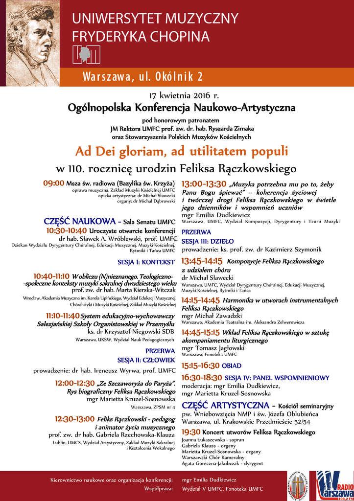UNIWERSYTET MUZYCZNY FRYDERYKA CHOPINA Wa r s z aw a , u l. O kó l n i k 2 17 kwietnia 2016 r. Ogólnopolska Konferencja Naukowo-Artystyczna pod honorowym patronatem JM Rektora UMFC prof. zw. dr. hab. Ryszarda Zimaka oraz Stowarzyszenia Polskich Muzyków Kościelnych Ad Dei gloriam, ad utilitatem populi w 110. rocznicę urodzin Feliksa Rączkowskiego 09:00 Msza św. radiowa (Bazylika św. Krzyża) 13:00-13:30 „Muzyka potrzebna mu po to, żeby oprawa muzyczna: Zakład Muzyki Kościelnej UMFC opieka artystyczna: dr Michał Sławecki organy: dr Michał Dąbrowski CZĘŚĆ NAUKOWA - Sala Senatu UMFC 10:30-10:40 Uroczyste otwarcie konferencji Panu Bogu śpiewać” – koherencja życiowej i twórczej drogi Feliksa Rączkowskiego w świetle jego dzienników i wspomnień uczniów mgr Emilia Dudkiewicz Warszawa, UMFC, Wydział Kompozycji, Dyrygentury i Teorii Muzyki PRZERWA dr hab. Sławek A. Wróblewski, prof. UMFC SESJA III: DZIEŁO Dziekan Wydziału Dyrygentury Chóralnej, Edukacji Muzycznej, Muzyki Kościelnej, Rytmiki i Tańca UMFC prowadzenie: ks. prof. zw. dr Kazimierz Szymonik SESJA I: KONTEKST 10:40-11:10 W obliczu (N)nieznanego. Teologiczno- -społeczne konteksty muzyki sakralnej dwudziestego wieku prof. zw. dr hab. Marta Kierska-Witczak Wrocław, Akademia Muzyczna im. Karola Lipińskiego, Wydział Edukacji Muzycznej, Chóralistyki i Muzyki Kościelnej, Zakład Muzyki Kościelnej 13:45-14:15 Kompozycje Feliksa Rączkowskiego z udziałem chóru dr Michał Sławecki Warszawa, UMFC, Wydział Dyrygentury Chóralnej, Edukacji Muzycznej, Muzyki Kościelnej, Rytmiki i Tańca 14:15-14:45 Harmonika w utworach instrumentalnych Feliksa Rączkowskiego 11:10-11:40 System edukacyjno-wychowawczy mgr Michał Zawadzki Salezjańskiej Szkoły Organistowskiej w Przemyślu Warszawa, Akademia Teatralna im. Aleksandra Zelwerowicza ks. dr Krzysztof Niegowski SDB 14:45-15:15 Wkład Feliksa Rączkowskiego w sztukę Warszawa, UKSW, Wydział Nauk Pedagogicznych akompaniamentu liturgicznego mgr Tomasz Jagłowski PRZERWA Warszawa, Fonoteka UMFC SESJA II: CZŁOWIEK 15:15-16:30 OBIAD prowadzenie: dr hab. Ireneusz Wyrwa, prof. UMFC 16:30-18:30 SESJA IV: PANEL WSPOMNIENIOWY 12:00-12:30 „Ze Szczaworyża do Paryża”. moderacja: mgr Emilia Dudkiewicz, Rys biograficzny Feliksa Rączkowskiego mgr Marietta Kruzel-Sosnowska mgr Marietta Kruzel-Sosnowska Warszawa, ZPSM nr 4 CZĘŚĆ ARTYSTYCZNA - Kościół seminaryjny pw. Wniebowzięcia NMP i św. Józefa Oblubieńca 12:30-13:00 Feliks Rączkowski - pedagog Warszawa, ul. Krakowskie Przedmieście 52/54 i animator życia muzycznego prof. zw. dr hab. Gabriela Rzechowska-Klauza 19:30 Koncert utworów Feliksa Rączkowskiego Lublin, UMCS, Wydział Artystyczny, Zakład Muzyki Sakralnej i Kształcenia Wokalnego Kierownictwo naukowe oraz organizacja konferencji: Współpraca: Joanna Łukaszewska - sopran Gabriela Klauza - organy Marietta Kruzel-Sosnowska - organy Warszawski Chór Kameralny Agata Góreczna-Jakubczak - dyrygent mgr Emilia Dudkiewicz Wydział V UMFC, Fonoteka UMFC wstęp wolny – zapraszamy