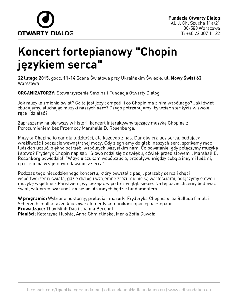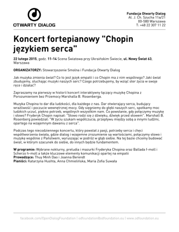Fundacja Otwarty Dialog Al. J. Ch. Szucha 11a/21 00-580 Warszawa T: +48 22 307 11 22 Koncert fortepianowy "Chopin językiem serca" 22 lutego 2015, godz. 11-14 Scena Światowa przy Ukraińskim Świecie, ul. Nowy Świat 63, Warszawa ORGANIZATORZY: Stowarzyszenie Smolna i Fundacja Otwarty Dialog Jak muzyka zmienia świat? Co to jest język empatii i co Chopin ma z nim wspólnego? Jaki świat zbudujemy, słuchając muzyki naszych serc? Czego potrzebujemy, by wziąć ster życia w swoje ręce i działać? Zapraszamy na pierwszy w historii koncert interaktywny łączący muzykę Chopina z Porozumieniem bez Przemocy Marshalla B. Rosenberga. Muzyka Chopina to dar dla ludzkości, dla każdego z nas. Dar otwierający serca, budujący wrażliwość i poczucie wewnętrznej mocy. Gdy sięgniemy do głębi naszych serc, spotkamy moc ludzkich uczuć, piękno potrzeb, wspólnych wszystkim nam. Co powstanie, gdy połączymy muzykę i słowo? Fryderyk Chopin napisał: "Słowo rodzi się z dźwięku, dźwięk przed słowem". Marshall B. Rosenberg powiedział: "W życiu szukam współczucia, przepływu między sobą a innymi ludźmi, opartego na wzajemnym dawaniu z serca". Podczas tego niecodziennego koncertu, który powstał z pasji, potrzeby serca i chęci współtworzenia świata, gdzie dialog i wzajemne zrozumienie są wartościami, połączymy słowo i muzykę wspólnie z Państwem, wyruszając w podróż w głąb siebie. Na tej bazie chcemy budować świat, w którym szacunek do siebie, do innych będzie fundamentem. W programie: Wybrane nokturny, preludia i mazurki Fryderyka Chopina oraz Ballada f-moll i Scherzo h-moll a także kluczowe elementy komunikacji opartej na empatii Prowadzące: Thuy Minh Dao i Joanna Berendt Pianiści: Katarzyna Hushta, Anna Chmielińska, Maria Zofia Suwała facebook.com/OpenDialogFoundation | [email protected] | www.odfoundation.eu