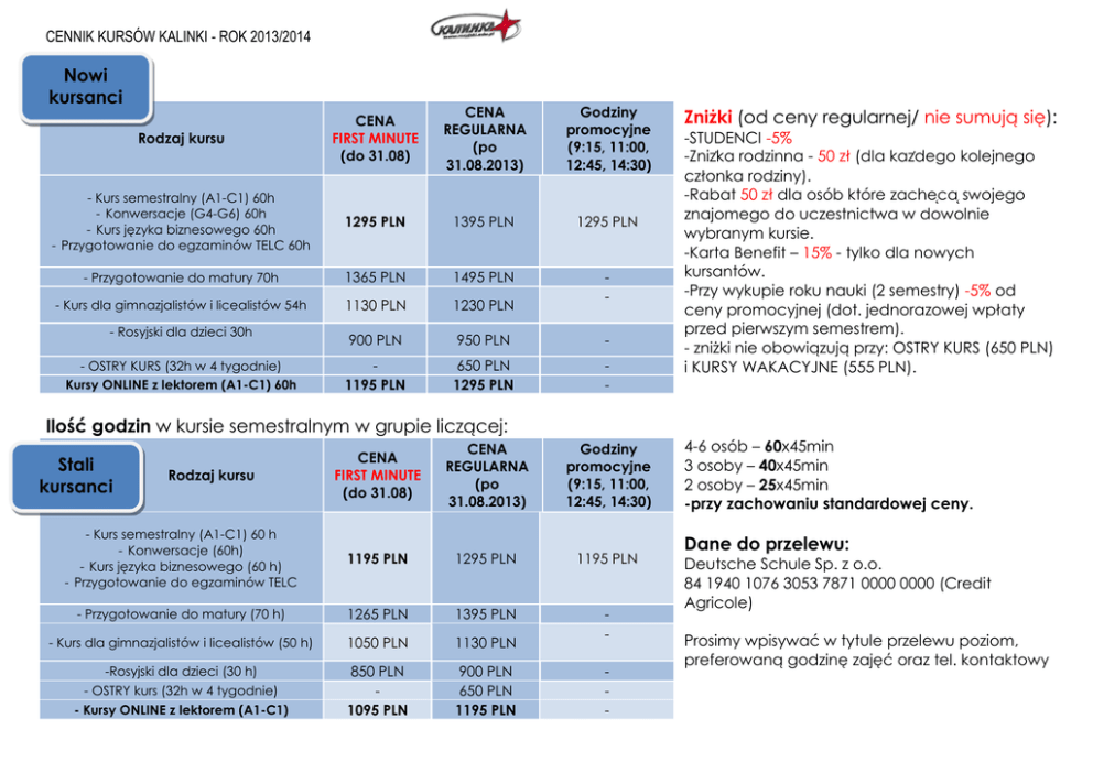 CENNIK KURSÓW KALINKI - ROK 2013/2014 Nowi kursanci Rodzaj kursu CENA FIRST MINUTE (do 31.08) CENA REGULARNA (po 31.08.2013) Godziny promocyjne (9:15, 11:00, 12:45, 14:30) - Kurs semestralny (A1-C1) 60h - Konwersacje (G4-G6) 60h - Kurs języka biznesowego 60h - Przygotowanie do egzaminów TELC 60h 1295 PLN 1395 PLN 1295 PLN - Przygotowanie do matury 70h 1365 PLN 1495 PLN - Kurs dla gimnazjalistów i licealistów 54h 1130 PLN 1230 PLN - 900 PLN 950 PLN - 1195 PLN 650 PLN 1295 PLN - - Rosyjski dla dzieci 30h - OSTRY KURS (32h w 4 tygodnie) Kursy ONLINE z lektorem (A1-C1) 60h Zniżki (od ceny regularnej/ nie sumują się): -STUDENCI -5% -Znizka rodzinna - 50 zł (dla kazdego kolejnego członka rodziny). -Rabat 50 zł dla osób które zacheca swojego znajomego do uczestnictwa w dowolnie wybranym kursie. -Karta Benefit – 15% - tylko dla nowych kursantów. -Przy wykupie roku nauki (2 semestry) -5% od ceny promocyjnej (dot. jednorazowej wpłaty przed pierwszym semestrem). - zniżki nie obowiązują przy: OSTRY KURS (650 PLN) i KURSY WAKACYJNE (555 PLN). Ilość godzin w kursie semestralnym w grupie liczącej: CENA FIRST MINUTE (do 31.08) CENA REGULARNA (po 31.08.2013) Godziny promocyjne (9:15, 11:00, 12:45, 14:30) - Kurs semestralny (A1-C1) 60 h - Konwersacje (60h) - Kurs języka biznesowego (60 h) - Przygotowanie do egzaminów TELC 1195 PLN 1295 PLN 1195 PLN - Przygotowanie do matury (70 h) 1265 PLN 1395 PLN - Kurs dla gimnazjalistów i licealistów (50 h) 1050 PLN 1130 PLN - -Rosyjski dla dzieci (30 h) 850 PLN 1095 PLN 900 PLN 650 PLN 1195 PLN Stali kursanci Rodzaj kursu - OSTRY kurs (32h w 4 tygodnie) - Kursy ONLINE z lektorem (A1-C1) - 4-6 osób – 60x45min 3 osoby – 40x45min 2 osoby – 25x45min -przy zachowaniu standardowej ceny. Dane do przelewu: Deutsche Schule Sp. z o.o. 84 1940 1076 3053 7871 0000 0000 (Credit Agricole) Prosimy wpisywać w tytule przelewu poziom, preferowaną godzinę zajęć oraz tel. kontaktowy