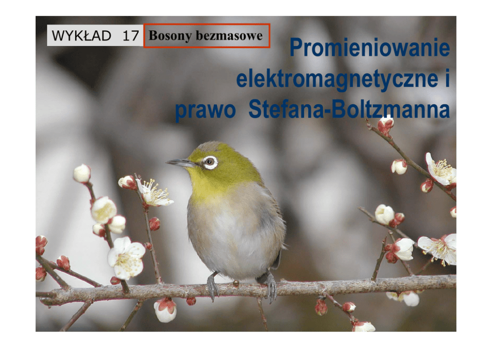 WYKŁAD 17 Promieniowanie elektromagnetyczne i prawo Stefana-Boltzmanna 1 • • • • • Relacje dyspersji dla fotonów Gęstość stanów Energia swobodna, średnia energia, średnia liczba fotonów i jej fluktuacja Rozkład energii po częstościach i długościach fal Ciśnienie, entropia i ciepło właściwe 2 • Wszystkie ciała, dla T>0, emitują promieniowanie elektromagnetyczne skutkiem wzbudzeń termicznych ładunków w pobliżu powierzchni; • Rozważmy wnękę w materiale podgrzanym do temperatury T: • Atomy ścian wnęki bez przerwy emitują i absorbują promieniowanie; zakładamy równowagę pr. ze ściankami. • materiał jest doskonale czarny, tzn. nie wypuszcza promieniowania na zewnątrz. • W równowadze wnękę wypełnia promieniowanie, które jest gazem fotonów. • Częstości (energie) fotonów nie są ograniczone od góry jak mieliśmy dla fononów. 3 Będziemy brali pod uwagę jedynie część ‘ elektryczną ’ fali elektromagnetycznej jest ona kilka rzędów wielkości bardziej istotna niż część magnetyczna z każdym modem k związane są 2 mody poprzeczne. 4 Na poziomie kwantowomechanicznym (kwantowej teorii pola) takie fale elektromagnetyczne to w rzeczywistości Fotony – bezmasowe cząstki o spinie 1 ) Gęstość stanów: 2 ↔ 1; 2 5 6 ) Porównanie z modelem Debya 7 8 9 + Fizyka statystyczna pozwala wyliczyć parametr a we wzorze Stefana-Boltzmana 10 W tym celu musimy wprowadzić pojęcie rozkładu energii po częstościach i długościach fal Wyliczmy najpierw: - 11 dw Zadanie: wyznaczyć fluktuację liczby cząstek wokół <N> 12 Stąd U(T,V) = E(T,V) można zapisać jako 13 14 15 16 Prawo Plancka, czyli rozkład energii po długościach fal otrzymamy z zamieniając zmienne 17 18 Ciśnienie, entropia, ciepło właściwe 19 Promieniowanie elektromagnetyczne odpowiadające gazowi fotonowemu nazywa się także pr. cieplnym. 20 Związek między ciśnieniem, objętością i energią: 21 22