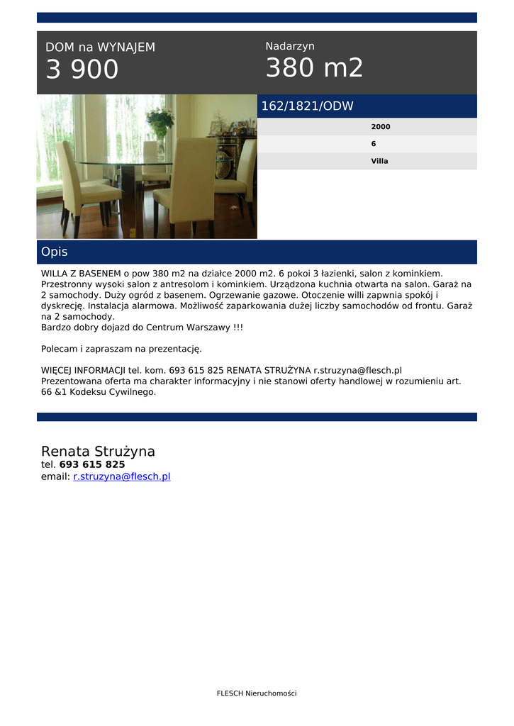 DOM na WYNAJEM 3 900 Nadarzyn 380 m2 162/1821/ODW 2000 6 Villa Opis WILLA Z BASENEM o pow 380 m2 na działce 2000 m2. 6 pokoi 3 łazienki, salon z kominkiem. Przestronny wysoki salon z antresolom i kominkiem. Urządzona kuchnia otwarta na salon. Garaż na 2 samochody. Duży ogród z basenem. Ogrzewanie gazowe. Otoczenie willi zapwnia spokój i dyskrecję. Instalacja alarmowa. Możliwość zaparkowania dużej liczby samochodów od frontu. Garaż na 2 samochody. Bardzo dobry dojazd do Centrum Warszawy !!! Polecam i zapraszam na prezentację. WIĘCEJ INFORMACJI tel. kom. 693 615 825 RENATA STRUŻYNA [email protected] Prezentowana oferta ma charakter informacyjny i nie stanowi oferty handlowej w rozumieniu art. 66 &1 Kodeksu Cywilnego. Renata Strużyna tel. 693 615 825 email: [email protected] FLESCH Nieruchomości Powered by TCPDF (www.tcpdf.org)