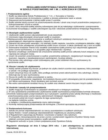 REGULAMIN KORZYSTANIA Z SZAFEK SZKOLNYCH W SZKOLE PODSTAWOWEJ NR 1 IM. J. KORCZAKA W CZERSKU I. Postanowienia ogólne 1. Szafki są własnością Szkoły Podstawowej nr 1 im. J. Korczaka w Czersku. 2. Uczeń nabywa prawo do korzystania z szafek w okresie pobierania nauki w szkole. 3. Dopuszcza się korzystanie z jednej szafki przez 2 uczniów. 4. Szafki szkolne służą uczniom do przechowywania obuwia i ubrań oraz innych przedmiotów związanych z funkcjonowaniem ucznia w szkole. 5. Uczeń, który otrzymał szafkę szkolną zobowiązany jest do jej należytego użytkowania i poszanowania. 6.Uczniowie korzystający z szafek zobowiązani są znać i stosować postanowienia niniejszego Regulaminu. II. Obowiązki użytkowników szafek 1. Użytkownik szafki ponosi odpowiedzialność za jej zawartość. 2. Uczniowie mają obowiązek utrzymywać szafki w czystości. 3.Niedopuszczalne jest przechowywanie w szafkach szkolnych substancji chemicznych, np. wytwarzających nieprzyjemne zapachy, żrących, itp. 4. Zabrania się dokonywać wewnątrz i na zewnątrz szafki napisów, rysunków, przyklejania plakatów, zdjęć. 5. Uczeń nie może udostępniać przydzielonej szafki innym uczniom, a także zamieniać się z nimi na szafki. 6. Ewentualne kradzieże mienia oraz wszelkie uszkodzenia szafki powinny być natychmiast zgłaszane przez ucznia wychowawcy, a w przypadku jego nieobecności -Dyrekcji. 7. Sprawca umyślnego uszkodzenia lub zniszczenia szkolnej szafki ponosi całkowity koszt związany z jej naprawą lub zakupem nowej. 8. Uczeń nie powinien przechowywać w szafce: przedmiotów szklanych, niezjedzonych kanapek i innej żywności, napojów z niezabezpieczonym zamknięciem, brudnej odzieży. 9. Pod koniec roku szkolnego uczeń zobowiązany jest, przed oddaniem klucza wychowawcy do opróżnienia szafki. III. Klucze i zasady ich użytkowania 1. Każdy zamek posiada trzy klucze: po jednym do użytku dwóch uczniów oraz zapasowy, który pozostaje w szkole i nie podlega wydawaniu. 2. Uczeń otrzymuje klucz do szafki, który podlega zwrotowi przed zakończeniem roku szkolnego. Zwrotu dokonuje się na ręce wychowawcy. 3. Klucza do szafki nie należy pozostawiać w zamku. 3. W przypadku zniszczenia, zagubienia lub kradzieży klucza uczeń zobowiązany jest do powiadomienia o tym fakcie wychowawcę. Klucz dorabiany jest na koszt ucznia. 4. Nie wolno samodzielnie dorabiać kluczy do szafek oraz otwierać swoim kluczem innych szafek. IV. Kontrole i zasady ich przeprowadzania 1. Szafki mogą być kontrolowane na zasadach określonych w niniejszym rozdziale. 2. W celu sprawdzenia prawidłowości użytkowania szafek wychowawca przeprowadza kontrole okresowe. 3.Kontrole nadzwyczajne przeprowadzane są w sytuacjach: uzyskania przez szkołę informacji o możliwości przechowywania przez ucznia rzeczy zabronionych niniejszym regulaminem, - na wniosek policji lub innych organów do tego uprawnionych, - na żądanie rodziców ucznia, - w związku z możliwością popełnienia czynu zabronionego. 5. Kontrolę nadzwyczajną przeprowadza sie komisyjnie. Z kontroli sporządza się protokół. V. Postanowienia końcowe 1. Szkoła nie ponosi odpowiedzialności za rzeczy pozostawiane w szafkach szkolnych. 2. Każdy Rodzic i Uczeń podpisuje odpowiedzialność majatkową za używaną szafkę. 3. Z Regulaminem zapoznają się Rodzice i Uczniowie w każdym roku szkolnym. 4. W przypadku niewywiązywania się przez ucznia z postanowień regulaminu Dyrektor Szkoły może odebrać uczniowi prawo korzystania z szafki szkolnej. 5. Regulamin wchodzi w życie z dniem podpisania przez Dyrektora Szkoły. Regulamin obowiązuje od dnia 5 lutego 2014 roku internetowej. Czersk, 05.02.2014 rok i jest udostępniony na szkolnej stronie Dyrektor Szkoły