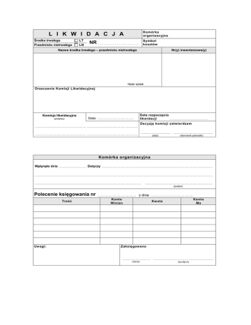 Komórka organizacyjna L I K W I D A C J A Środka trwałego Przedmiotu nietrwałego LT LN Symbol kosztów NR . . . . . . . . . . . . . . . . . . . . . . Nazwa środka trwałego – przedmiotu nietrwałego Nr(y) inwentarzowe(y) Ilość sztuk . . . . . . . . . . Orzeczenie Komisji Likwidacyjnej Komisja likwidacyjna (podpisy) Data rozpoczęcia likwidacji ..................................... Data: ........................................... Decyzję komisji zatwierdzam ............................................................. ............................................................. ................................... ............................................................. ............................................................. (data) ............................................... (kierownik jednostki) Komórka organizacyjna Wpłynęło dnia ................................. Dotyczy ..................................................................................................................................... ..................................................................................................................................................................................................................... ............................................................................................................................... ................................................................................. (podpis) Polecenie księgowania nr Treść Uwagi: .............................................. z dnia Konto Winien .................................................... Kwota Konto Ma Zaksięgowano ........................... (data) .......................................................... ( podpis)