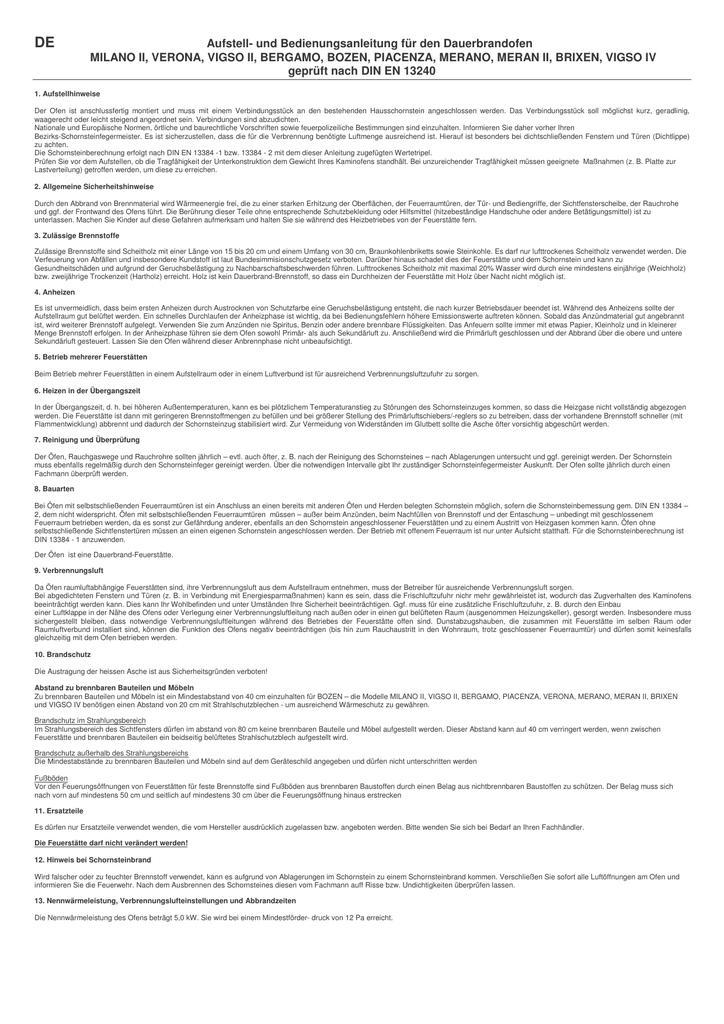 DE Aufstell- und Bedienungsanleitung für den Dauerbrandofen MILANO II, VERONA, VIGSO II, BERGAMO, BOZEN, PIACENZA, MERANO, MERAN II, BRIXEN, VIGSO IV geprüft nach DIN EN 13240 1. Aufstellhinweise Der Ofen ist anschlussfertig montiert und muss mit einem Verbindungsstück an den bestehenden Hausschornstein angeschlossen werden. Das Verbindungsstück soll möglichst kurz, geradlinig, waagerecht oder leicht steigend angeordnet sein. Verbindungen sind abzudichten. Nationale und Europäische Normen, örtliche und baurechtliche Vorschriften sowie feuerpolizeiliche Bestimmungen sind einzuhalten. Informieren Sie daher vorher Ihren Bezirks-Schornsteinfegermeister. Es ist sicherzustellen, dass die für die Verbrennung benötigte Luftmenge ausreichend ist. Hierauf ist besonders bei dichtschließenden Fenstern und Türen (Dichtlippe) zu achten. Die Schornsteinberechnung erfolgt nach DIN EN 13384 -1 bzw. 13384 - 2 mit dem dieser Anleitung zugefügten Wertetripel. Prüfen Sie vor dem Aufstellen, ob die Tragfähigkeit der Unterkonstruktion dem Gewicht Ihres Kaminofens standhält. Bei unzureichender Tragfähigkeit müssen geeignete Maßnahmen (z. B. Platte zur Lastverteilung) getroffen werden, um diese zu erreichen. 2. Allgemeine Sicherheitshinweise Durch den Abbrand von Brennmaterial wird Wärmeenergie frei, die zu einer starken Erhitzung der Oberflächen, der Feuerraumtüren, der Tür- und Bediengriffe, der Sichtfensterscheibe, der Rauchrohe und ggf. der Frontwand des Ofens führt. Die Berührung dieser Teile ohne entsprechende Schutzbekleidung oder Hilfsmittel (hitzebeständige Handschuhe oder andere Betätigungsmittel) ist zu unterlassen. Machen Sie Kinder auf diese Gefahren aufmerksam und halten Sie sie während des Heizbetriebes von der Feuerstätte fern. 3. Zulässige Brennstoffe Zulässige Brennstoffe sind Scheitholz mit einer Länge von 15 bis 20 cm und einem Umfang von 30 cm, Braunkohlenbriketts sowie Steinkohle. Es darf nur lufttrockenes Scheitholz verwendet werden. Die Verfeuerung von Abfällen und insbesondere Kundstoff ist laut Bundesimmisionschutzgesetz verboten. Darüber hinaus schadet dies der Feuerstätte und dem Schornstein und kann zu Gesundheitschäden und aufgrund der Geruchsbelästigung zu Nachbarschaftsbeschwerden führen. Lufttrockenes Scheitholz mit maximal 20% Wasser wird durch eine mindestens einjährige (Weichholz) bzw. zweijährige Trockenzeit (Hartholz) erreicht. Holz ist kein Dauerbrand-Brennstoff, so dass ein Durchheizen der Feuerstätte mit Holz über Nacht nicht möglich ist. 4. Anheizen Es ist unvermeidlich, dass beim ersten Anheizen durch Austrocknen von Schutzfarbe eine Geruchsbelästigung entsteht, die nach kurzer Betriebsdauer beendet ist. Während des Anheizens sollte der Aufstellraum gut belüftet werden. Ein schnelles Durchlaufen der Anheizphase ist wichtig, da bei Bedienungsfehlern höhere Emissionswerte auftreten können. Sobald das Anzündmaterial gut angebrannt ist, wird weiterer Brennstoff aufgelegt. Verwenden Sie zum Anzünden nie Spiritus, Benzin oder andere brennbare Flüssigkeiten. Das Anfeuern sollte immer mit etwas Papier, Kleinholz und in kleinerer Menge Brennstoff erfolgen. In der Anheizphase führen sie dem Ofen sowohl Primär- als auch Sekundärluft zu. Anschließend wird die Primärluft geschlossen und der Abbrand über die obere und untere Sekundärluft gesteuert. Lassen Sie den Ofen während dieser Anbrennphase nicht unbeaufsichtigt. 5. Betrieb mehrerer Feuerstätten Beim Betrieb mehrer Feuerstätten in einem Aufstellraum oder in einem Luftverbund ist für ausreichend Verbrennungsluftzufuhr zu sorgen. 6. Heizen in der Übergangszeit In der Übergangszeit, d. h. bei höheren Außentemperaturen, kann es bei plötzlichem Temperaturanstieg zu Störungen des Schornsteinzuges kommen, so dass die Heizgase nicht vollständig abgezogen werden. Die Feuerstätte ist dann mit geringeren Brennstoffmengen zu befüllen und bei größerer Stellung des Primärluftschiebers/-reglers so zu betreiben, dass der vorhandene Brennstoff schneller (mit Flammentwicklung) abbrennt und dadurch der Schornsteinzug stabilisiert wird. Zur Vermeidung von Widerständen im Glutbett sollte die Asche öfter vorsichtig abgeschürt werden. 7. Reinigung und Überprüfung Der Öfen, Rauchgaswege und Rauchrohre sollten jährlich – evtl. auch öfter, z. B. nach der Reinigung des Schornsteines – nach Ablagerungen untersucht und ggf. gereinigt werden. Der Schornstein muss ebenfalls regelmäßig durch den Schornsteinfeger gereinigt werden. Über die notwendigen Intervalle gibt Ihr zuständiger Schornsteinfegermeister Auskunft. Der Ofen sollte jährlich durch einen Fachmann überprüft werden. 8. Bauarten Bei Öfen mit selbstschließenden Feuerraumtüren ist ein Anschluss an einen bereits mit anderen Öfen und Herden belegten Schornstein möglich, sofern die Schornsteinbemessung gem. DIN EN 13384 – 2, dem nicht widerspricht. Öfen mit selbstschließenden Feuerraumtüren müssen – außer beim Anzünden, beim Nachfüllen von Brennstoff und der Entaschung – unbedingt mit geschlossenem Feuerraum betrieben werden, da es sonst zur Gefährdung anderer, ebenfalls an den Schornstein angeschlossener Feuerstätten und zu einem Austritt von Heizgasen kommen kann. Öfen ohne selbstschließende Sichtfenstertüren müssen an einen eigenen Schornstein angeschlossen werden. Der Betrieb mit offenem Feuerraum ist nur unter Aufsicht statthaft. Für die Schornsteinberechnung ist DIN 13384 - 1 anzuwenden. Der Öfen ist eine Dauerbrand-Feuerstätte. 9. Verbrennungsluft Da Öfen raumluftabhängige Feuerstätten sind, ihre Verbrennungsluft aus dem Aufstellraum entnehmen, muss der Betreiber für ausreichende Verbrennungsluft sorgen. Bei abgedichteten Fenstern und Türen (z. B. in Verbindung mit Energiesparmaßnahmen) kann es sein, dass die Frischluftzufuhr nichr mehr gewährleistet ist, wodurch das Zugverhalten des Kaminofens beeinträchtigt werden kann. Dies kann Ihr Wohlbefinden und unter Umständen Ihr