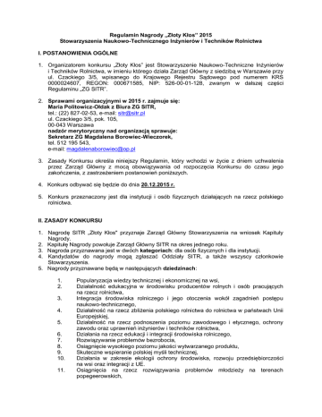 Regulamin Nagrody „Złoty Kłos” 2015 Stowarzyszenia Naukowo-Technicznego Inżynierów i Techników Rolnictwa I. POSTANOWIENIA OGÓLNE 1. Organizatorem konkursu „Złoty Kłos” jest Stowarzyszenie Naukowo-Techniczne Inżynierów i Techników Rolnictwa, w imieniu którego działa Zarząd Główny z siedzibą w Warszawie przy ul. Czackiego 3/5, wpisanego do Krajowego Rejestru Sądowego pod numerem KRS 0000024607, REGON: 000671585, NIP: 526-00-01-128, zwanym w dalszej części Regulaminu „ZG SITR”. 2. Sprawami organizacyjnymi w 2015 r. zajmuje się: Maria Politowicz-Ołdak z Biura ZG SITR, tel.: (22) 827-02-53, e-mail: [email protected] ul. Czackiego 3/5, pok. 105, 00-043 Warszawa nadzór merytoryczny nad organizacją sprawuje: Sekretarz ZG Magdalena Borowiec-Wieczorek, tel. 512 195 543, e-mail: [email protected] 3. Zasady Konkursu określa niniejszy Regulamin, który wchodzi w życie z dniem uchwalenia przez Zarząd Główny z mocą obowiązywania od rozpoczęcia Konkursu do czasu jego zakończenia, z zastrzeżeniem postanowień poniższych. 4. Konkurs odbywać się będzie do dnia 20.12.2015 r. 5. Konkurs przeznaczony jest dla instytucji i osób fizycznych działających na rzecz polskiego rolnictwa. II. ZASADY KONKURSU 1. Nagrodę SITR „Złoty Kłos" przyznaje Zarząd Główny Stowarzyszenia na wniosek Kapituły Nagrody. 2. Kapitułę Nagrody powołuje Zarząd Główny SITR na okres jednego roku. 3. Nagroda przyznawana jest w dwóch kategoriach: dla osób fizycznych i dla instytucji. 4. Kandydatów do nagrody mogą zgłaszać Oddziały SITR, a także wszyscy członkowie Stowarzyszenia. 5. Nagrody przyznawane będą w następujących dziedzinach: 1. 2. 3. 4. 5. 6. 7. 8. 9. 10. 11. Popularyzacja wiedzy technicznej i ekonomicznej na wsi, Działalność edukacyjna w środowisku producentów rolnych i osób pracujących na rzecz rolnictwa, Integracja środowiska rolniczego i jego otoczenia wokół zagadnień postępu naukowo-technicznego, Działalność na rzecz zbliżenia polskiego rolnictwa do rolnictwa w państwach Unii Europejskiej, Działalność na rzecz podnoszenia poziomu zawodowego i etycznego, ochrony zawodu oraz uprawnień inżynierów i techników rolnictwa, Działania na rzecz edukacji i integracji środowiska rolniczego, Rozwiązywanie problemów bezrobocia, Osiągnięcie wysokiego poziomu jakości wytwarzanego produktu, Skuteczne wspieranie polskiej myśli technicznej, Działania w zakresie ekologii ochrony środowiska, rozwoju przedsiębiorczości na wsi oraz integracji z UE. Osiągnięcia na rzecz rozwiązywania problemów młodzieży na terenach popegeerowskich, 12. 13. Upowszechnianie wiedzy naukowo-technicznej w środowisku młodzieży wiejskiej, Wieloletnia i aktywna praca zawodowa i społeczna w Stowarzyszeniu. 6. Warunkiem uczestnictwa w Konkursie jest złożenie poprawnie wypełnionego wniosku do siedziby SITR pocztą na adres: ZG SITR ul. Czackiego 3/5, 00-043 Warszawa z adnotacją „Konkurs – Złoty Kłos” 2015. 7. Termin składania wniosków upływa 30.11.2015 roku, przy czym o dochowaniu terminu decyduje data stempla pocztowego. 8. Wnioski niezgodne z Regulaminem lub oddane po terminie nie będą oceniane. 9. Z zastrzeżeniem poniższych postanowień niniejszego Regulaminu rozstrzygnięcie Konkursu nastąpi w terminie do dnia 20.12.2015 r. 10. Organizator zastrzega sobie prawo do zmiany terminu rozstrzygnięcia z uwagi na liczbę nadesłanych wniosków, o czym niezwłocznie poinformuje uczestników, publikując stosowną informację na stronie internetowej SITR. 11. Zwycięzcami w poszczególnych kategoriach zostaną osoby i instytucje, których wnioski zostaną najwyżej ocenione przez Kapitułę. 12. Wyniki zostaną opublikowane na stronie www.sitr.pl. 13. Nagrodzone osoby i instytucje zostaną poinformowane o wynikach drogą mailową lub telefonicznie. III. NAGRODY 1. Nagroda ma charakter honorowy, jej symbolicznym wymiarem jest rzeźba. 2. Organizator zastrzega sobie prawo do publikowania informacji o Zwycięzcach nagrody „Złoty Kłos” 2015 oraz osobach wyróżnionych na stronie internetowej www.sitr.pl, na co uczestnicy – przystępując do udziału w Konkursie – wyrażają zgodę. IV. POSTANOWIENIA KOŃCOWE 1. Decyzje Zarządu Głównego oraz Kapituły Nagrody mają charakter ostateczny i nie przysługuje od nich odwołanie. 2. Przystąpienie do udziału w Konkursie jest jednoznaczne z przyjęciem warunków niniejszego Regulaminu.