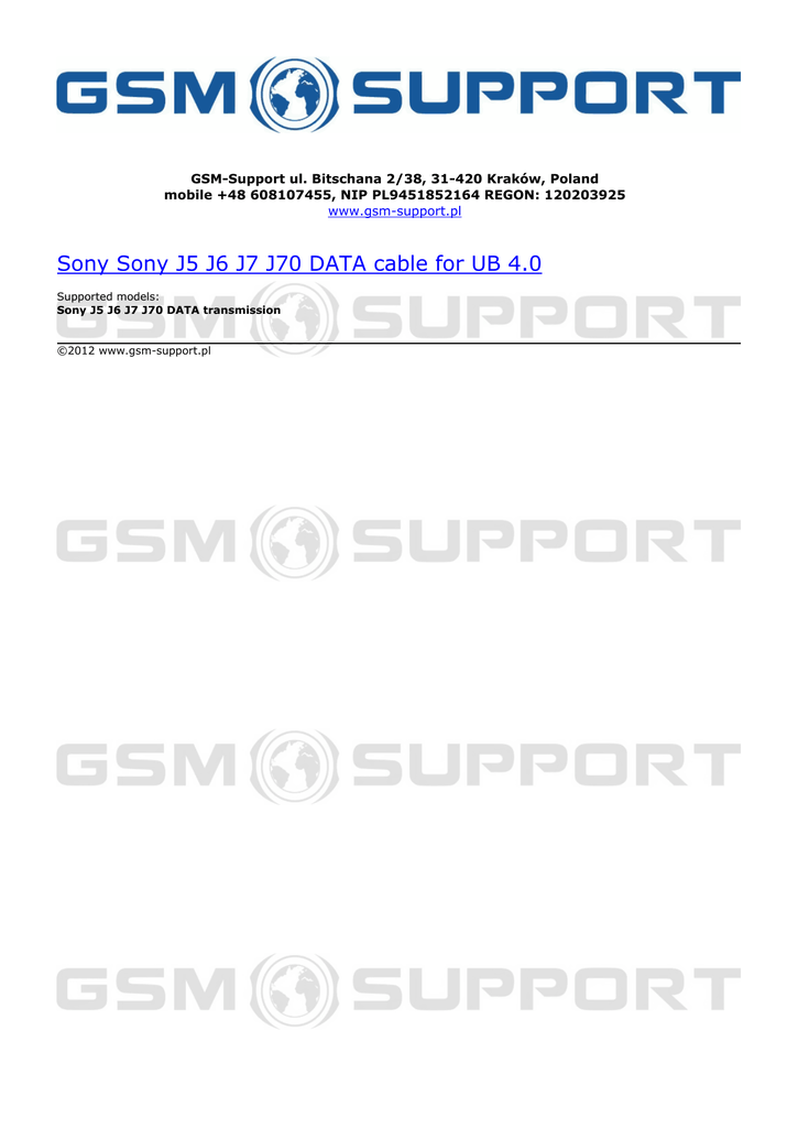 GSM-Support ul. Bitschana 2/38, 31-420 Kraków, Poland mobile +48 608107455, NIP PL9451852164 REGON: 120203925 www.gsm-support.pl Sony Sony J5 J6 J7 J70 DATA cable for UB 4.0 Supported models: Sony J5 J6 J7 J70 DATA transmission ©2012 www.gsm-support.pl Powered by TCPDF (www.tcpdf.org)