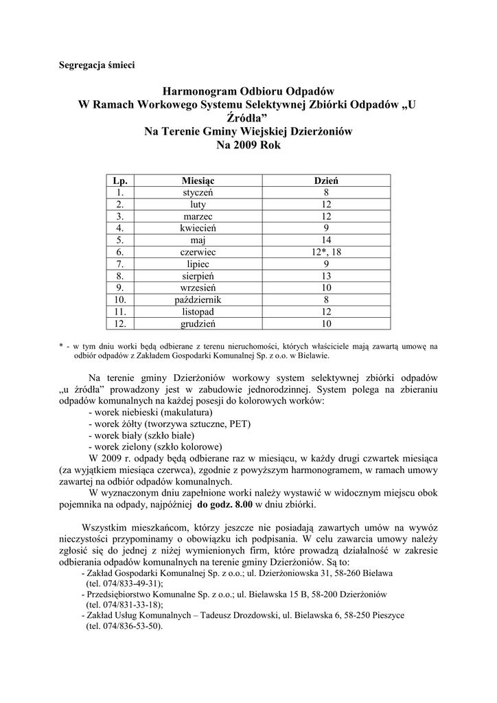 Segregacja śmieci Harmonogram Odbioru Odpadów W Ramach Workowego Systemu Selektywnej Zbiórki Odpadów „U Źródła” Na Terenie Gminy Wiejskiej DzierŜoniów Na 2009 Rok Lp. 1. 2. 3. 4. 5. 6. 7. 8. 9. 10. 11. 12. Miesiąc styczeń luty marzec kwiecień maj czerwiec lipiec sierpień wrzesień październik listopad grudzień Dzień 8 12 12 9 14 12*, 18 9 13 10 8 12 10 * - w tym dniu worki będą odbierane z terenu nieruchomości, których właściciele mają zawartą umowę na odbiór odpadów z Zakładem Gospodarki Komunalnej Sp. z o.o. w Bielawie. Na terenie gminy DzierŜoniów workowy system selektywnej zbiórki odpadów „u źródła” prowadzony jest w zabudowie jednorodzinnej. System polega na zbieraniu odpadów komunalnych na kaŜdej posesji do kolorowych worków: - worek niebieski (makulatura) - worek Ŝółty (tworzywa sztuczne, PET) - worek biały (szkło białe) - worek zielony (szkło kolorowe) W 2009 r. odpady będą odbierane raz w miesiącu, w kaŜdy drugi czwartek miesiąca (za wyjątkiem miesiąca czerwca), zgodnie z powyŜszym harmonogramem, w ramach umowy zawartej na odbiór odpadów komunalnych. W wyznaczonym dniu zapełnione worki naleŜy wystawić w widocznym miejscu obok pojemnika na odpady, najpóźniej do godz. 8.00 w dniu zbiórki. Wszystkim mieszkańcom, którzy jeszcze nie posiadają zawartych umów na wywóz nieczystości przypominamy o obowiązku ich podpisania. W celu zawarcia umowy naleŜy zgłosić się do jednej z niŜej wymienionych firm, które prowadzą działalność w zakresie odbierania odpadów komunalnych na terenie gminy DzierŜoniów. Są to: - Zakład Gospodarki Komunalnej Sp. z o.o.; ul. DzierŜoniowska 31, 58-260 Bielawa (tel. 074/833-49-31); - Przedsiębiorstwo Komunalne Sp. z o.o.; ul. Bielawska 15 B, 58-200 DzierŜoniów (tel. 074/831-33-18); - Zakład Usług Komunalnych – Tadeusz Drozdowski, ul. Bielawska 6, 58-250 Pieszyce (tel. 074/836-53-50). Zasady segregacji odpadów Do Ŝółtego pojemnika lub worka na plastik wrzucamy: - plastikowe butelki oraz pojemniki po napojach i innych produktach (butelkę naleŜy zgnieść przed wrzuceniem) - butelki i pojemniki po kosmetykach, chemii gospodarczej - folie i torebki plastikowe nie wrzucamy: - mocno zabrudzonego plastiku, naczyń jednorazowych - opakowań po olejach spoŜywczych i silnikowych - tworzyw piankowych i styropianu pojemników po środkach chemicznych (farbach, lakierach) Do białego pojemnika lub worka na szkło bezbarwne wrzucamy: - czyste, bezbarwne butelki - słoiki i inne opakowania szklane bez nakrętek, korków, kapsli nie wrzucamy: - szyb, luster, szkła zbrojonego - naczyń Ŝaroodpornych - świetlówek, Ŝarówek - porcelany, ceramiki, fajansu Do zielonego pojemnika lub worka na szkło kolorowe wrzucamy: - czyste, kolorowe butelki, słoik i inne opakowania szklane bez nakrętek, korków, kapsli nie wrzucamy: - szyb, luster, szkła zbrojonego - naczyń Ŝaroodpornych - świetlówek, Ŝarówek - porcelany, ceramiki, fajansu PAPIER Do niebieskiego pojemnika luba worka na papier wrzucamy: - gazety, czasopisma, reklamy - ksiąŜki, zeszyty, kartki - torebki papierowe - pudełka z tektury nie wrzucamy: - kartonów po napojach - torebek foliowych, kalki, tapet - papieru zabrudzonego i tłustego - papieru powlekanego folią - papierów higienicznych