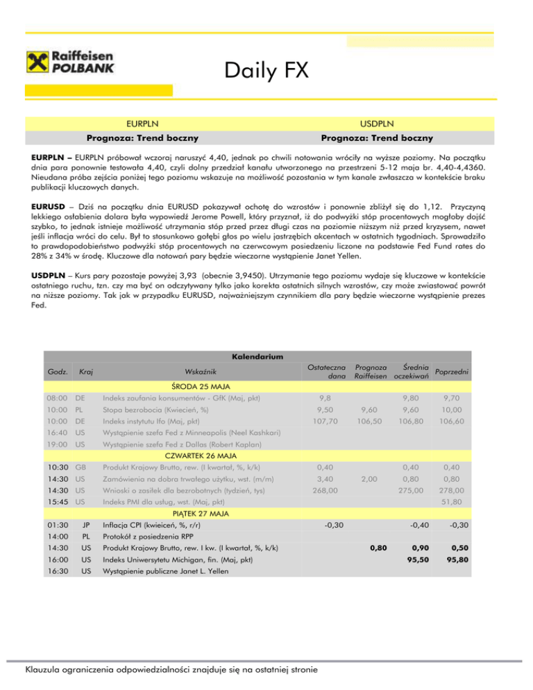 Daily FX EURPLN USDPLN Prognoza: Trend boczny Prognoza: Trend boczny EURPLN – EURPLN próbował wczoraj naruszyć 4,40, jednak po chwili notowania wróciły na wyższe poziomy. Na początku dnia para ponownie testowała 4,40, czyli dolny przedział kanału utworzonego na przestrzeni 5-12 maja br. 4,40-4,4360. Nieudana próba zejścia poniżej tego poziomu wskazuje na możliwość pozostania w tym kanale zwłaszcza w kontekście braku publikacji kluczowych danych. EURUSD – Dziś na początku dnia EURUSD pokazywał ochotę do wzrostów i ponownie zbliżył się do 1,12. Przyczyną lekkiego osłabienia dolara była wypowiedź Jerome Powell, który przyznał, iż do podwyżki stóp procentowych mogłoby dojść szybko, to jednak istnieje możliwość utrzymania stóp przed przez długi czas na poziomie niższym niż przed kryzysem, nawet jeśli inflacja wróci do celu. Był to stosunkowo gołębi głos po wielu jastrzębich akcentach w ostatnich tygodniach. Sprowadziło to prawdopodobieństwo podwyżki stóp procentowych na czerwcowym posiedzeniu liczone na podstawie Fed Fund rates do 28% z 34% w środę. Kluczowe dla notowań pary będzie wieczorne wystąpienie Janet Yellen. USDPLN – Kurs pary pozostaje powyżej 3,93 (obecnie 3,9450). Utrzymanie tego poziomu wydaje się kluczowe w kontekście ostatniego ruchu, tzn. czy ma być on odczytywany tylko jako korekta ostatnich silnych wzrostów, czy może zwiastować powrót na niższe poziomy. Tak jak w przypadku EURUSD, najważniejszym czynnikiem dla pary będzie wieczorne wystąpienie prezes Fed. Kalendarium Godz. Kraj Wskaźnik Ostateczna dana Prognoza Średnia Poprzedni Raiffeisen oczekiwań ŚRODA 25 MAJA 08:00 DE Indeks zaufania konsumentów - GfK (Maj, pkt) 10:00 PL Stopa bezrobocia (Kwiecień, %) 10:00 DE Indeks instytutu Ifo (Maj, pkt) 16:40 US Wystąpienie szefa Fed z Minneapolis (Neel Kashkari) 19:00 US Wystąpienie szefa Fed z Dallas (Robert Kaplan) 9,8 9,80 9,70 9,50 9,60 9,60 10,00 107,70 106,50 106,80 106,60 0,40 0,40 0,80 0,80 275,00 278,00 CZWARTEK 26 MAJA 10:30 GB Produkt Krajowy Brutto, rew. (I kwartał, %, k/k) 0,40 14:30 US Zamówienia na dobra trwałego użytku, wst. (m/m) 3,40 14:30 US Wnioski o zasiłek dla bezrobotnych (tydzień, tys) 15:45 US Indeks PMI dla usług, wst. (Maj, pkt) 01:30 JP Inflacja CPI (kwieiceń, %, r/r) 14:00 PL Protokół z posiedzenia RPP 14:30 US Produkt Krajowy Brutto, rew. I kw. (I kwartał, %, k/k) 16:00 US Indeks Uniwersytetu Michigan, fin. (Maj, pkt) 16:30 US Wystąpienie publiczne Janet L. Yellen 2,00 268,00 51,80 PIĄTEK 27 MAJA Klauzula ograniczenia odpowiedzialności znajduje się na ostatniej stronie -0,30 0,80 -0,40 -0,30 0,90 0,50 95,50 95,80 Opór Kurs Wsparcie EURPLN USDPLN Prognoza: Trend boczny Prognoza: Trend boczny 4,5000 4,4720 4,4360 4,4110 4,4000 4,3600 4,3340 Wczoraj kurs próbował przełamać dolne ograniczenie kanału 4,40-4,4360, jednak notowania szybko do niego wróciły i obecnie oscylują wokół 4,4110. W związku z niezwłocznym powrotem do tego kanału zmniejszyło się prawdopodobieństwo wybicia w krótkim terminie. Najbliższe wsparcie poza kanałem znajduje się przy 4,3600, gdzie przebiega 100-sesyjna średnia. Opór dla notowań poza kanałem umiejscowiony jest przy szczycie lokalnym z 9 lutego br. tzn. 4,4720. Opór Kurs Wsparcie EURPLN USDPLN Prognoza: Trend boczny Prognoza: Trend boczny 4,0060 4,0000 3,9880 3,9450 3,9300 3,9060 3,8830 Wczoraj USDPLN kontynuował spadki zapoczątkowane na środowej sesji. Dziś mamy do czynienia z odbiciem. Warto zauważyć utrzymanie poziomu 3,9300 związanego z wcześniejszym szczytem lokalnym. Najbliższe opory to szczyt notowań z 24 maja, czyli 3,9880 oraz psychologiczny poziom 4,0000. Wsparcia znajdują się odpowiednio przy szczycie lokalnym czyli 3,9300 oraz 100-sesyjnej średniej (obecnie 3,9060) Klauzula ograniczenia odpowiedzialności znajduje się na ostatniej stronie Raiffeisen Polbank ul. Grzybowska 78, 00-844 Warszawa www.raiffeisenpolbank.com Departament Sprzedaży Rynków Finansowych Telefon: + 48 22 585 37 86 Faks: + 48 22 585 33 68 W razie pytań lub uwag dotyczących powyższej publikacji proszę o kontakt: [email protected] Dealing: Bydgoszcz tel.: (22) 585 37 73 Poznań tel.: (61) 655 47 51 Gdańsk tel.: (22) 585 37 71 Rzeszów tel.: (22) 585 37 75 Katowice tel.: (22) 585 37 69 Szczecin tel.: (22) 585 37 71 Kielce tel.: (22) 585 37 70 Toruń tel.: (22) 585 37 72 Kraków tel.: (22) 585 37 70 Warszawa tel.: (22) 585 37 79 Lublin tel.: (22) 585 37 75 Wrocław tel.: (22) 585 37 74 Łódź tel.: (22) 585 37 75 Zielona Góra tel.: (22) 585 37 73 Klauzula Ograniczenia Odpowiedzialności: Niniejsza wiadomość została przesłana zgodnie z Pani/Pana zleceniem. Informujemy, że zgoda na otrzymywanie informacji może zostać w każdej chwili odwołana. Jeżeli nie życzy sobie Pani/ Pan dalszego otrzymywania materiałów przygotowanych przez Zespół Analiz Ekonomicznych Raiffeisen Bank Polska S.A (dalej: RBPL lub Bank) lub niniejszy materiał został wysłany na Pani/Pana adres przez pomyłkę, prosimy o przesłanie e-maila o tytule "REZYGNACJA" na skrzynkę e-mailową: [email protected]. Opracowanie to nie stanowi oferty w rozumieniu art. 66 Kodeksu Cywilnego i zostało przesłane na podstawie ustnej zgody, która w każdej chwili może być odwołana. Ma ono charakter wyłącznie informacyjny. Powielanie bądź publikowanie go lub jego części bez pisemnej zgody Banku jest zabronione. Decyzja inwestycyjna w odniesieniu do papieru wartościowego, produktu finansowego lub inwestycji powinna być podjęta na podstawie opublikowanego prospektu emisyjnego lub kompletnej dokumentacji dla papieru wartościowego, produktu finansowego lub inwestycji. Ostateczna decyzja zawarcia transakcji należy wyłącznie do Klienta. Bank nie występuje w roli pośrednika ani przedstawiciela Klienta. Przed zawarciem każdej transakcji Klient powinien nie opierając się na informacjach przekazanych przez Bank określić jej ryz
