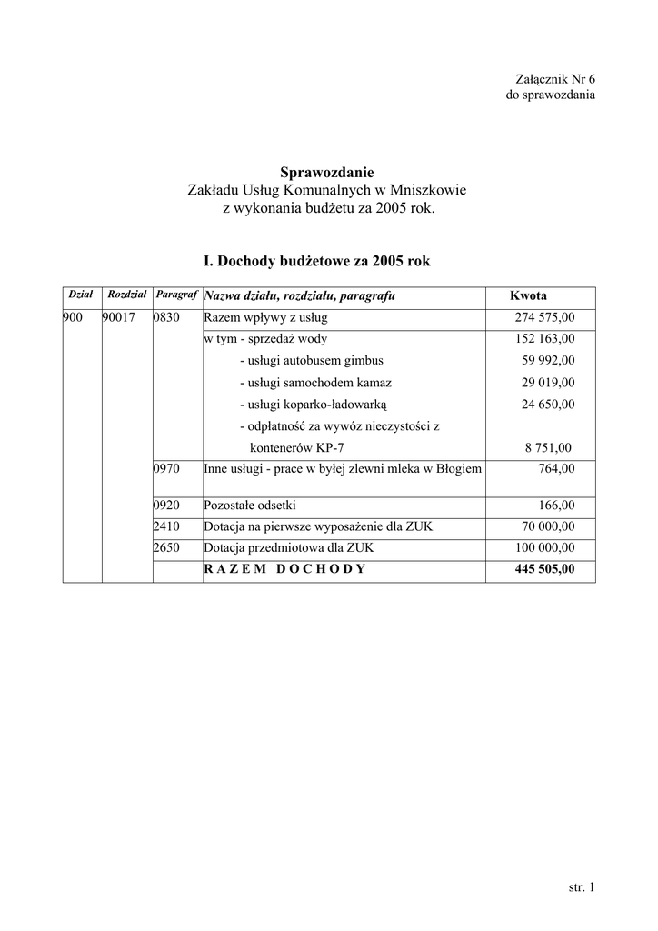 Załącznik Nr 6 do sprawozdania Sprawozdanie Zakładu Usług Komunalnych w Mniszkowie z wykonania budżetu za 2005 rok. I. Dochody budżetowe za 2005 rok Dział 900 Rozdział Paragraf 90017 0830 Nazwa działu, rozdziału, paragrafu Kwota Razem wpływy z usług 274 575,00 w tym - sprzedaż wody 152 163,00 - usługi autobusem gimbus 59 992,00 - usługi samochodem kamaz 29 019,00 - usługi koparko-ładowarką 24 650,00 - odpłatność za wywóz nieczystości z kontenerów KP-7 8 751,00 0970 Inne usługi - prace w byłej zlewni mleka w Błogiem 764,00 0920 Pozostałe odsetki 166,00 2410 Dotacja na pierwsze wyposażenie dla ZUK 2650 Dotacja przedmiotowa dla ZUK 100 000,00 RAZEM DOCHODY 445 505,00 70 000,00 str. 1 II. Wydatki budżetowe za 2004 rok str. 2 Dział Rozdział 900 90017 Paragraf Nazwa działu, rozdziału, paragrafu 3020 Nagrody i wydatki osobowe, badania lekarskie 4010 Wynagrodzenie pracowników 4110 Ubezpieczenie społeczne pracowników 4120 Składka na Fundusz pracy Kwota 480,00 186 673,00 30 847,00 4 175,00 Wydatki związane z autobusem gimbus 31 634,00 w tym - zakup paliwa i olej 24 257,00 - zakup opon 6 417,00 - zakup winety 960,00 Wydatki związane z koparko – ładowarką 12 426,00 w tym - zakup paliwa i oleju 10 428,00 - zakup szufli do kopania rowów - zakup części 1 733,00 265,00 Wydatki związane z samochodem kamaz 14 367,00 w tym - zakup paliwa i olej 11 774,00 - zakup akumulatorów 831,00 - legalizacja tachografu 427,00 - badanie techniczne 176,00 - zakup opon Razem koszty 1 159,00 transportu 58 427,00 Pozostałe zakupy w tym: - zakup materiałów biurowych, komputer, zestaw inkasencki „Psion”, - zakup materiałów do wykonania renowacji stawu w miejscowości Potok - zakup materiałów hydraulicznych do naprawy wodociągu i przyłączy - zakup materiałów do malowania hydroforni, 4210 5 920,00 859,00 145,00 Razem koszty zakupów materiałów 80 395,00 Zużycie energii w: - Hydroforni Błogie Rządowe 21 848,00 - Hydroforni Zajączków 20 481,00 - Hydroforni Zarzęcin 3 108,00 - Hydrofornia Mikułowice 2 178,00 - Baza po GS Zakup wody dla Strzelec 4260 15 044,00 R a z e m zużycie energii i zakup wody 559,00 4 302,00 52 476,00 str. 3 Dział Rozdział Paragraf 900 90017 Nazwa działu, rozdziału, paragrafu - serwis autobusu gimbus - naprawa autobusu gimbus - legalizacja tachografu 4270 Kwota 206,00 1 465,00 281,00 Zakup usług remontowych 1 952,00 - opłaty bankowe, prowadzenie konta 2 625,00 - usługi telekomunikacyjne 1 423,00 - opłata za dozór techniczny 1 280,00 - opłata za usługę serwisowa program WODA 1 464,00 - opłata rejestracyjna VAT 152,00 - opłata za wywóz kontenerów KP-7 śmieci 50 660,00 4300 Razem zakup usług pozostałych 57 604,00 4410 Delegacje 4430 Opłata do Urzędu Marszałkowskiego 4440 Zakładowy Fundusz Świadczeń Socjalnych 5 392,00 4530 Podatek VAT 5 929,00 RAZEM 474,00 WYDATKI 18 256,00 444 653,00 str. 4