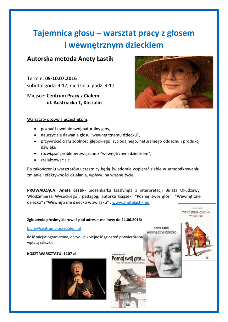 Tajemnica głosu – warsztat pracy z głosem i wewnętrznym dzieckiem Autorska metoda Anety Łastik Termin: 09-10.07.2016 sobota: godz. 9-17, niedziela: godz. 9-17 Miejsce: Centrum Pracy z Ciałem ul. Austriacka 1, Koszalin Warsztaty pozwolą uczestnikom: poznać i uwolnić swój naturalny głos, nauczyć się dawania głosu "wewnętrznemu dziecku", przywrócić ciału zdolność głębokiego, życiodajnego, naturalnego oddechu i produkcji dźwięku, rozwiązać problemy związane z "wewnętrznym dzieckiem", zrelaksować się. Po zakończeniu warsztatów uczestnicy będą świadomie wspierać siebie w samoodkrywaniu, zmianie i efektywności działania, wpływu na własne życie. PROWADZĄCA: Aneta Łastik- piosenkarka (zasłynęła z interpretacji Bułata Okudżawy, Włodzimierza Wysockiego), pedagog, autorka książek: "Poznaj swój głos", "Wewnętrzne dziecko" i "Wewnętrzne dziecko w związku" . www.anetalastik.eu" Zgłoszenia prosimy kierować pod adres e-mailowy do 24.06.2016: [email protected] Ilość miejsc ograniczona, decyduje kolejność zgłoszeń potwierdzona wpłatą zaliczki. KOSZT WARSZTATU: 1107 zł
