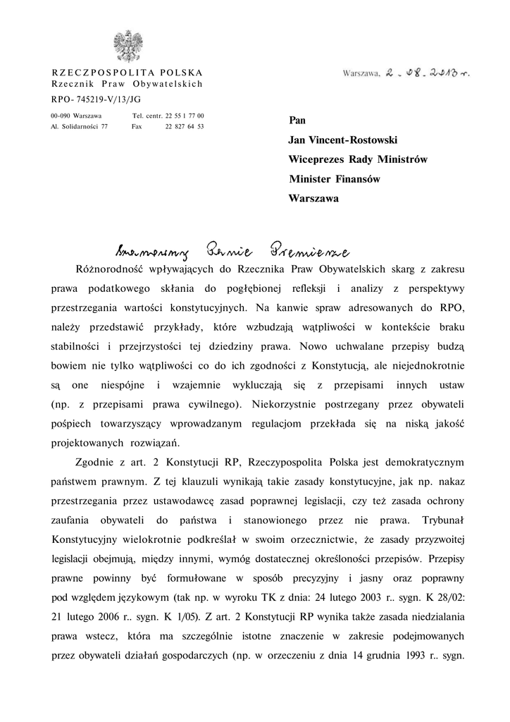 R Z E C Z P O S P O L I T A POLSKA Rzecznik Praw Obywatelskich RPO- 745219-V/13/JG 00-090 Warszawa Tel. centr. 22 55 1 77 00 Al. Solidarności 77 Fax Pan 22 827 64 53 Jan Vincent-Rostowski Wiceprezes Rady Ministrów Minister Finansów Warszawa Różnorodność wpływających do Rzecznika Praw Obywatelskich skarg z zakresu prawa podatkowego skłania do pogłębionej refleksji i analizy z perspektywy przestrzegania wartości konstytucyjnych. Na kanwie spraw adresowanych do RPO, należy przedstawić przykłady, które wzbudzają wątpliwości w kontekście braku stabilności i przejrzystości tej dziedziny prawa. Nowo uchwalane przepisy budzą bowiem nie tylko wątpliwości co do ich zgodności z Konstytucją, ale niejednokrotnie są one niespójne i wzajemnie wykluczają się z przepisami innych ustaw (np. z przepisami prawa cywilnego). Niekorzystnie postrzegany przez obywateli pośpiech towarzyszący wprowadzanym regulacjom przekłada się na niską jakość projektowanych rozwiązań. Zgodnie z art. 2 Konstytucji RP, Rzeczypospolita Polska jest demokratycznym państwem prawnym. Z tej klauzuli wynikają takie zasady konstytucyjne, jak np. nakaz przestrzegania przez ustawodawcę zasad poprawnej legislacji, czy też zasada ochrony zaufania obywateli do państwa i stanowionego przez nie prawa. Trybunał Konstytucyjny wielokrotnie podkreślał w swoim orzecznictwie, że zasady przyzwoitej legislacji obejmują, między innymi, wymóg dostatecznej określoności przepisów. Przepisy prawne powinny być formułowane w sposób precyzyjny i jasny oraz poprawny pod względem językowym (tak np. w wyroku TK z dnia: 24 lutego 2003 r.. sygn. K 28/02: 21 lutego 2006 r.. sygn. K 1/05). Z art. 2 Konstytucji RP wynika także zasada niedzialania prawa wstecz, która ma szczególnie istotne znaczenie w zakresie podejmowanych przez obywateli działań gospodarczych (np. w orzeczeniu z dnia 14 grudnia 1993 r.. sygn. 2 K 8/93). W demokratycznym państwie prawnym stanowienie i stosowanie prawa nie może być bowiem pułapką dla obywateli. Przykładem regulacji podatkowych, które budzą wątpliwości co do przestrzegania przez ustawodawcę zakazu retroakcji są przepisy ustawy z dnia 16 listopada 2012 r. o redukcji niektórych obciążeń administracyjnych w gospodarce (Dz. U. z 2012 r. poz. 1342). W przepisach tej ustawy wprowadzono bowiem przepis przejściowy, zgodnie z którym przepisy dotyczące korekty podatku naliczonego stosuje się do wierzytelności powstałych przez dniem wejścia w życie przepisów tej ustawy, pod warunkiem ich uprawdopodobnienia - na zasadach wskazanych w nowych przepisach - po dniu 31 grudnia 2012 r. (art. 23 ust. 1 i 2 ustawy o redukcji niektórych obciążeń administracyjnych w gospodarce). W rezultacie przepis przejściowy pozwala nałożyć organom podatkowym dodatkowe zobowiązanie podatkowe za brak korekty podatku, który został odliczony jeszcze pod rządami poprzednio obowiązujących przepisów. Taka regulacja wzbudza wątpliwości również w odniesieniu do konstytucyjnej zasady ochrony praw nabytych. Kolejną kwestią, na którą należy zwrócić uwagę Pana Premiera, jest stabilność prawa, jasność i klarowność przepisów prawnych oraz ich neutralność wobec procesów gospodarczych, a więc cechy od lat wskazywane - m.in. przez doktrynę prawa podatkowego - jako walory, które powinny wyróżniać przepisy każdej gałęzi prawa (tak np. w raporcie Stan prawa podatkowego w Polsce 2005, cz. II, prof. Bogumił Brzeziński, prof. Włodzimierz Nykiel). O braku stabilności prawa podatkowego w Polsce świadczy m.in. ilość modyfikacji ustaw podatkowych w ostatnich latach (dokładne dane były' m.in. przedmiotem raportu przygotowanego w 2011 r. przez Najwyższą Izbę Kontroli). Nie jest to wprawdzie jedyny miernik stabilności prawa, ale on właśnie w dużej mierze przesądza o kształtowaniu zaufania obywateli do państwa i stanowionego przez nie prawa. Brak stabilności polskiego prawa podatkowego jest dostrzegany nie tylko przez doktrynę prawa podatkowego, czy organy państwowe, ale przede wszystkim przez samych odbiorców regulacji podatkowych, w tym także zagranicznych obserwatorów. Zgodnie z ..Badaniem stabilności systemów podatkowych w regionie EMEA" sporządzonym przez 3 Deloitte1 , Polska jest wśród krajów o najniższym poziomie stabilności podatkowej. Aż ponad 70% polskich respondentów stwierdziło, że niepewność podatkowa może negatywnie wpływać na działalność przedsiębiorstwa. Jako główną przyczynę niepewności podatkowej respondenci z krajów EMEA wskazywali brak stabilności przepisów podatkowych i częste zmiany prawa. Ponadto, Polska zajmuje odległe 114 miejsce (na 185) w kategorii Paying Taxes raportu Doing Business 2013 przygotowywanego przez Bank Światowy2 (wprawdzie w ostatnim roku Polska zanotowała niewielki wzrost notowań w tej kategorii, ale nadal zajmowane przez Polskę miejsce należy uznać za niesatysfakcjonujące i świadczące negatywnie o systemie podatkowym w Polsce). Niepokojący jest również pośpiech towarzyszący wprowadzaniu nowych regulacji prawnych, przejawiający się m.in. w wyznaczaniu krótkich terminów na konsultacje społeczne. Wprawdzie terminy konsultacji z niektórymi rodzajami organizacji społecznych nie są obecnie ustawowo uregulowane, ale dla pogłębiania zaufania do państwa i stanowionego przez nie prawa korzystne byłoby wypracowanie jednolitej praktyki i przedkładanie wszystkim partnerom społecznym projektów aktów prawnych w takim samym terminie, pozwalającym na przeprowadzenie szczegółowych analiz i zgłoszenie uwag. Jako przykład przywołać należy konsultacje społeczne przy projekcie rozporządzenia Ministra Finansów z dnia 14 marca 2013 r. w sprawie kas rejestrujących (Dz. U. z 2013 r. poz. 363). Podczas konsultacji brak było możliwości zgłoszenia uwag przez partnerów społecznych, na skutek krótkiego terminu, który np. dla Krajowej Izby Doradców Pod
