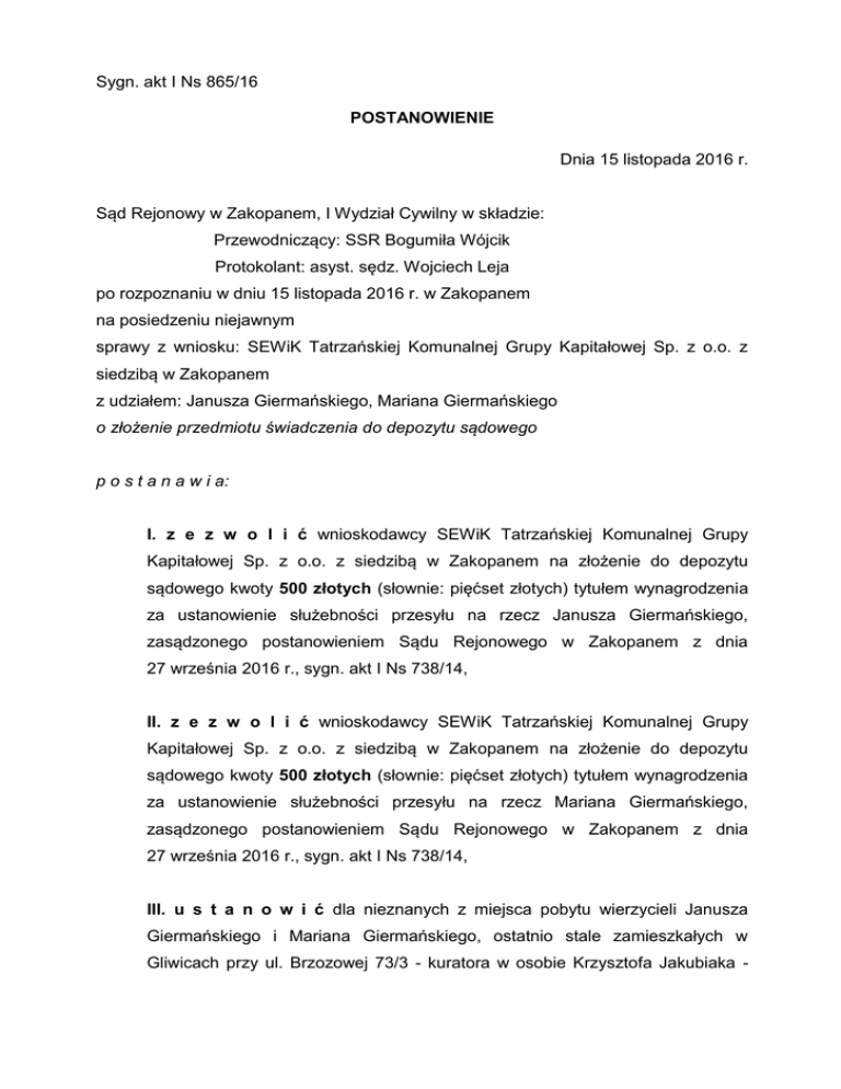 Sygn. akt I Ns 865/16 POSTANOWIENIE Dnia 15 listopada 2016 r. Sąd Rejonowy w Zakopanem, I Wydział Cywilny w składzie: Przewodniczący: SSR Bogumiła Wójcik Protokolant: asyst. sędz. Wojciech Leja po rozpoznaniu w dniu 15 listopada 2016 r. w Zakopanem na posiedzeniu niejawnym sprawy z wniosku: SEWiK Tatrzańskiej Komunalnej Grupy Kapitałowej Sp. z o.o. z siedzibą w Zakopanem z udziałem: Janusza Giermańskiego, Mariana Giermańskiego o złożenie przedmiotu świadczenia do depozytu sądowego p o s t a n a w i a: I. z e z w o l i ć wnioskodawcy SEWiK Tatrzańskiej Komunalnej Grupy Kapitałowej Sp. z o.o. z siedzibą w Zakopanem na złożenie do depozytu sądowego kwoty 500 złotych (słownie: pięćset złotych) tytułem wynagrodzenia za ustanowienie służebności przesyłu na rzecz Janusza Giermańskiego, zasądzonego postanowieniem Sądu Rejonowego w Zakopanem z dnia 27 września 2016 r., sygn. akt I Ns 738/14, II. z e z w o l i ć wnioskodawcy SEWiK Tatrzańskiej Komunalnej Grupy Kapitałowej Sp. z o.o. z siedzibą w Zakopanem na złożenie do depozytu sądowego kwoty 500 złotych (słownie: pięćset złotych) tytułem wynagrodzenia za ustanowienie służebności przesyłu na rzecz Mariana Giermańskiego, zasądzonego postanowieniem Sądu Rejonowego w Zakopanem z dnia 27 września 2016 r., sygn. akt I Ns 738/14, III. u s t a n o w i ć dla nieznanych z miejsca pobytu wierzycieli Janusza Giermańskiego i Mariana Giermańskiego, ostatnio stale zamieszkałych w Gliwicach przy ul. Brzozowej 73/3 - kuratora w osobie Krzysztofa Jakubiaka - pracownika Sądu Rejonowego w Zakopanem, celem reprezentowania ich w postępowaniu o złożeniu przedmiotu świadczeń do depozytu sądowego, IV. o ustanowieniu kuratora oraz zezwoleniu na złożeniu przedmiotu świadczeń do depozytu Sądowego o g ł o s i ć publicznie w budynku tut. Sądu i w Urzędzie Miasta Gliwice oraz w prasie lokalnej na łamach „Nowin Gliwickich” przez okres 1 miesiąca, V. skuteczność doręczenia odpisu wniosku do rąk kuratora u z a l e ż n i ć od upływu 30 - tu dni od publikacji postanowienia, VI. w e z w a ć wnioskodawcę do uiszczenia w terminie 14 dni zaliczki na wynagrodzenie kuratora w kwocie 240 złotych (słownie: dwieście czterdzieści złotych) i na ogłoszenie prasowe w kwocie 263,08 zł (słownie: dwieście sześćdziesiąt trzy złote i 08/100) - pod rygorem egzekucji. UZASADNIENIE Wnioskodawca SEWiK Tatrzańska Komunalna Grupa Kapitałowa Sp. z o.o. z siedzibą w Zakopanem wniósł o złożenie do depozytu sądowego kwot po 500 złotych tytułem wynagrodzenia za ustanowienie służebności przesyłu, zasądzonych postanowieniem Sądu Rejonowego w Zakopanem z dnia 27 września 2016 r., sygn. akt I Ns 738/14 na rzecz uczestników Janusza Giermańskiego i Mariana Giermańskiego. W uzasadnieniu wnioskodawca wskazał, że w sprawie I Ns 738/14 ustalono, że uczestnicy Janusz Giermański i Marian Giermański nie są znani z miejsca pobytu i w związku z tym ustanowiono dla nich kuratora w osobie Bożeny Trzebunia, celem reprezentowania ich interesów. W wyniku postępowania zasądzono na ich rzecz wynagrodzenie za ustanowienie służebności przesyłu w kwotach po 500 złotych. 2 Wnioskodawca podkreślił, że jako dłużnik, chcąc zwolnić się z zobowiązania, a nie mogąc skutecznie przesłać należności do rąk uprawnionych wnosi jak na wstępie. Sąd zważył, co następuje: Wniosek SEWiK Tatrzańskiej Komunalnej Grupy Kapitałowej Sp. z o.o. z siedzibą w Zakopanem zasługuje na uwzględnienie. Stosownie do art. 693¹ k.p.c. w postępowaniu o złożenie przedmiotu świadczenia do depozytu sądowego sąd nie bada prawdziwości twierdzeń zawartych we wniosku ograniczając się do oceny, czy według przytoczonych okoliczności złożenie do depozytu sądowego jest prawnie uzasadnione. Jak wynika z akt sprawy sygn. akt I Ns 738/14, ostanie znane miejsce zamieszkania uczestników Janusza Giermańskiego i Mariana Giermańskiego, to adres w Gliwicach, ul. Brzozowa 73/3. Z informacji uzyskanych z systemu PESEL-SAD wynika, iż uczestnicy ci przebywają w Australii. Skoro zatem świadczenie nie może być spełnione z powodu okoliczności dotyczących osoby wierzyciela, to istnieją podstawy do złożenia go do depozytu sądowego, w myśl art. 467 pkt 4 k.c. Należy dodać, iż przedmiotowy depozyt może być wypłacony uczestnikom na ich wniosek. Wobec powyższego postanowiono jak w pkt I i II sentencji. Stosownie do treści art. 6933 § 1 k.p.c. jeżeli wierzyciel lub jego miejsce zamieszkania nie są znane, o zezwoleniu na złożenie przedmiotu świadczenia do depozytu sądowego sąd ogłosi publicznie w budynku sądowym oraz w lokalu organu gminy. Ponadto sąd zarządza umieszczenie ogłoszenia w dzienniku o zasięgu ogólnopolskim lub podaje je w inny sposób do wiadomości publicznej. Jednocześnie Sąd w oparciu o art. 5 ust. 1 pkt 4 Ustawy o kosztach cywilnych w sprawach cywilnych wezwał wnioskodawcę o zaliczkę na ogłoszenie prasowe. Z kolei w oparciu o przepis § 8 pkt 3 Rozporządzenia Ministra Sprawiedliwości z dnia 22 października 2015 r. w sprawie opłat za czynności adwokackie, Sąd wezwał wnioskodawcę do uiszczenia w terminie 14 dni zaliczki na wynagrodzenie kuratora w kwocie 240 złotych. Wobec powyższego postanowiono jak w pkt III, IV, V i VI sentencji. 3 4