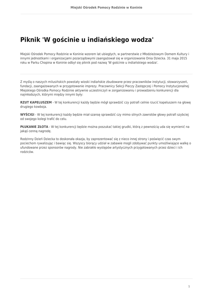 Miejski Ośrodek Pomocy Rodzinie w Koninie Piknik 'W gościnie u indiańskiego wodza' Miejski Ośrodek Pomocy Rodzinie w Koninie wzorem lat ubiegłych, w partnerstwie z Młodzieżowym Domem Kultury i innymi jednostkami i organizacjami pozarządowymi zaangażował się w organizowanie Dnia Dziecka. 31 maja 2015 roku w Parku Chopina w Koninie odbył się piknik pod nazwą 'W gościnie u indiańskiego wodza'. Z myślą o naszych milusińskich powstały wioski indiańskie zbudowane przez pracowników instytucji, stowarzyszeń, fundacji, zaangażowanych w przygotowanie imprezy. Pracownicy Sekcji Pieczy Zastępczej i Pomocy Instytucjonalnej Miejskiego Ośrodka Pomocy Rodzinie aktywnie uczestniczyli w zorganizowaniu i prowadzeniu konkurencji dla najmłodszych, którymi między innymi były: RZUT KAPELUSZEM - W tej konkurencji każdy będzie mógł sprawdzić czy potrafi celnie rzucić kapeluszem na głowę drugiego kowboja. WYŚCIGI - W tej konkurencji każdy będzie miał szansę sprawdzić czy mimo silnych zawrotów głowy potrafi szybciej od swojego kolegi trafić do celu. PŁUKANIE ZŁOTA - W tej konkurencji będzie można poszukać takiej grudki, którą z pewnością uda się wymienić na jakąś cenną nagrodę. Rodzinny Dzień Dziecka to doskonała okazja, by zaprezentować się z nieco innej strony i poświęcić czas swym pociechom rywalizując i bawiąc się. Wszyscy biorący udział w zabawie mogli zdobywać punkty umożliwiające walkę o ufundowane przez sponsorów nagrody. Nie zabrakło występów artystycznych przygotowanych przez dzieci i ich rodziców. 1