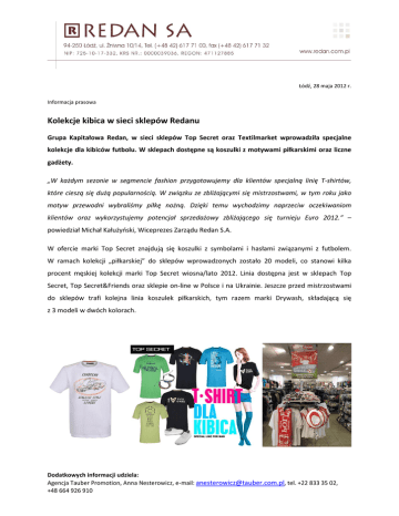 Łódź, 28 maja 2012 r. Informacja prasowa Kolekcje kibica w sieci sklepów Redanu Grupa Kapitałowa Redan, w sieci sklepów Top Secret oraz Textilmarket wprowadziła specjalne kolekcje dla kibiców futbolu. W sklepach dostępne są koszulki z motywami piłkarskimi oraz liczne gadżety. „W każdym sezonie w segmencie fashion przygotowujemy dla klientów specjalną linię T-shirtów, które cieszą się dużą popularnością. W związku ze zbliżającymi się mistrzostwami, w tym roku jako motyw przewodni wybraliśmy piłkę nożną. Dzięki temu wychodzimy naprzeciw oczekiwaniom klientów oraz wykorzystujemy potencjał sprzedażowy zbliżającego się turnieju Euro 2012.” – powiedział Michał Kałużyński, Wiceprezes Zarządu Redan S.A. W ofercie marki Top Secret znajdują się koszulki z symbolami i hasłami związanymi z futbolem. W ramach kolekcji „piłkarskiej” do sklepów wprowadzonych zostało 20 modeli, co stanowi kilka procent męskiej kolekcji marki Top Secret wiosna/lato 2012. Linia dostępna jest w sklepach Top Secret, Top Secret&Friends oraz sklepie on-line w Polsce i na Ukrainie. Jeszcze przed mistrzostwami do sklepów trafi kolejna linia koszulek piłkarskich, tym razem marki Drywash, składającą się z 3 modeli w dwóch kolorach. Dodatkowych informacji udziela: Agencja Tauber Promotion, Anna Nesterowicz, e-mail: [email protected], tel. +22 833 35 02, +48 664 926 910 Redan wprowadził także artykuły dedykowane mistrzostwom do sieci dyskontów odzieżowych Textilmarket. W ofercie znajdują się T-shirty dla mężczyzn, kobiet i dzieci z motywami piłkarskimi oraz produkty galanterii i gadżety - szaliki, czapki, kapelusze, trąbki, okulary, flagi, breloki, a nawet ubranka dla dzieci i grzechotki. *** Redan SA jest operatorem znanych detalicznych marek odzieżowych: Top Secret, Troll i Drywash oraz sieci sklepów Textilmarket. Spółka funkcjonuje w ramach Grupy Kapitałowej, która zajmuje się projektowaniem, marketingiem oraz dystrybucją odzieży. Redan zleca swoją produkcję fabrykom w Polsce, Chinach, Indiach Turcji, Korei i Bangladeszu. W Polsce grupa kapitałowa zatrudnia ponad półtora tysiąca osób. Sprzedaż jest prowadzona w 4 sieciach detalicznych: Top Secret, Top Secret&Friends, Troll oraz Textilmarket liczących ponad 470 sklepów. Redan powstał w 1995 roku, a w 2003 roku akcje Spółki zostały dopuszczone do publicznego obrotu na Giełdzie Papierów Wartościowych w Warszawie. Spółka aktywnie wspiera Fundację Happy Kids. Centrala Spółki znajduje się w Łodzi. Dodatkowych informacji udziela: Agencja Tauber Promotion, Anna Nesterowicz, e-mail: [email protected], tel. +22 833 35 02, +48 664 926 910