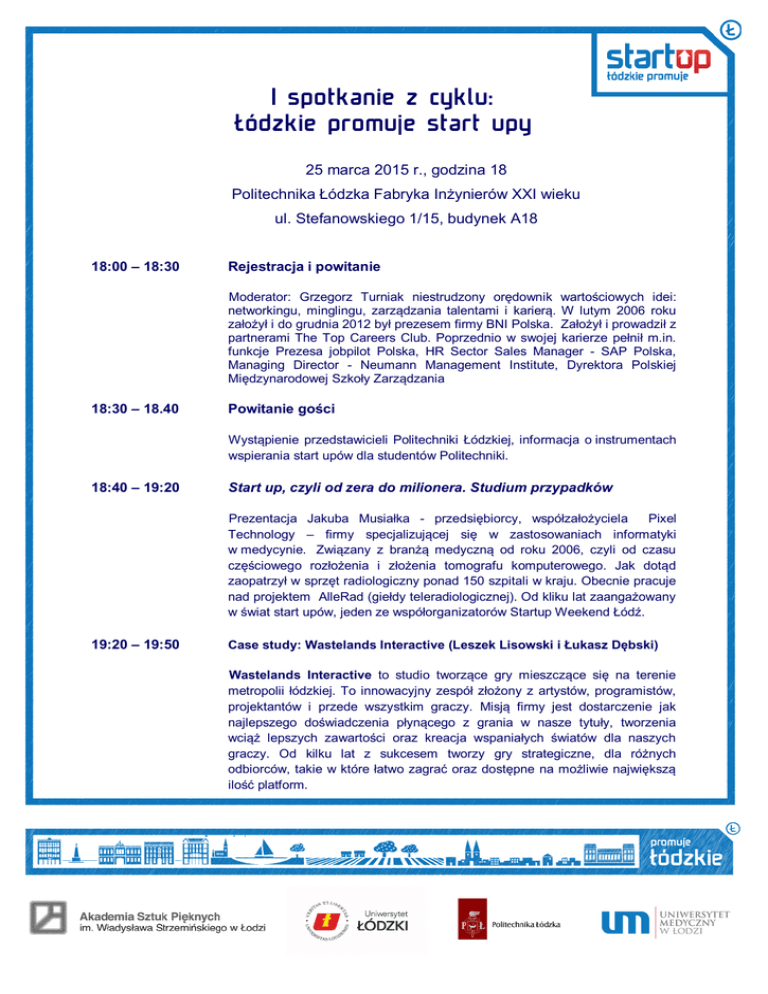 25 marca 2015 r., godzina 18 Politechnika Łódzka Fabryka Inżynierów XXI wieku ul. Stefanowskiego 1/15, budynek A18 18:00 – 18:30 Rejestracja i powitanie Moderator: Grzegorz Turniak niestrudzony orędownik wartościowych idei: networkingu, minglingu, zarządzania talentami i karierą. W lutym 2006 roku założył i do grudnia 2012 był prezesem firmy BNI Polska. Założył i prowadził z partnerami The Top Careers Club. Poprzednio w swojej karierze pełnił m.in. funkcje Prezesa jobpilot Polska, HR Sector Sales Manager - SAP Polska, Managing Director - Neumann Management Institute, Dyrektora Polskiej Międzynarodowej Szkoły Zarządzania 18:30 – 18.40 Powitanie gości Wystąpienie przedstawicieli Politechniki Łódzkiej, informacja o instrumentach wspierania start upów dla studentów Politechniki. 18:40 – 19:20 Start up, czyli od zera do milionera. Studium przypadków Prezentacja Jakuba Musiałka - przedsiębiorcy, współzałożyciela Pixel Technology – firmy specjalizującej się w zastosowaniach informatyki w medycynie. Związany z branżą medyczną od roku 2006, czyli od czasu częściowego rozłożenia i złożenia tomografu komputerowego. Jak dotąd zaopatrzył w sprzęt radiologiczny ponad 150 szpitali w kraju. Obecnie pracuje nad projektem AlleRad (giełdy teleradiologicznej). Od kliku lat zaangażowany w świat start upów, jeden ze współorganizatorów Startup Weekend Łódź. 19:20 – 19:50 Case study: Wastelands Interactive (Leszek Lisowski i Łukasz Dębski) Wastelands Interactive to studio tworzące gry mieszczące się na terenie metropolii łódzkiej. To innowacyjny zespół złożony z artystów, programistów, projektantów i przede wszystkim graczy. Misją firmy jest dostarczenie jak najlepszego doświadczenia płynącego z grania w nasze tytuły, tworzenia wciąż lepszych zawartości oraz kreacja wspaniałych światów dla naszych graczy. Od kilku lat z sukcesem tworzy gry strategiczne, dla różnych odbiorców, takie w które łatwo zagrać oraz dostępne na możliwie największą ilość platform. Najnowsza produkcja to Worlds of Magic, klasyczna strategia fantasy z gatunku 4X, z możliwością rozgrywania bitew z wykorzystaniem systemu D20., w której gracze mogą odkrywać i podbijać nieskończone ilości proceduralnie generowanych uniwersum oraz wykorzystywać potencjał militarny i magiczny aby pokonać swoich wrogów i zostać najpotężniejszym Czarnoksiężnikiem. Firma dynamicznie się rozwija a jej pracownicy mają jeszcze większe plany na przyszłość i wciąż pracują nad tworzeniem lepszych i ciekawszych gier oraz na promocją kultury grania oraz innowacyjnych pomysłów na nowe gry. 19:50 – 20:10 Mission possibile, z korporacjami. czyli współpraca start upów Andrzej Olsztyński - ekspert w dziedzinie rozwiązań IBM Enterprise Social Solutions. W firmie IBM od jedenastu lat zajmuje się narzędziami do pracy grupowej. zarządzania obiegiem dokumentów oraz rozwiązań społecznościowych. Autor książki „IBM Lotus Notes Domino 8/8.5. Podręcznik użytkownika oraz projektanta aplikacji” oraz publikacji i artykułów o tematyce związanej z zagadnieniami pracy grupowej i oprogramowaniem społecznościowym. Uczestniczył w wielu wdrożeniach tych rozwiązań w Polsce i za granicą. Obecnie kieruje działem sprzedaży IBM Enterprise Social Solutions w Europie Srodkowej i Centralnej. 20:10 – 21:00 Poczęstunek i networking RÓWNOLEGLE PODCZAS CAŁEGO SPOTKANIA: Szansa na uzyskanie informacji o mechanizmach i inicjatywach wspierania start upów w regionie Obecność podczas neworkingu inwestorów, pożyczkodawców, inkubatorów. Możliwość konsultacji pomysłów biznesowych Lada mentorów, gdzie możliwe będzie przedstawienie pomysłu i uzyskanie opinii od mentorów (Leszka Lisowskiego, Jakuba Musiałka, Andrzeja Olsztyńskiego, Grzegorza Turniaka). Osoba do kontaktu: Joanna Pastuszko Urząd Marszałkowski Województwa Łódzkiego, Departament ds. Przedsiębiorczości ul. Moniuszki 7/9, 90-101 Łódź , tel.: 42/ 291 98 44; fax. 42/ 291 98 41 email: [email protected] FB: https://www.facebook.com/lodzkieStartupy Organizatorzy: PARTNER STRATEGICZNY: PARTNERZY: