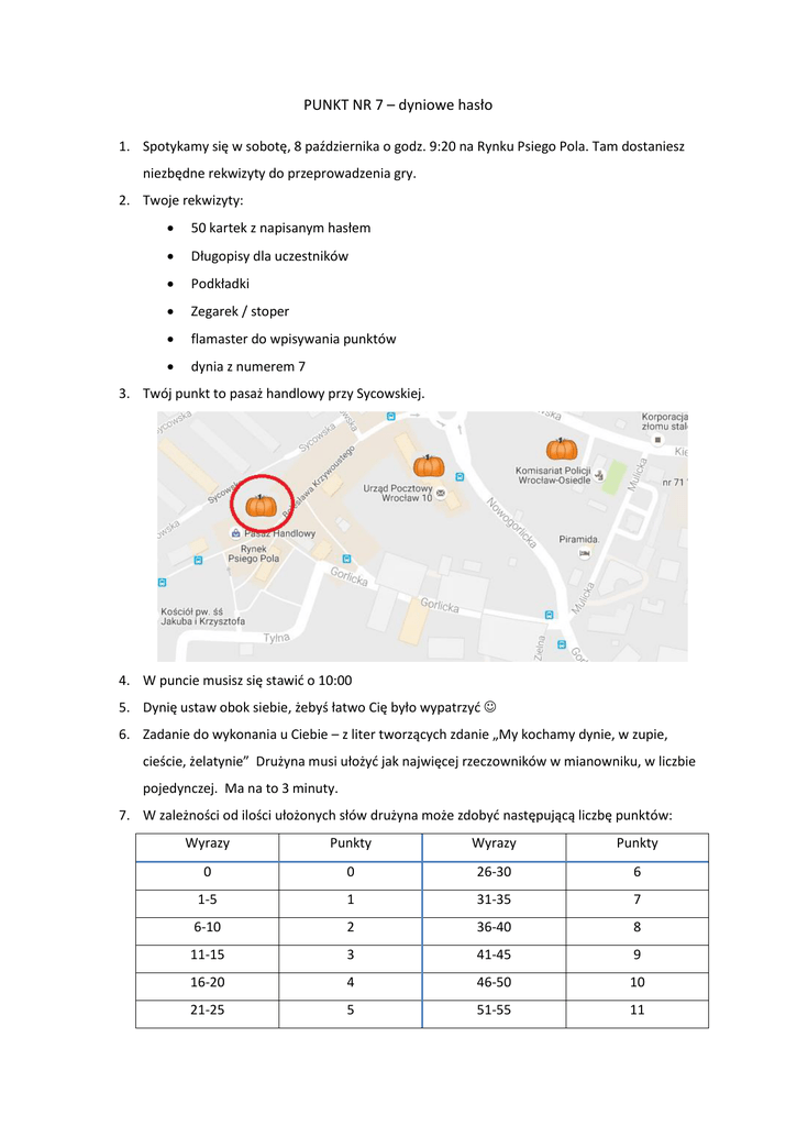 PUNKT NR 7 – dyniowe hasło 1. Spotykamy się w sobotę, 8 października o godz. 9:20 na Rynku Psiego Pola. Tam dostaniesz niezbędne rekwizyty do przeprowadzenia gry. 2. Twoje rekwizyty: 50 kartek z napisanym hasłem Długopisy dla uczestników Podkładki Zegarek / stoper flamaster do wpisywania punktów dynia z numerem 7 3. Twój punkt to pasaż handlowy przy Sycowskiej. 4. W puncie musisz się stawić o 10:00 5. Dynię ustaw obok siebie, żebyś łatwo Cię było wypatrzyć 6. Zadanie do wykonania u Ciebie – z liter tworzących zdanie „My kochamy dynie, w zupie, cieście, żelatynie” Drużyna musi ułożyć jak najwięcej rzeczowników w mianowniku, w liczbie pojedynczej. Ma na to 3 minuty. 7. W zależności od ilości ułożonych słów drużyna może zdobyć następującą liczbę punktów: Wyrazy Punkty Wyrazy Punkty 0 0 26-30 6 1-5 1 31-35 7 6-10 2 36-40 8 11-15 3 41-45 9 16-20 4 46-50 10 21-25 5 51-55 11 8. Wpisujesz liczbę punktów na ich karcie do gry w polu nr 7. 9. Jednocześnie 3 Drużyny mogą wykonywać zadanie. 10. Jeśli w tym samym czasie pojawi się u Ciebie więcej niż trzy drużyny, prosisz pozostałe, by grzecznie czekały w kolejce na swoją kolej. Prosisz, by zachowały spory odstęp od drużyn rozwiązujących zadanie, żeby nie słyszały odpowiedzi. 11. Punkt opuszczasz o godz. 12:30 12. Spotykamy się ponownie na Rynku Psiego Pola, przy miejscu oznaczonym jako punkt gry