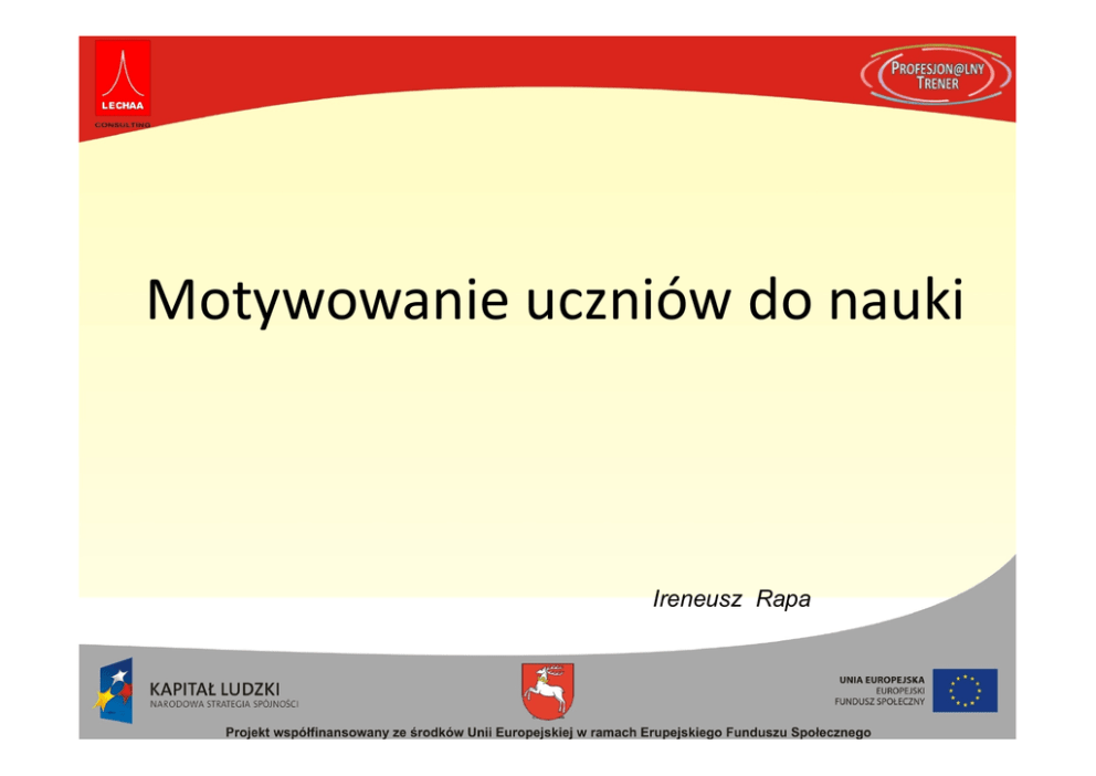 Motywowanie uczniów do nauki Ireneusz Rapa „ino oni nie chcom chcieć” Stanisław Wyspiański „Wesele” „żeby chcieli chcieć” Ucznia motywuje porównanie jego osiągnięć z • dokonaniami innych uczniów • obowiązującymi standardami wymagań • indywidualnymi kryteriami sukcesu Jere Brophy , „Motywowanie uczniów do nauki” Wydawnictwo Naukowe PWN Warszawa 2010 „Człowiek źle nauczony jest człowiekiem źle wychowanym, człowiek źle umotywowany jest człowiekiem źle nauczanym” Jere Brophy , „Motywowanie uczniów do nauki” Wydawnictwo Naukowe PWN Warszawa 2010 Motywowanie uczniów polega na wyszukiwaniu i stosowaniu sposobów, którymi nauczyciel zdołałby zachęcić uczniów do zaakceptowania celów pracy w klasie i uczenia się określonych tymi celami wiadomości i umiejętności niezależnie od tego, czy praca ta sprawia uczniom przyjemność i czy podjęliby ją, gdyby nie musieli. Jere Brophy , „Motywowanie uczniów do nauki” Wydawnictwo Naukowe PWN Warszawa 2010 Motywacja – wywołanie zachowania, jego ukierunkowanie i trwanie nastawionego na osiągnięcie określonego celu. Motywacja – jak wydobyć z ucznia to, co w nim najlepsze Motywacja według modelu oczekiwanie - wartość jak silne jest przekonanie(oczekiwanie), że potrafią wykonać zadanie pomyślnie, czyli jak bardzo są przekonani, że otrzymają nagrodę związaną z zadaniem jak znaczną wartość ma dla nich ta nagroda oraz okazja, żeby wykonać czynności związane z wykonaniem zadania Hansen D.(1989) Lesson eveding and lesson dissembling. Strefa najbliższego rozwoju (SNR) Różnica miedzy poziomem wykonywania zadań z pomocą i wsparciem nauczyciela, a poziomem rozwiązywania zadań samodzielnie przez ucznia. Wygotski L. Wybrane prace psychologiczne Warszawa 1966 Państwowe Wydawnictwa Naukowe Sposoby podejścia uczniów do zadań szkolnych zaangażowanie symulowanie unikanie odrzucenie Hansen D.(1989) Lesson eveding and lesson dissembling. Klasa – wspólnotą dydaktyczną Kiedy uczniowie będą się chcieli uczyć? „zorientuj się, o czym chcieliby się uczyć twoi uczniowie i co lubią robić na lekcji, a potem postaraj się uwzględnić jedno i drugie możliwie w największym stopniu w programie i pracy w klasie” „Uczniowie będą chcieli się uczyć, najwięcej i najbardziej wszechstronnie, jeśli za sensowne uznają to wszystko czego mają się uczyć” Jere Brophy , „Motywowanie uczniów do nauki” Wydawnictwo Naukowe PWN Warszawa 2010 Jak skutecznie motywować na lekcji? Niech Twoje lekcje i Ty sam staną się dla uczniów atrakcyjne Jere Brophy , „Motywowanie uczniów do nauki” Wydawnictwo Naukowe PWN Warszawa 2010 Nudni nauczyciele, którzy nie potrafią przekazywać wiedzy w atrakcyjny sposób są ogromnym zagrożeniem dla edukacji. Prof. Ph. G. Zimbardo Źródło: Epidemia nieśmiałości, z Philipsem G. Zimbardo rozmawia Julia Butrym, Polityka, 14 października 2000. Jak skutecznie motywować na lekcji? Skieruj pracę uczniów na indywidualne i wspólne cele uczenia się, pomóż im pomyślnie dojść do tych celów Żeby zmotywować uczniów do nauki musimy formułować ich cele nauki w kategoriach wiadomości i umiejętności, to znaczy dokładnie i jasno określić to czego i po co mamy ich nauczyć. Jere Brophy , „Motywowanie uczniów do nauki” Wydawnictwo Naukowe PWN Warszawa 2010 Jak skutecznie motywować na lekcji? Nauczaj treści wartej opanowania i to w sposób, który pomoże uczniom dostrzec jej wartość Jere Brophy , „Motywowanie uczniów do nauki” Wydawnictwo Naukowe PWN Warszawa 2010 Motywacja zewnętrzna i wewnętrzna „Boże spraw, by mi się chciało tak, jak mi się nie chce”. Motywacja zewnętrzna Stosując nagrody i inne zewnętrzne zachęty, używajmy ich tak, żeby zachęcić uczniów do przyjęcia za swoje twoich celów dydaktycznych, by dzięki temu przystępowali do uczenia się z zamiarem przyswojenia danej wiedzy i danych umiejętności, a jednocześnie z zamiarem zdobycia nagród zewnętrznych. Jere Brophy , „Motywowanie uczniów do nauki Wydawnictwo Naukowe PWN Warszawa 2010 Motywacja wewnętrzna pozwól uczniom wybiera zadania i sposoby pracy nad nimi zachęcaj do aktywnego reagowania dostosowuj prace dydaktyczne do zainteresowań uczniów przekazuj informację zwrotną zachęcaj do uczenia się w grupach i we współpracy nakłaniaj do samodzielnej nauki Jere Brophy , „Motywowanie uczniów do nauki” Wydawnictwo Naukowe PWN Warszawa 2010 Motywacja do nauki Zastępujmy tradycyjne i konwencjonalne czynności dydaktyczne lub chociaż je wzbogacajmy tak by uczniowie chcieli być aktywni. wzbudź zaciekawienie lekcją /tematem, pytaniem, środkami dydaktycznymi, anegdotą, fikcją/ zbliż lekcję do uczniów i uczniów do lekcji unikaj działań wywołujących lęk na lekcji pracuj zawsze z zapałem a niekiedy z pasją Jere Brophy , „Motywowanie uczniów do nauki” Wydawnictwo Naukowe PWN Warszawa 2010 DZIĘKUJĘ ZA UWAGĘ