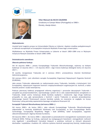 Vítor Manuel da SILVA CALDEIRA Urodzony w Campo Maior (Portugalia) w 1960 r. Żonaty, dwoje dzieci. Wykształcenie: Uzyskał tytuł magistra prawa na Universidade Clássica w Lizbonie i dyplom studiów podyplomowych w zakresie europeistyki w Europejskim Instytucie Wydziału Prawa tego uniwersytetu. Wykładowca na Wydziale Prawa Uniwersytetu w Lizbonie w latach 1983–1984 oraz w Wyższym Instytucie Nowych Zawodów w latach 1996–1999. Doświadczenie zawodowe: Obecnie pełniona funkcja Od 16 stycznia 2008 r. prezes Europejskiego Trybunału Obrachunkowego, wybrany na kolejne kadencje 12 stycznia 2011 r. i 23 stycznia 2014 r. Jego trzecia kadencja dobiegnie końca 22 stycznia 2017 r. W wyniku reorganizacji Trybunału od 1 czerwca 2010 r. przewodniczy również Komitetowi Administracyjnemu. Od czerwca 2011 r. jest członkiem zarządu Europejskiej Organizacji Najwyższych Organów Kontroli (EUROSAI). Jako prezes Trybunału odpowiada za nadzorowanie pracy Trybunału, kontakty z instytucjami Unii Europejskiej, najwyższymi organami kontroli i międzynarodowymi organizacjami ds. kontroli, a także kwestie prawne i audyt wewnętrzny. Podczas pierwszej kadencji propagował reformę organizacji i procesów decyzyjnych Trybunału i zarządzał jej przeprowadzeniem, wprowadzając system izb w celu zoptymalizowania zarządzania w Trybunale, dzięki czemu instytucja działa bardziej wydajnie i skutecznie. Jego druga kadencja przypadła na czas, gdy sprawozdania z kontroli i opinie Trybunału w sprawie prawodawstwa dotyczącego kwestii finansowych jeszcze bardziej zyskały na znaczeniu ze względu na kryzys finansowy i pilną potrzebę zapewnienia lepszego zarządzania finansami UE. Europejski Trybunał Obrachunkowy (od marca 2000 r.) Od marca 2000 r. do końca 2001 r. jako członek Europejskiego Trybunału Obrachunkowego odpowiadał za kontrolę działalności bankowej Unii Europejskiej, w tym Europejskiego Banku Centralnego, Europejskiej Wspólnoty Węgla i Stali (EWWiS), Szkół Europejskich, organów zdecentralizowanych i Agencji Dostaw Euratomu. Od stycznia 2002 r. do marca 2006 r. odpowiadał za poświadczenie wiarygodności wystawiane przez Trybunał (DAS). Pełniąc tę funkcję, zajmował się następującymi kwestiami: wiarygodność rozliczeń oraz legalność i prawidłowość transakcji leżących u podstaw rozliczeń w różnych obszarach dochodów i wydatków z budżetu UE, reforma systemu kontroli wewnętrznej Komisji, modernizacja systemu księgowego UE. Był również sprawozdawcą opinii Trybunału dotyczącej modelu jednorazowej kontroli oraz wniosku w sprawie unijnych ram kontroli wewnętrznej. Od marca 2005 r. do stycznia 2008 r. przewodniczył grupie kontroli odpowiedzialnej za koordynację kontroli finansowej, metodykę kontroli i kontrole jakości (grupa CEAD). W tym okresie był również członkiem Komitetu Administracyjnego Trybunału. Od marca 2006 r. do stycznia 2008 r. odpowiadał za Wydział Metodyki Kontroli i Sprawozdawczości (ADAR), w szczególności za kontrole jakości sprawozdań z kontroli Trybunału i wdrażanie metodyki kontroli. Sprawozdawca „Podręcznika kontroli wykonania zadań” przyjętego przez Trybunał w 2007 r. W latach 2008–2010 kontroler EUROSAI. Generalna Inspekcja Finansowa (1984–2000) W Generalnej Inspekcji Finansowej pracował w randze dyrektora (1989–1995) oraz zastępcy generalnego inspektora (1995–2000) i był odpowiedzialny za koordynację kontroli UE oraz system kontroli wewnętrznej w portugalskiej administracji finansowej. Jego zadania polegały na: • wspieraniu i koordynacji pracy Generalnej Inspekcji Finansowej w zakresie kontroli finansowej zasobów własnych UE, Sekcji Gwarancji Europejskiego Funduszu Orientacji i Gwarancji Rolnej (EFOGR), funduszy strukturalnych i Funduszu Spójności, • koordynacji zespołu projektowego opracowującego „Białą księgę w sprawie systemu kontroli wewnętrznej portugalskiej administracji finansowej”, • przewodniczeniu Międzyministerialnemu Komitetowi ds. Koordynacji i Kontroli Systemu Finansowania Sekcji Gwarancji EFOGR, • uczestnictwie w różnych unijnych grupach roboczych, w szczególności do spraw ochrony interesów finansowych UE i zwalczania nadużyć finansowych; pełnieniu funkcji członka portugalskiej delegacji w Komitecie Doradczym Komisji Europejskiej ds. Koordynacji w zakresie Nadużyć Finansowych (COCOLAF) oraz grupy osobistych przedstawicieli ministrów finansów ds. należytego i efektywnego zarządzania finansami (SEM 2000). Pozostała działalność • Konsultant OECD w ramach inicjatywy SIGMA (Wsparcie ulepszeń w zakresie ładu administracyjno-regulacyjnego i zarządzania w krajach Europy Środkowej i Wschodniej) współpracujący z ministerstwami finansów Republiki Czeskiej (1997), Polski (1998) i Estonii (1999) • Członek wspólnego komitetu audytu EUROPOL-u (2002–2004) • Członek Rady Nadzorczej Akademii Prawa Europejskiego w Trewirze (od 2008 r.) • Wiceprezes stowarzyszenia Bridge Forum Dialogue w Luksemburgu (od 2008 r.) Publikacje: Zapraszany jako prelegent na różne konferencje i seminaria, autor artykułów z dziedziny finansów publicznych, kontroli finansowej i audytu w publikacjach zbiorowych (Public Expenditure Control in Europe, Edward Elgar, Cheltenham, Wielka Brytania, 2005; Accountability, Transparency and Public Sector Audit in the EU – the impact of the crisis, przedruk z Revista do Tribunal de Contas nr 55/56, Lizbona, 2012; Finanças Públicas da União Europeia, Almedina, 2012; The EU’s growing public accountability and audit challenges, KHT-Media, Helsinki, 2013) i czasopismach specjalistycznych (np. Revista do Tribunal de Contas, Revue Française de Finances Publiques, Public Finance Quarterly). 2 Nagrody: • Wielki Krzyż Zakonu Rycerzy Chrystusa, Portugalia, 10 czerwca 2014 r. • Order Zasługi Miasta Marvão, 25 października 2014 r. • Order za Zasługi w Dziedzinie Audytu Zewnętrznego w Amerykach (Organizaci