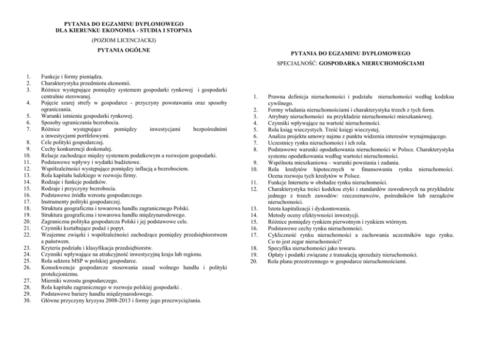 PYTANIA DO EGZAMINU DYPLOMOWEGO DLA KIERUNKU EKONOMIA - STUDIA I STOPNIA (POZIOM LICENCJACKI) PYTANIA OGÓLNE PYTANIA DO EGZAMINU DYPLOMOWEGO SPECJALNOŚĆ: GOSPODARKA NIERUCHOMOŚCIAMI 1. 2. 3. 4. 5. 6. 7. 8. 9. 10. 11. 12. 13. 14. 15. 16. 17. 18. 19. 20. 21. 22. 23. 24. 25. 26. 27. 28. 29. 30. Funkcje i formy pieniądza. Charakterystyka przedmiotu ekonomii. Różnice występujące pomiędzy systemem gospodarki rynkowej i gospodarki centralnie sterowanej. Pojęcie szarej strefy w gospodarce - przyczyny powstawania oraz sposoby ograniczania. Warunki istnienia gospodarki rynkowej. Sposoby ograniczania bezrobocia. Różnice występujące pomiędzy inwestycjami bezpośrednimi a inwestycjami portfelowymi. Cele polityki gospodarczej. Cechy konkurencji doskonałej. Relacje zachodzące między systemem podatkowym a rozwojem gospodarki. Podstawowe wpływy i wydatki budżetowe. Współzależności występujące pomiędzy inflacją a bezrobociem. Rola kapitału ludzkiego w rozwoju firmy. Rodzaje i funkcje podatków. Rodzaje i przyczyny bezrobocia. Podstawowe źródła wzrostu gospodarczego. Instrumenty polityki gospodarczej. Struktura geograficzna i towarowa handlu zagranicznego Polski. Struktura geograficzna i towarowa handlu międzynarodowego. Zagraniczna polityka gospodarcza Polski i jej podstawowe cele. Czynniki kształtujące podaż i popyt. Wzajemne związki i współzależności zachodzące pomiędzy przedsiębiorstwem a państwem. Kryteria podziału i klasyfikacja przedsiębiorstw. Czynniki wpływające na atrakcyjność inwestycyjną kraju lub regionu. Rola sektora MSP w polskiej gospodarce. Konsekwencje gospodarcze stosowania zasad wolnego handlu i polityki protekcjonizmu. Mierniki wzrostu gospodarczego. Rola kapitału zagranicznego w rozwoju polskiej gospodarki . Podstawowe bariery handlu międzynarodowego. Główne przyczyny kryzysu 2008-2013 i formy jego przezwyciężania. 1. 2. 3. 4. 5. 6. 7. 8. 9. 10. 11. 12. 13. 14. 15. 16. 17. 18. 19. 20. Prawna definicja nieruchomości i podziału nieruchomości według kodeksu cywilnego. Formy władania nieruchomościami i charakterystyka trzech z tych form. Atrybuty nieruchomości na przykładzie nieruchomości mieszkaniowej. Czynniki wpływające na wartość nieruchomości. Rola ksiąg wieczystych. Treść księgi wieczystej. Analiza projektu umowy najmu z punktu widzenia interesów wynajmującego. Uczestnicy rynku nieruchomości i ich rola. Podstawowe warunki opodatkowania nieruchomości w Polsce. Charakterystyka systemu opodatkowania według wartości nieruchomości. Wspólnota mieszkaniowa – warunki powstania i zadania. Rola kredytów hipotecznych w finansowaniu rynku nieruchomości. Ocena rozwoju tych kredytów w Polsce. Funkcje Internetu w obsłudze rynku nieruchomości. Charakterystyka treści kodeksu etyki i standardów zawodowych na przykładzie jednego z trzech zawodów: rzeczoznawców, pośredników lub zarządców nieruchomości. Istota kapitalizacji i dyskontowania. Metody oceny efektywności inwestycji. Różnice pomiędzy rynkiem pierwotnym i rynkiem wtórnym. Podstawowe cechy rynku nieruchomości. Cykliczność rynku nieruchomości a zachowania uczestników tego rynku. Co to jest zegar nieruchomości? Specyfika nieruchomości jako towaru. Opłaty i podatki związane z transakcją sprzedaży nieruchomości. Rola planu przestrzennego w gospodarce nieruchomościami.