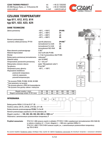 CZAKI THERMO-PRODUCT 05-090 Raszyn-Rybie, ul. 19 Kwietnia 58 www.czaki.pl tel. +48 22 7202302 fax. +48 22 7202305 e-mail [email protected] CZUJNIK TEMPERATURY typ 611, 612, 613, 614 typ 621, 622, 623, 624 DANE TECHNICZNE Klasa elementu przetwarzającego Materiał doprowadzeń Montaż Rodzaj spoiny pomiarowej termoelementu Materiał osłony Chropowatość powierzchni pomiarowej Maksymalne ciśnienie robocze Typ głowicy Temperatura pracy głowicy Wyposażenie dodatkowe przetwornik temperatury mufa do wspawania przewód kompensacyjny opornik platynowy (Pt100)(1) termoelement Cu-CuNi (T) termoelement Fe-CuNi (J) termoelement NiCr-NiAl (K) 2 (B)(2) drut Cu/Ni (dla Pt100) 2, 3 lub 4 przewodowy (dla Pt100) izolowana(2) stal 1H18N9T Ra < 0,8 µm(2) (patrz “Obciążalność osłon”) B lub NA(3) –40°C...+100°C 100 Element przetwarzający wymienny wkład pomiarowy TP-701 (Pt100) (T) (J) (K) 80 –40°C...+550°C –40°C...+400°C –40°C...+600°C –40°C...+900°C M (4) M M20x1,5 G1/2” Æ Æ (mm) 8 9 10 11 (1) Na życzenie Pt500, Pt1000, Ni100, Ni1000 (2) Inne parametry na życzenie (3) Na życzenie głowica z IP65 lub kwasoodporna (4) Na życzenie inne gwinty calowe i metryczne Długość czujnika L (mm) Długość wymiennego wkładu TP-701 (mm) WYKONANIA L Zakres pomiarowy 100 230 200 330 TP 300 430 400 530 600 730 800 930 1000 1130 6 Rodzaj gwintu M20x1,5 (1) lub G1/2” (2) Średnica osłony Æ8 (1), Æ9 (2), Æ10 (3), Æ11 (4) Rodzaj elementu przetwarzającego Pt100, T, J lub K Element przetwarzający pojedynczy (1) lub podwójny (2) Długość czujnika L = 100, 200, 300, 400, 600, 800 lub 1000 mm(2) Wykonanie z zamontowanym przetwornikiem temperatury T Przykład zamawiania: TP-611K-1-400 oznacza czujnik (z wkładem TP-701K-1-530) z pojedynczym termoelementem NiCr-NiAl (K) w osłonie o średnicy Æ = 8 mm i długości L = 400 mm z gwintem M20x1,5. TP-611K-1-400-T; TCH-2140-K oznacza czujnik j.w., z zamontowanym przetwornikiem temperatury typ TCH-2140-K. Na życzenie bezpłatne Świadectwo jakości określające klasę czujnika lub odpłatne Świadectwo wzorcowania dla dowolnych temperatur z oznaczonymi odchyłkami 5.7.0