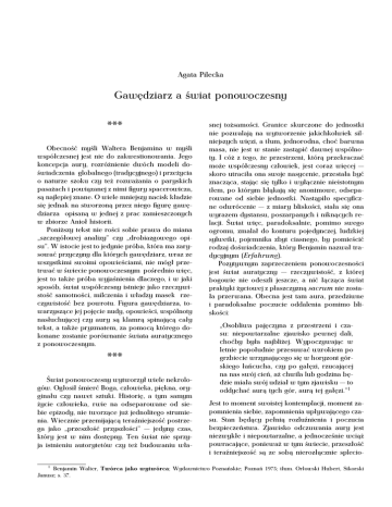 Agata Pilecka Gawędziarz a świat ponowoczesny *** Obecność myśli Waltera Benjamina w myśli współczesnej jest nie do zakwestionowania. Jego koncepcja aury, rozróżnienie dwóch modeli doświadczenia globalnego (tradycyjnego) i przeżycia o naturze szoku czy też rozważania o paryskich pasażach i powiązanej z nimi figury spacerowicza, są najlepiej znane. O wiele mniejszy nacisk kładzie się jednak na stworzoną przez niego figurę gawędziarza opisaną w jednej z prac zamieszczonych w zbiorze Anioł historii. Poniższy tekst nie rości sobie prawa do miana „szczegółowej analizy” czy „drobiazgowego opisu”. W istocie jest to jedynie próba, która ma zarysować przyczyny dla których gawędziarz, wraz ze wszystkimi swoimi opowieściami, nie mógł przetrwać w świecie ponowoczesnym pośrednio więc, jest to także próba wyjaśnienia dlaczego, i w jaki sposób, świat współczesny istnieje jako rzeczywistość samotności, milczenia i władzy masek rzeczywistość bez powrotu. Figura gawędziarza, towarzyszące jej pojęcie nudy, opowieści, wspólnoty nasłuchującej czy aury są klamrą spinającą cały tekst, a także pryzmatem, za pomocą którego dokonane zostanie porównanie świata auratycznego z ponowoczesnym. *** Świat ponowoczesny wytworzył wiele nekrologów. Ogłosił śmierć Boga, człowieka, piękna, oryginału czy nawet sztuki. Historię, a tym samym życie człowieka, rwie na odseparowane od siebie epizody, nie tworzące już jednolitego strumienia. Wiecznie przemijającą teraźniejszość postrzega jako „przeszłość przyszłości” — jedyny czas, który jest w nim dostępny. Ten świat nie sprzyja istnieniu autorytetów czy też budowaniu wła- 1 snej tożsamości. Granice skurczone do jednostki nie pozwalają na wytworzenie jakichkolwiek silniejszych więzi, a tłum, jednorodna, choć barwna masa, nie jest w stanie zastąpić dawnej wspólnoty. I cóż z tego, że przestrzeni, którą przekraczać może współczesny człowiek, jest coraz więcej — skoro utraciła ona swoje nasycenie, przestała być znacząca, stając się tylko i wyłącznie nieistotnym tłem, po którym błąkają się anonimowe, odseparowane od siebie jednostki. Nastąpiło specyficzne odwrócenie — z miary bliskości, stała się ona wyrazem dystansu, poszarpanych i niknących relacji. Świat więc, paradoksalnie, pomimo swego ogromu, zmalał do konturu pojedynczej, ludzkiej sylwetki, pojemnika zbyt ciasnego, by pomieścić rodzaj doświadczenia, który Benjamin nazwał tradycyjnym (Erfahrung). Pozytywnym zaprzeczeniem ponowoczesności jest świat auratyczny — rzeczywistość, z której bogowie nie odeszli jeszcze, a nić łącząca świat praktyki życiowej z płaszczyzną sacrum nie została przerwana. Obecna jest tam aura, przedziwne i paradoksalne poczucie oddalenia pomimo bliskości: „Osobliwa pajęczyna z przestrzeni i czasu: niepowtarzalne zjawisko pewnej dali, choćby była najbliżej. Wypoczywając w letnie popołudnie przesuwać wzrokiem po grzbiecie wrzynającego się w horyzont górskiego łańcucha, czy po gałęzi, rzucającej na nas swój cień, aż chwila lub godzina będzie miała swój udział w tym zjawisku — to oddychać aurą tych gór, aurą tej gałęzi.”1 Jest to moment swoistej kontemplacji, moment zapomnienia siebie, zapomnienia upływającego czasu. Stan będący pełnią rozluźnienia i poczucia bezpieczeństwa. Zjawisko odczuwania aury jest niezwykłe i niepowtarzalne, a jednocześnie wciąż powracające, ponieważ w tym świecie, przeszłość i teraźniejszość są ze sobą nierozłącznie splecio- Benjamin Walter, Twórca jako wytwórca; Wydawnictwo Poznańskie; Poznań 1975; tłum. Orłowski Hubert, Sikorski Janusz; s. 37. 2 APPENDIX nr 1 ne. Żyć w świecie auratycznym, to żyć zgodnie z tradycją, w czasie jednolitym, w którym mijające dni i lata nie stanowią odseparowanych od siebie epizodów, lecz tworzą całość wplecioną w pojedyncze, indywidualne, ludzkie istnienie. Tam czas płynie wolno i spokojnie, miesiące zlewają się w lata i epoki, tworząc historię naturalną, która nie wartościuje i segreguje zdarzeń czy rzeczy na ważne, doniosłe, błahe czy niegodne uwagi, lecz obejmuje całe istnienie. Ta ciągłość czasu umożliwia kumulacje doświadczeń życiowych wpisanych w krąg tradycji, której trwałe normy i zwyczaje wyznaczają miejsce każdej jednostki w życiu wspólnoty. Aby mogła ona funkcjonować jej członkowie muszą posiadać określone specjalizacje — pewne role społeczne spełniane przez całe życie. Jest to niezbędny gwarant stabilności każdej grupy, bez którego rozpadłyby się one na jednostki pozbawione trwałej tożsamości społecznej. Tradycja nie tylko wyznacza więc całościową perspektywę czasu, obejmującą swymi ramami zarówno przeszłość jak i teraźniejszość, lecz także spaja to, co jednostkowe z tym, co kolektywne. Człowiek nie jest dzięki niej samotny i zagubiony, przeciwnie — zostaje mocno osadzony w praktyce życiowej wspólnoty, której zasady i normy wyznacza i utrzymuje tradycja. Świata i ludzkiej jednostki nie dzieli żadna bariera, żaden mur, którego nie można byłoby pokonać; tkwiąca w samej ich głębi istota jest jedna. Kosmos jest całością. W takiej rzeczywistości panuje doświadczenie tradycyjne, nierozerwalnie związane ze zjawiskiem aury, i kiedy Benjamin opisuje świat, do którego nie ma już powrotu, to pojęcie zawsze znajduje się w perspektywie jego myśli. Posiada ono naturę dwoistą: z jednej strony stanowi środek, dzięki któremu możliwe jest uzyskanie życiowych rad i mądrości, drugiej — pośrednio — samo stanowi warunek swego istnienia. Dlatego właśnie raz utracone nie może zostać odzyskane. Dawny świat, świat, który przeminął, jest więc nieodwracalnie martwy. Benjamin w Narratorze. . . pisząc o opowieści wspomina: „Rada wpleciona w osnowę przeżywanego życia, jest mądrością. Sztu