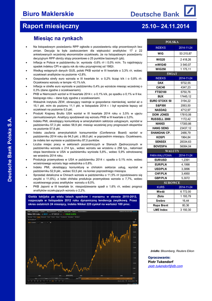Biuro Maklerskie Raport miesięczny 25.10– 24.11.2014 Miesiąc na rynkach Deutsche Bank Polska S.A. Na listopadowym posiedzeniu RPP ogłosiła o pozostawieniu stóp procentowych bez zmian. Decyzja ta była zaskoczeniem dla większości analityków: 17 z 22 ankietowanych wcześniej ekonomistów oczekiwało, że na listopadowym posiedzeniu decyzyjnym RPP obniży stopy procentowe o 25 punktów bazowych (pb). Inflacja w Polsce w październiku br. wyniosła -0,6% r/r i 0,0% m/m. To najsilniejszy spadek indeksu CPI w ujęciu rok do roku przynajmniej od 1982r. Według wstępnych danych GUS, polski PKB wzrósł w III kwartale o 3,3% r/r, wobec oczekiwań analityków na poziomie +2,8%. Gospodarka strefy euro wzrosła w III kwartale br. o 0,2% licząc k/k i o 0,8% r/r. Oczekiwano wzrostu w tempie +0,1% k/k. Inflacja w strefie euro wyniosła w październiku 0,4% po wzroście miesiąc wcześniej o 0,3% (dane zgodne z oczekiwaniami). PKB w Niemczech wzrósł w III kwartale 2014 r. o 0,1% k/k, po spadku o 0,1% w II kw. bieżącego roku – dane były zgodne z oczekiwaniami. Wskaźnik instytutu ZEW, obrazujący nastroje w gospodarce niemieckiej, wzrósł aż o 15,1 pkt. m/m do poziomu 11,1 pkt. w listopadzie 2014 r. i był wyraźnie lepszy od oczekiwań na poziomie 0,5 pkt. Produkt Krajowy Brutto USA wzrósł w III kwartale 2014 roku o 3,5% w ujęciu zannualizowanym. Analitycy spodziewali się wzrostu PKB w III kwartale o 3,0%. Indeks PMI, określający koniunkturę w amerykańskim sektorze usługowym, wyniósł w październiku 57,3 pkt. wobec 58,9 pkt. miesiąc wcześniej przy prognozach ekspertów na poziomie 57,8 pkt. Indeks zaufania amerykańskich konsumentów (Conference Board) wzrósł w październiku 2014 roku do 94,5 pkt. z 89,0 pkt. w poprzednim miesiącu. Oczekiwano, że indeks ten wyniesie w październiku 87,0 punktów. Liczba miejsc pracy w sektorach pozarolniczych w Stanach Zjednoczonych w październiku wzrosła o 214 tys., wobec wzrostu we wrześniu o 256 tys., natomiast stopa bezrobocia w USA w październiku wyniosła 5,8%., wobec 5,9% odnotowanej we wrześniu 2014 roku. Produkcja przemysłowa w USA w październiku 2014 r. spadła o 0,1% m/m, wobec wrześniowego wzrostu tego wskaźnika o 0,8%. Indeks PMI, określający koniunkturę w chińskim sektorze usług, wyniósł w październiku 52,9 pkt., wobec 53,5 pkt. na koniec poprzedniego miesiąca. Sprzedaż detaliczna w Chinach wzrosła w październiku o 11,5% r/r (spodziewano się zwyżki o 11,6%), z kolei chińska produkcja przemysłowa wzrosła o 7,7%, wobec oczekiwanego przez analityków wzrostu o 8,0%. PKB Japonii w III kwartale br. niespodziewanie spadł o 1,6% r/r, wobec prognoz analityków oczekujących wzrostu o 2,2%. Giełda tokijska po wielu latach spadków i marazmu w okresie 2010-2012, rozpoczęła w listopadzie 2012 roku dynamiczną tendencję zwyżkową. Przez okres ostatnich 24 miesięcy, indeks Nikkei 225 zyskał na wartości 100 proc. POLSKA INDEKS 2014-11-24 WIG 53 215,87 WIG20 2 418,26 mWIG40 3 540,07 WIG250 1 175,11 ŚWIAT INDEKS 2014-11-24 DAX 9732,55 CAC40 4347,23 FTSE100 6750,76 BUX 17445,12 EURO STOXX 50 3194,22 S&P500 2063,50 NASDAQ 4712,97 DOW JONES 17810,06 RUSSELL 2000 1172,42 NIKKEI 17300,86 HANG SENG 23437,12 SHANGHAI CP. 2486,79 KOSPI 1964,84 SENSEX 28334,63 BOVESPA 56084,04 WALUTY PARA WALUTOWA 2014-11-24 EUR/USD 1,2391 EUR/PLN 4,1998 USD/PLN 3,3896 CHF/PLN 3,4950 GBP/PLN 5,3072 SUROWCE KURS 2014-11-24 Miedź 6 772,00 Złoto 1 193,79 Srebro 16,44 Ropa Brent 80,36 LME Index 3 150,30 źródło: Bloomberg, Reuters Eikon Opracowanie: Piotr Tukendorf [email protected] Deutsche Bank Polska S.A. Mieszane wyniki polskich spółek giełdowych RPP po raz kolejny zaskakuje analityków Zakończył się sezon publikacji wyników spółek giełdowych za trzeci kwartał 2014 roku. Generalnie można przyjąć, że sytuacja niefinansowych przedsiębiorstw z GPW uległa tylko nieznacznej poprawie, choć zagregowany wynik netto za ostatnie cztery kwartały uległ lekkiemu obniżeniu o 2,4%, w tym w trzecim kwartale obniżył się o około 5,3%. Z kolei na poziomie operacyjnym przedsiębiorstwa odnotowały w zakończonym okresie skumulowany wzrost wyników o ok. 13%. Sektor finansowy (banki) odnotował nieco lepsze wyniki licząc kwartał do kwartału – przychody zwiększyły się o 1,4%, natomiast wynik netto wzrósł o około 3,8%. Prawdziwym testem dla tej branży powinny się okazać rezultaty za ostatni kwartał roku, w których odczuwalna będzie już październikowa obniżka stóp procentowych. Z innych branż, na uwagę zasługują mieszane wyniki sektora handlowego, gdzie dobre rezultaty odnotowały m.in. Monnari i CCC, natomiast in minus zaskoczyło LPP. Po raz kolejny nieźle zaprezentowali się deweloperzy ( zdecydowany wzrost zysków operacyjnych r/r i dodatnie wyniki większości firm na poziomie netto w porównaniu z ubiegłorocznymi stratami). Bardzo pozytywnie zaskoczyły spółki z branży informatycznej (Asseco Poland i Comarch – obie firmy zanotowały nieznaczny wzrost przychodów, zwiększeniu uległ też ich zysk netto odpowiednio o +1% i +60%). Wśród spółek z branży wydobycia i przetwórstwa metali, neutralnie wypadł KGHM (lekki spadek przychodów przy +7% wzroście zysku netto), bardzo pozytywnie zaprezentowały się natomiast Stalprodukt ( wzrost zysków o 30%) i Impexmetal (wynik netto wyższy o 21%). Podsumowując, należy stwierdzić, że wyniki spółek giełdowych okazały się neutralne, w każdej z branż odnotowano zaskoczenia zarówno pozytywne, jak i negatywne (np. dobre wyniki zanotował PKN Orlen, a z kolei Lotos mógł rozczarować inwestorów). Generalnie trzeba przyjąć, że przychody i zyski przedsiębiorstw wciąż rosną w bardzo umiarkowanym tempie, a obecne wskaźniki wyceny, choć nie wyjątkowo niskie, należy uznać za atrakcyjne do inwestowania (średni wskaźnik ceny do zysku P/E wynosi 15, a wskaźnik ceny do wartości księgowej P/BV to około 1,1). Wbrew powszec