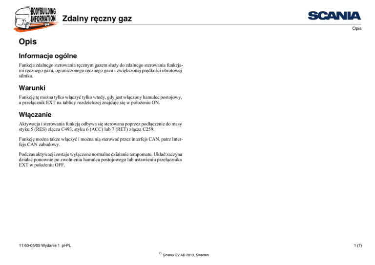 Zdalny ręczny gaz Opis Opis Informacje ogólne Funkcja zdalnego sterowania ręcznym gazem służy do zdalnego sterowania funkcjami ręcznego gazu, ograniczonego ręcznego gazu i zwiększonej prędkości obrotowej silnika. Warunki Funkcję tę można tylko włączyć tylko wtedy, gdy jest włączony hamulec postojowy, a przełącznik EXT na tablicy rozdzielczej znajduje się w położeniu ON. Włączanie Aktywacja i sterowania funkcją odbywa się sterowana poprzez podłączenie do masy styku 5 (RES) złącza C493, styku 6 (ACC) lub 7 (RET) złącza C259. Funkcję można także włączyć i można nią sterować przez interfejs CAN, patrz Interfejs CAN zabudowy. Podczas aktywacji zostaje wyłączone normalne działanie tempomatu. Układ zaczyna działać ponownie po zwolnieniu hamulca postojowego lub ustawieniu przełącznika EXT w położeniu OFF. 11:60-05/05 Wydanie 1 pl-PL 1 (7) © Scania CV AB 2013, Sweden Zdalny ręczny gaz Warunki dla podwozia Warunki dla podwozia Data produkcji pojazdu Miejsce produkcji Numer fabryczny podwozia 2005-01-21 Scania Södertälje 2 006 429 Scania Zwolle 5 117 958 Scania Angers 9 097 244 - Data produkcji pojazdu Miejsce produkcji Numer fabryczny podwozia 2005-01-21 Scania Södertälje 2 006 429 Scania Zwolle 5 117 958 Scania Angers 9 097 244 - Montowane fabrycznie pakiety wyposażenia opcjonalnego Opcja Alternatywa Kod wersji Jednostka sterująca funkcji zabudowy BWS Jest Wiązka przewodów zabudowy z kabiny do ramy 7-stykowa 7+7-stykowa 7+7+7-stykowa Wiązka przewodów zabudowy w ramie 2m 8m 12 m 3319A 2411B 2411E 2411F 3023A 3023D 3023C Montowane fabrycznie pakiety wyposażenia opcjonalnego Opcja Alternatywa Kod wersji Zestawy nadwoziowe 3319A Przygotowanie do funkcji elektrycznych Przygotowanie do zamontowania windy załadunkowej Przygotowanie do przystawki odbioru mocy Wiązka przewodów zabudowy z kabiny 4+7+7-stykowa do ramy 7+7-stykowa Wiązka przewodów zabudowy w ramie 2 m 7m 12 m 11:60-05/05 Wydanie 1 pl-PL 2411D 2411E 3023A 3023B 3023C 2 (7) © Scania CV AB 2013, Sweden Zdalny ręczny gaz Instrukcja podłączenia Instrukcja podłączenia Opcja 1: włączanie i sterowanie przez połączenie do masy Typ sygnału i aktywacja funkcji Typ sygnału Połączenie do masy styku C493-5 Połączenie do masy styku C259-6 Połączenie do masy styku C259-7 Uwagi Aktywuje funkcję. W innym przypadku używane tak samo jak przełącznik RES w tempomacie, tzn. powoduje przywrócenie zapisanej wartości prędkości obrotowej silnika. Jeśli połączenie do masy będzie trwać ponad 3 s, zostanie zapisana nowa wartość prędkości obrotowej silnika. Aktywuje funkcję. W innym przypadku używane tak samo, jak przełącznik ACC w tempomacie, tzn. zwiększa prędkość obrotową silnika. Połączenie do masy na ponad 1 s skutkuje ciągłym wzrostem prędkości obrotowej silnika. Aktywuje funkcję. W innym przypadku używane tak samo, jak przełącznik RET w tempomacie, tzn. zmniejsza prędkość obrotową silnika. Połączenie do masy na ponad 1 s skutkuje ciągłym spadkiem prędkości obrotowej silnika. Parametry, które można zmieniać za pomocą SDP3 Parametr Możliwa wartość Wybór sygnału wejściowego dla sterowania ręcz- Aktywny niski nym gazem (tryb 0, tryb 1, tryb 2 i tryb 4) Zewnętrzna sieć CAN Fabryczna Aktywny niski Dla tego połączenia Aktywny niski Układ BWS Więcej informacji na temat parametrów podano w części Parametry zmienne. 11:60-05/05 Wydanie 1 pl-PL 3 (7) © Scania CV AB 2013, Sweden Zdalny ręczny gaz Instrukcja podłączenia Informacje o częściach i położeniu połączeń 1 Włącznik 3 4 5 6 4 EXT G15 C259 C493 a. Można wykorzystać dowolne nieużywane styki w złączu C494. Wskazane styki podano wyłącznie jako przykład. Należy zwrócić uwagę, że wybór wpływa na połączenie (złącze i numeracja styków) w złączu DIN na ramie, patrz rozdział Połączenia. C259 C494 C259 C493 7 C259 C494 C493 6 C493 C494 3 5 C494 5 5 4 3 2 C494 1 6 C487 5 C487 4 2 3 2 6 1 1 11:60-05/05 Wydanie 1 pl-PL 330 466 2 Zwierny, trzypozycyjny ze sprężyną powrotną Montowany przez producenta nadwozia Włącznik Zwierny ze sprężyną powrotną Montowany przez producenta nadwozia a Przekrój poprzeczny przewodu minimum Przewód elektryczny 0,75 mm² Montowany przez producenta nadwozia a Do podłączania za pomocą końcówki Przewód elektryczny oczkowej w punkcie masowym G15 Przekrój poprzeczny przewodu minimum 0,75 mm² Montowany przez producenta nadwozia Wiązka przewodów zabudowy z Poprowadzony fabrycznie kabiny do ramy Wiązka przewodów zabudowy w Przekrój poprzeczny przewodu minimum ramie 1,5 mm² Dostarczana z fabryki, montowana przez producenta nadwozia 4 (7) © Scania CV AB 2013, Sweden Zdalny ręczny gaz Instrukcja podłączenia Opcja 2: Aktywacja przez interfejs CAN Aktywacja przez interfejs CAN jest możliwa wyłącznie w pojazdach o następujących numerach seryjnych podwozi: Miejsce produkcji Scania Södertälje Scania Zwolle Scania Angers Numer fabryczny podwozia 2005-01-21 2 006 429 5 117 958 9 097 244 - Typ sygnału i aktywacja funkcji Typ sygnału CAN Uwagi Następujące sygnały CAN służą do aktywacji i sterowania zdalnym ręcznym gazem: Scania Bodywork Control Message 1. Retardate Scania Bodywork Control Message 1. Accelerate Scania Bodywork Control Message 1. Resume 11:60-05/05 Wydanie 1 pl-PL 5 (7) © Scania CV AB 2013, Sweden Zdalny ręczny gaz Instrukcja podłączenia Parametry, które można zmieniać za pomocą SDP3 Parametr Komunikacja CAN z zabudową Możliwa wartość Brak J1939 Wszystkie Wybór sygnału wejściowego dla funkcji sterowa- Aktywny niski nia ręcznym gazem (tryb 0, tryb 1, tryb 2 i tryb 4) Zewnętrzna sieć CAN Fabryczna Wszystkie Dla tego połączenia J1939 Wszystkie Układ BWS Aktywny niski Zewnętrzna sieć CAN BWS Więcej informacji na temat parametrów podano w części Parametry zmienne. 11:60-05/05 Wydanie 1 pl-PL 6 (7) © Scania CV AB 2013, Sweden Zdalny ręczny gaz Instrukcja p