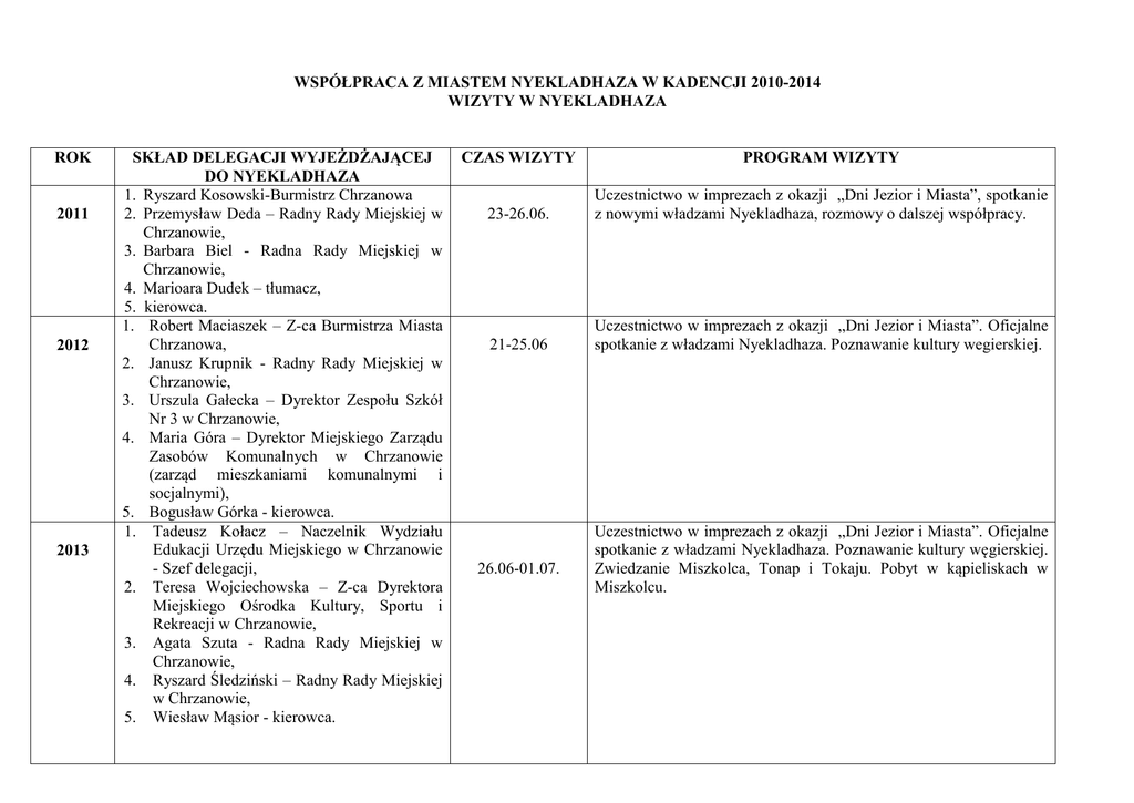 WSPÓŁPRACA Z MIASTEM NYEKLADHAZA W KADENCJI 2010-2014 WIZYTY W NYEKLADHAZA ROK 2011 2012 2013 SKŁAD DELEGACJI WYJEŻDŻAJĄCEJ DO NYEKLADHAZA 1. Ryszard Kosowski-Burmistrz Chrzanowa 2. Przemysław Deda – Radny Rady Miejskiej w Chrzanowie, 3. Barbara Biel - Radna Rady Miejskiej w Chrzanowie, 4. Marioara Dudek – tłumacz, 5. kierowca. 1. Robert Maciaszek – Z-ca Burmistrza Miasta Chrzanowa, 2. Janusz Krupnik - Radny Rady Miejskiej w Chrzanowie, 3. Urszula Gałecka – Dyrektor Zespołu Szkół Nr 3 w Chrzanowie, 4. Maria Góra – Dyrektor Miejskiego Zarządu Zasobów Komunalnych w Chrzanowie (zarząd mieszkaniami komunalnymi i socjalnymi), 5. Bogusław Górka - kierowca. 1. Tadeusz Kołacz – Naczelnik Wydziału Edukacji Urzędu Miejskiego w Chrzanowie - Szef delegacji, 2. Teresa Wojciechowska – Z-ca Dyrektora Miejskiego Ośrodka Kultury, Sportu i Rekreacji w Chrzanowie, 3. Agata Szuta - Radna Rady Miejskiej w Chrzanowie, 4. Ryszard Śledziński – Radny Rady Miejskiej w Chrzanowie, 5. Wiesław Mąsior - kierowca. CZAS WIZYTY PROGRAM WIZYTY 23-26.06. Uczestnictwo w imprezach z okazji „Dni Jezior i Miasta”, spotkanie z nowymi władzami Nyekladhaza, rozmowy o dalszej współpracy. 21-25.06 Uczestnictwo w imprezach z okazji „Dni Jezior i Miasta”. Oficjalne spotkanie z władzami Nyekladhaza. Poznawanie kultury wegierskiej. 26.06-01.07. Uczestnictwo w imprezach z okazji „Dni Jezior i Miasta”. Oficjalne spotkanie z władzami Nyekladhaza. Poznawanie kultury węgierskiej. Zwiedzanie Miszkolca, Tonap i Tokaju. Pobyt w kąpieliskach w Miszkolcu. 2014 1. Ryszard Kosowski – Burmistrz Miasta Chrzanowa wraz z małżonką 2. Teresa Wojciechowska – Z-ca Dyrektora Miejskiego Ośrodka Kultury, Sportu i Rekreacji w Chrzanowie, 3. Jacek Bojdoł – Dyrektor Zakładu Lecznictwa Ambulatoryjnego w Chrzanowie 26 – 30.06. Uczestnictwo w imprezach z okazji „Dni Jezior i Miasta”. Uczestnictwo w zjeździe 6 miejscowości, które w nazwie zawierają „Nykl” – miast z Węgier, Słowacji oraz Rumunii. Udział w otwarciu kącika flag, gdzie umieszczono flagę Polski oraz Chrzanowa. Fakt ten został odnotowany w prasie regionalnej pn.-wsch. Węgier. Udział w uroczystości otwarcia muzeum poświęconego rodzinie Lenc, która była przed wojną fundatorem kościoła katolickiego w Nyekladhaza oraz wspierała miejscową ludność. Udział w otwarciu nowego przedszkola oraz domu dziennej opieki nad osobami starszymi, jako modernizacji budynku starego przedszkola wybudowanych ze środków unijnych. Udział w przeglądzie 8. zespołów folklorystycznych z zaprzyjaźnionych miast. Chrzanów reprezentował Rodzinno-Środowiskowy Zespół Regionalny „Nasz Tata”. Ich występ spotkał się z wielkim aplauzem publiczności. Zespół uświetnił także inne uroczystości związane z obchodami święta Nyekladhaza. WSPÓŁPRACA Z MIASTEM NYEKLADHAZA W KADENCJI 2010-2014 WIZYTY W CHRZANOWIE ROK SKŁAD DELEGACJI PRZYJEŻDŻAJĄCEJ DO CHRZANOWA 4 osoby oficjalnej delegacji 2-6.06 2011 2012 2013 2014 CZAS WIZYTY 1. Zsolt Kaczvinszki – Dyrektor ds. Finansów i Rozwoju – szef delegacji 2. Miklos Marjan – Dyrektor ds. bezpieczeństwa i porządku publicznego 3. Julianna Toth - radna 4. Zoltan Szabo – członek zarządu 6. Pani Julianna Tóth Hidegné- wiceburmistrz 7. Pani Monika Minden Éliásné - kierownik Klubu Seniorów 8. Pan László Buday - członek komisji ds. Zarządzania i Finansów miasta 9. Pani Katalin Sándor Bíróné - główny doradca Urzędu Miasta 10. Kierowca 1. 2. 3. 4. Urbán Sándorné polgármester Urbán Sándor Dinnyes József – vallalkozó Dinnyes Józsefne 31.05-4.06 30.05.-3.06. PROGRAM WIZYTY Oficjalne spotkanie z Burmistrzem Chrzanowa oraz przedstawicielami samorządu w Urzędzie Miejskim w Chrzanowie, zwiedzanie zamku w Pszczynie, podziemi Sukienni, browaru w Tychach, uczestnictwo w imprezach podczas „Dni Chrzanowa”. Oficjalne spotkanie z Burmistrzem Chrzanowa oraz przedstawicielami samorządu w Urzędzie Miejskim w Chrzanowie. Oficjalne spotkanie z Burmistrzem Miasta Chrzanowa oraz przedstawicielami chrzanowskiego samorządu, Uczestnictwo w „Dniach Chrzanowa”. Uczestnictwo w prezentacji multimedialnej o Chrzanowie. Zwiedzanie Krakowa. Wycieczka do klasztoru w Czernej i pole golfowe w Paczółtowicach. Oficjalne spotkanie z Burmistrzem Miasta Chrzanowa oraz przedstawicielami chrzanowskiego samorządu. Uczestnictwo w „Dniach Chrzanowa”. Zwiedzanie Muzeum Jana Pawła II w Wadowicach oraz Parku Miniatur w Inwałdzie. Zwiedzanie Panoramy Racławickiej i Wrocławia. Zwiedzanie Fabryki Schindlera w Krakowie.