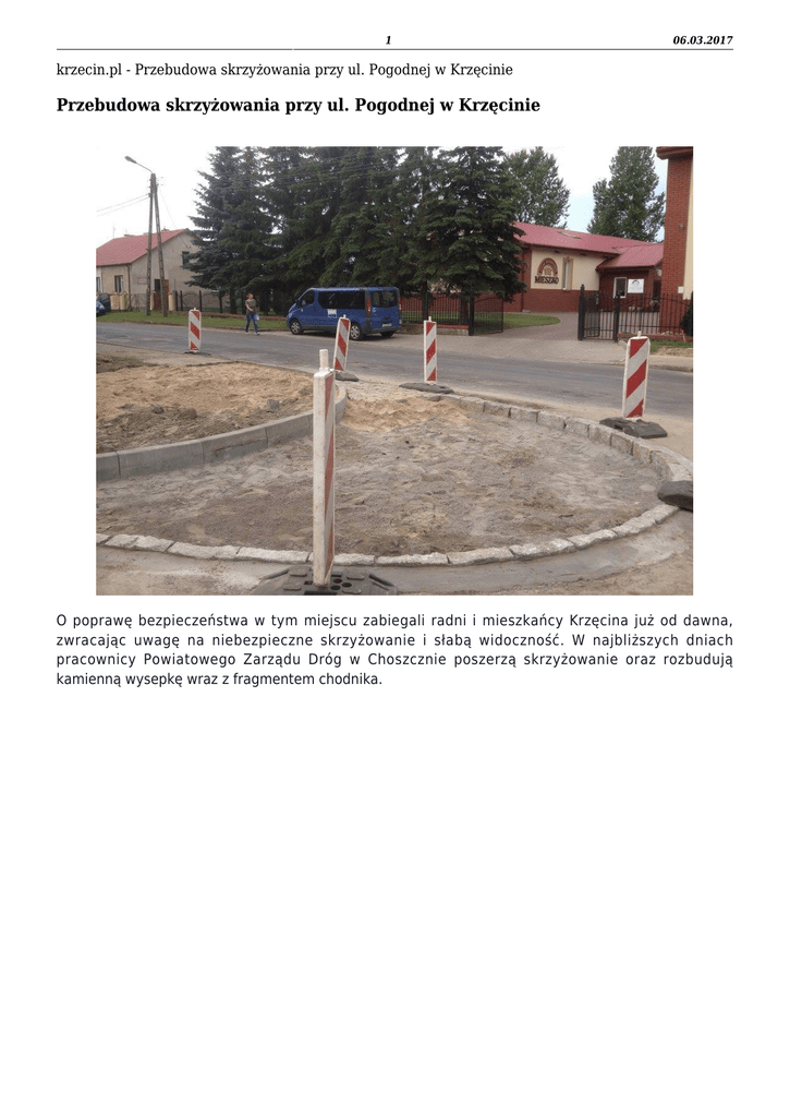 1 06.03.2017 krzecin.pl - Przebudowa skrzyżowania przy ul. Pogodnej w Krzęcinie Przebudowa skrzyżowania przy ul. Pogodnej w Krzęcinie O poprawę bezpieczeństwa w tym miejscu zabiegali radni i mieszkańcy Krzęcina już od dawna, zwracając uwagę na niebezpieczne skrzyżowanie i słabą widoczność. W najbliższych dniach pracownicy Powiatowego Zarządu Dróg w Choszcznie poszerzą skrzyżowanie oraz rozbudują kamienną wysepkę wraz z fragmentem chodnika. 2 06.03.2017