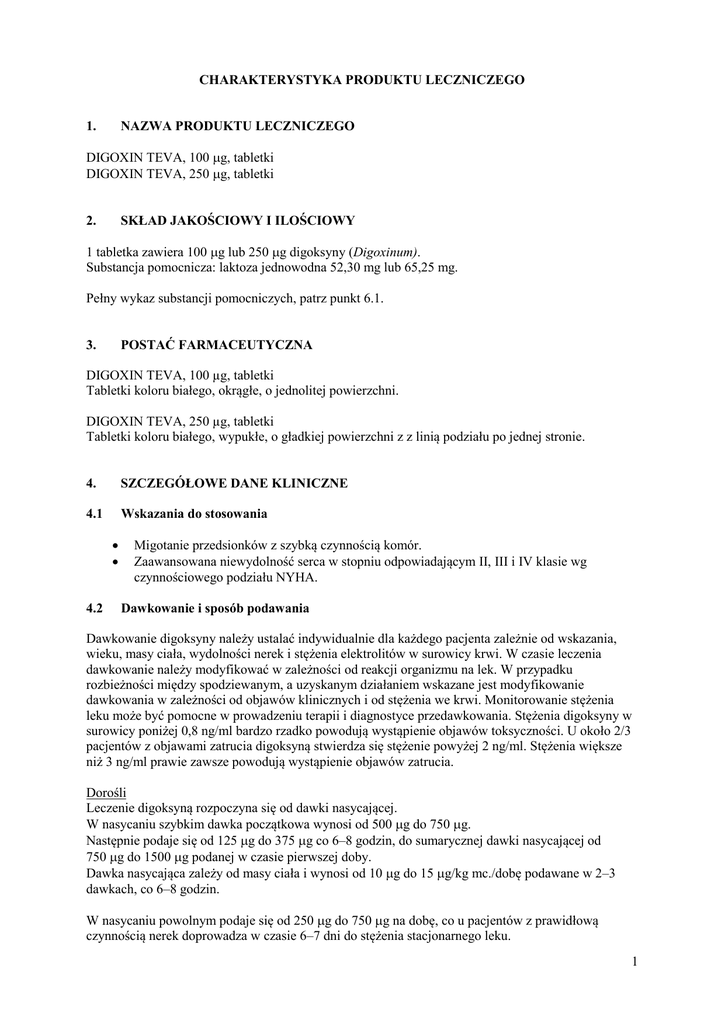 CHARAKTERYSTYKA PRODUKTU LECZNICZEGO 1. NAZWA PRODUKTU LECZNICZEGO DIGOXIN TEVA, 100 g, tabletki DIGOXIN TEVA, 250 g, tabletki 2. SKŁAD JAKOŚCIOWY I ILOŚCIOWY 1 tabletka zawiera 100 g lub 250 g digoksyny (Digoxinum). Substancja pomocnicza: laktoza jednowodna 52,30 mg lub 65,25 mg. Pełny wykaz substancji pomocniczych, patrz punkt 6.1. 3. POSTAĆ FARMACEUTYCZNA DIGOXIN TEVA, 100 µg, tabletki Tabletki koloru białego, okrągłe, o jednolitej powierzchni. DIGOXIN TEVA, 250 µg, tabletki Tabletki koloru białego, wypukłe, o gładkiej powierzchni z z linią podziału po jednej stronie. 4. SZCZEGÓŁOWE DANE KLINICZNE 4.1 Wskazania do stosowania 4.2 Migotanie przedsionków z szybką czynnością komór. Zaawansowana niewydolność serca w stopniu odpowiadającym II, III i IV klasie wg czynnościowego podziału NYHA. Dawkowanie i sposób podawania Dawkowanie digoksyny należy ustalać indywidualnie dla każdego pacjenta zależnie od wskazania, wieku, masy ciała, wydolności nerek i stężenia elektrolitów w surowicy krwi. W czasie leczenia dawkowanie należy modyfikować w zależności od reakcji organizmu na lek. W przypadku rozbieżności między spodziewanym, a uzyskanym działaniem wskazane jest modyfikowanie dawkowania w zależności od objawów klinicznych i od stężenia we krwi. Monitorowanie stężenia leku może być pomocne w prowadzeniu terapii i diagnostyce przedawkowania. Stężenia digoksyny w surowicy poniżej 0,8 ng/ml bardzo rzadko powodują wystąpienie objawów toksyczności. U około 2/3 pacjentów z objawami zatrucia digoksyną stwierdza się stężenie powyżej 2 ng/ml. Stężenia większe niż 3 ng/ml prawie zawsze powodują wystąpienie objawów zatrucia. Dorośli Leczenie digoksyną rozpoczyna się od dawki nasycającej. W nasycaniu szybkim dawka początkowa wynosi od 500 g do 750 g. Następnie podaje się od 125 g do 375 g co 6–8 godzin, do sumarycznej dawki nasycającej od 750 g do 1500 g podanej w czasie pierwszej doby. Dawka nasycająca zależy od masy ciała i wynosi od 10 g do 15 g/kg mc./dobę podawane w 2–3 dawkach, co 6–8 godzin. W nasycaniu powolnym podaje się od 250 g do 750 g na dobę, co u pacjentów z prawidłową czynnością nerek doprowadza w czasie 6–7 dni do stężenia stacjonarnego leku. 1 Zwykle stosowana dawka podtrzymująca wynosi 250 g raz lub dwa razy na dobę. U chorych przed 60 rokiem życia, z prawidłową czynnością nerek, dawka podtrzymująca, zapewniająca terapeutyczne stężenie leku w surowicy wynosi zwykle 375 g; od 60 do 80 roku życia – 250 g digoksyny na dobę. Dzieci U dzieci dawkę dobową ustala się w zależności od wieku i masy ciała i podaje się w 3–4 dawkach podzielonych. Niemowlęta i dzieci w wieku do 2 lat dawka nasycająca od 20 do 35 g/kg mc. dawka podtrzymująca od 5 do 9 g/kg mc. (25%-35% dawki nasycającej) Dzieci w wieku od 2 do 12 lat dawka nasycająca od 10 do 15 g/kg mc. dawka podtrzymująca od 3 do 5 g/kg mc. Pacjenci z niewydolnością nerek U pacjentów z niewydolnością nerek dawkowanie należy dostosować w zależności od klirensu kreatyniny. Klirens kreatyniny (ml/min) 50 – 59 20 – 49 < 20 Dawka podtrzymująca 188 – 375 g na dobę 125 – 250 g na dobę 125 g na dobę lub co 48 godzin Sposób podawania Podanie doustne. Najlepiej jest stosować lek przed posiłkami. Jeżeli jednak podawanie leku na czczo powoduje ból brzucha, to można go podać w trakcie posiłku. Należy wówczas unikać przyjmowania pokarmów bogatych w błonnik (otręby, chleb razowy), gdyż mogą one zmniejszyć wchłanianie. 4.3 Przeciwwskazania 4.4 Nadwrażliwość na digoksynę, inne glikozydy nasercowe lub na którąkolwiek substancję pomocniczą. Arytmia spowodowana zatruciem glikozydami nasercowymi. Częstoskurcz komorowy i migotanie komór. Kardiomiopatia przerostowa. Idiopatyczne przerostowe zwężenie podzastawkowe aorty. Wydłużenie czasu przewodzenia AV (blok przedsionkowo–komorowy II i III stopnia). Wczesna faza zawału serca. Ostra faza zapalenia mięśnia sercowego. Zespół chorej zatoki. Zespół przedwczesnego pobudzenia komór (Zespół Wolffa–Parkinsona–White`a). Specjalne ostrzeżenia i środki ostrożności dotyczące stosowania Toksyczne działanie digoksyny może wywołać arytmie serca. Niektóre z nich mogą przypominać arytmie, przeciw którym produkt leczniczy został przepisany. W niektórych przypadkach zaburzeń zatokowo–przedsionkowych (zespół chorej zatoki), digoksyna może wywołać lub nasilić bradykardię zatokową lub wywołać blok zatokowo–przedsionkowy. Ustalenie wartości stężenia digoksyny w surowicy krwi, może być bardzo pomocne w podjęciu decyzji o dalszym stosowaniu digoksyny, jednak dawki toksyczne innych glikozydów mogą wejść w interakcje podczas analizy, co błędnie może sugerować prawidłowe pomiary. Obserwacje prowadzone w trakcie okresu przerwania stosowania digoksyny mogą być bardziej odpowiednie. W przypadkach, gdy glikozydy nasercowe były stosowane w ciągu 2 tygodni przed 2 zastosowaniem digoksyny, zaleca się zachowanie ostrożności podczas podawania dawki początkowej, a nawet zmniejszenie dawki. W przypadku pacjentów w podeszłym wieku lub pacjentów, których klirens nerkowy digoksyny z innych powodów jest obniżony, dawkowanie produktu leczniczego należy poddać ponownemu rozważeniu. Należy wziąć pod uwagę zmniejszenie zarówno dawki początkowej jak i podtrzymującej. Hipokaliemia powoduje zwiększoną wrażliwość mięśnia sercowego na działanie glikozydów nasercowych. Hipoksja, hipomagnezemia oraz stwierdzona hiperkalcemia zwiększają wrażliwość mięśnia sercowego na glikozydy nasercowe. Pacjenci z chorobami tarczycy, którzy rozpoczęli stosowanie produktu leczniczego Digoxin Teva wymagają zachowania ostrożności. W przypadku, niedoczynności tarczycy, dawka początkowa oraz podtrzymująca produktu leczniczego Digoxin Teva powinny zostać zmniejszone. W nadczynności tarczycy występuje wzgl