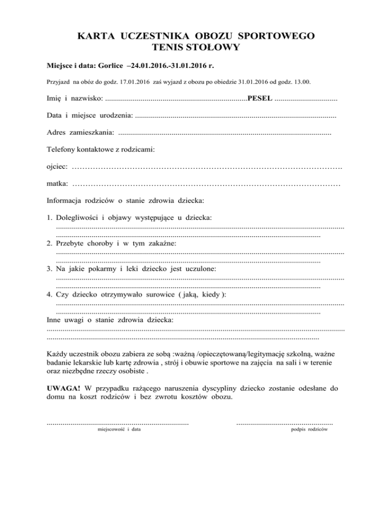 KARTA UCZESTNIKA OBOZU SPORTOWEGO TENIS STOŁOWY Miejsce i data: Gorlice –24.01.2016.-31.01.2016 r. Przyjazd na obóz do godz. 17.01.2016 zaś wyjazd z obozu po obiedzie 31.01.2016 od godz. 13.00. Imię i nazwisko: ........................................................................PESEL ................................ Data i miejsce urodzenia: ...................................................................................................... Adres zamieszkania: ............................................................................................................ Telefony kontaktowe z rodzicami: ojciec: …………………………………………………………………………………………. matka: ………………………………………………………………………………………… Informacja rodziców o stanie zdrowia dziecka: 1. Dolegliwości i objawy występujące u dziecka: .................................................................................................................................................. ...................................................................................................................................... 2. Przebyte choroby i w tym zakaźne: .................................................................................................................................................. ...................................................................................................................................... 3. Na jakie pokarmy i leki dziecko jest uczulone: .................................................................................................................................................. ...................................................................................................................................... 4. Czy dziecko otrzymywało surowice ( jaką, kiedy ): .................................................................................................................................................. ...................................................................................................................................... Inne uwagi o stanie zdrowia dziecka: ....................................................................................................................................................... .......................................................................................................................................... Każdy uczestnik obozu zabiera ze sobą :ważną /opieczętowaną/legitymację szkolną, ważne badanie lekarskie lub kartę zdrowia , strój i obuwie sportowe na zajęcia na sali i w terenie oraz niezbędne rzeczy osobiste . UWAGA! W przypadku rażącego naruszenia dyscypliny dziecko zostanie odesłane do domu na koszt rodziców i bez zwrotu kosztów obozu. ........................................................................ miejscowość i data ................................................. podpis rodziców OŚWIADCZENIE Wyrażam zgodę na gromadzenie i przetwarzanie moich* danych osobowych mojego dziecka*/wychowanka*, zawartych w dokumentacji szkoleniowej i finansowej dotyczącej realizowanych przez Małopolski Związek Stowarzyszeń Kultury Fizycznej we współpracy ze swoimi członkami statutowymi, zadań dofinansowywanych ze środków publicznych, w tym Funduszu Rozwoju Kultury Fizycznej oraz Województwa Małopolskiego, dla potrzeb administrowanych przez Ministerstwo Sportu i Turystyki systemów informatycznych oraz gromadzonej przez Województwo Małopolskie dokumentacji, zgodnie z ustawą z dnia 29.08.1997 r. o ochronie danych osobowych (Dz.U. z 2002 r. Nr 101, poz. 926 z późn. zm.) Czytelny podpis osoby pełnoletniej lub jednego opiekuna prawnego osoby niepełnoletniej nazwisko i imię zawodnika*/szkoleniowca* …………………………, dnia ……………2016 r. * - niepotrzebne skreślić OŚWIADCZENIE Wyrażam zgodę na gromadzenie i przetwarzanie moich* danych osobowych mojego dziecka*/wychowanka*, zawartych w dokumentacji szkoleniowej i finansowej dotyczącej realizowanych przez Małopolski Związek Stowarzyszeń Kultury Fizycznej we współpracy ze swoimi członkami statutowymi, zadań dofinansowywanych ze środków publicznych, w tym Funduszu Rozwoju Kultury Fizycznej oraz Województwa Małopolskiego, dla potrzeb administrowanych przez Ministerstwo Sportu i Turystyki systemów informatycznych oraz gromadzonej przez Województwo Małopolskie dokumentacji, zgodnie z ustawą z dnia 29.08.1997 r. o ochronie danych osobowych (Dz.U. z 2002 r. Nr 101, poz. 926 z późn. zm.) Czytelny podpis osoby pełnoletniej lub jednego opiekuna prawnego osoby niepełnoletniej nazwisko i imię zawodnika*/szkoleniowca* …………………………, dnia ……………2016 r. * - niepotrzebne skreślić OŚWIADCZENIE Wyrażam zgodę na gromadzenie i przetwarzanie moich* danych osobowych mojego dziecka*/wychowanka*, zawartych w dokumentacji szkoleniowej i finansowej dotyczącej realizowanych przez Małopolski Związek Stowarzyszeń Kultury Fizycznej we współpracy ze swoimi członkami statutowymi, zadań dofinansowywanych ze środków publicznych, w tym Funduszu Rozwoju Kultury Fizycznej oraz Województwa Małopolskiego, dla potrzeb administrowanych przez Ministerstwo Sportu i Turystyki systemów informatycznych oraz gromadzonej przez Województwo Małopolskie dokumentacji, zgodnie z ustawą z dnia 29.08.1997 r. o ochronie danych osobowych (Dz.U. z 2002 r. Nr 101, poz. 926 z późn. zm.) nazwisko i imię zawodnika*/szkoleniowca* …………………………, dnia ……………2016 r. * - niepotrzebne skreślić Czytelny podpis osoby pełnoletniej lub jednego opiekuna prawnego osoby niepełnoletniej ........................... dnia ................... Wyrażamy zgodę na udział mojego wychowanka*/ dziecka* ............................................................ we wszystkich akcj
