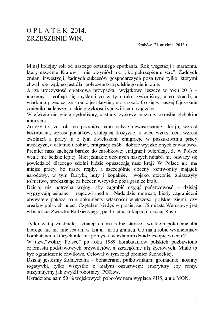 O P Ł A T E K 2014. ZRZESZENIE WiN. Kraków 21 grudnia 2013 r. Minął kolejny rok od naszego ostatniego spotkania. Rok wegetacji i marazmu, który naszemu Krajowi nie przyniósł nic „ku pokrzepieniu serc”. Żadnych zmian, inwestycji, żadnych sukcesów gospodarczych poza tymi tylko, którymi chwali się rząd, co jest dla społeczeństwa polskiego nie istotne. A, że uroczystość opłatkowa przypadła wyjątkowo jeszcze w roku 2013 – możemy cofnąć się myślami co w tym roku zyskaliśmy, a co stracili, a wiadomo przecież, że stracić jest łatwiej, niż zyskać. Co się w naszej Ojczyźnie zmieniło na lepsze, a jakie przykrości sprawili nam rządzący. W efekcie nie wiele zyskaliśmy, a straty życiowe możemy określić głębokim minusem. Znaczy to, że rok ten przyniósł nam dalsze dewastowanie kraju, wzrost bezrobocia, wzrost podatków, szalejącą drożyznę, a więc wzrost cen, wzrost zwolnień z pracy, a z tym zwiększoną emigrację w poszukiwaniu pracy mężczyzn, a ostatnio i kobiet, emigracji osób dobrze wyszkolonych zawodowo. Premier nasz zachęca bardzo do zarobkowej emigracji twierdząc, że w Polsce wcale nie będzie lepiej. Nikt jednak z uczonych naszych notabli nie odważy się powiedzieć dlaczego zdolni ludzie opuszczają nasz kraj? W Polsce nie ma miejsc pracy, bo nasze rządy, a szczególnie obecny roztrwoniły majątek narodowy, w tym fabryki, huty i kopalnie, wojsko, stocznie, zniszczyły rolnictwo, przekazując za bezcen wszystko poza granice kraju. Dzisiaj nie potrzeba wojny, aby zagrabić czyjąś państwowość – dzisiaj wygrywają usłużne rządowi media . Nadejdzie moment, kiedy zagraniczni obywatele pokażą nam dokumenty własności większości polskiej ziemi, czy areałów polskich miast. Czytałem kiedyś w prasie, że 1/5 miasta Warszawy jest własnością Związku Radzieckiego, po 45 latach okupacji, dzisiaj Rosji. Tylko w tej zaistniałej sytuacji co ma robić starsze wiekiem pokolenie dla którego nie ma miejsca ani w kraju, ani za granicą. Co mają robić wymierający kombatanci o których nikt nie pomyślał w ostatnim dwudziestopięcioleciu? W t.zw.”wolnej Polsce” po roku 1989 kombatantów polskich pozbawiono czternastu podstawowych przywilejów, a szczególnie ulg życiowych. Miało to być ograniczenie chwilowe. Celował w tym rząd premier Suchockiej. Dzisiaj jesteśmy żołnierzami – bohaterami, pułkownikami gromadnie, nosimy rogatywki, tylko wszystko z małym oszustwem: emerytury czy renty, otrzymujemy jak zwykli robotnicy PGRów. Ukradzione nam 50 % wojskowych poborów nam wypłaca ZUS, a nie MON. 1 Krocie otrzymują partyjni aktywiści i ich młode pokolenie jak: Olejnik, Lis, Kraśko i ostatnio przyjęty do TVP Sekielski, za prowadzenie antypolskiej propagandy. Na tych właśnie propagandzistach zaangażowanych w TV przez naszych rządzących spoczywa zadanie zwalczania etosu Polskiego Podziemia, szczególnie etosu WiNu, który nie uznawał rządów komuny w Polsce. IPN, który wielce się zajmuje najnowszą historią naszą, na pierwszym miejscu w działalności społeczno-niepodległościowej stawia WiN. Zrzeszenie WiN już w lutym 2001 r. zostało wyróżnione Uchwałą Sejmu Polskiego, że wielce przyczynił się do uzyskania przez nasz kraj Wolności. Wydano dzięki ofiarności i pracy pierwszego wznowionego w 1991 r, WiNu – gen. Mieczysława Huchli 6 tomów „WiN w dokumentach”. Wydano z inicjatywy historyka Andrzeja Zagórskiego i braci Nalezińskich do dzisiaj 36 numerów Zeszytów Historycznych „WiN” każdy ok. 300 stron pojemności. Kontynuuje się do dzisiaj wydawanie organu prasowego Zrzeszenia „Orzeł BIAŁY’ który jest wyrazicielem programu naszego działania. O znaczeniu i wynikach działania „WiN”u na naszym terenie niech świadczy fakt, że niemal od początku, bo od numeru 4 redakcję Zeszytów Historycznych WiN przejął nasz wielki Przyjaciel – historyk, Dr. Habilitowany, Profesor Janusz KURTYKA W późniejszych latach aż do momentu tragicznej śmierci pełnił ponadto funkcję Prezesa Zarządu Głównego Zrzeszenia WiN. Uważamy nadal, że tak Armia Krajowa, jak „WiN”, NSZ, BCH, Szare Szeregi i inne nie osiągnęły celu, dla którego walczyły. Umacnianie społeczeństwa w patriotyzmie, umiłowaniu Ojczyzny, walki o sprawiedliwy, dobrze rządzony kraj jest naszym, nas wszystkich obowiązkiem. Przedkładając powyższe wywody chcemy przypomnieć wszystkim naszym przyjaciołom, bojownikom o Wolną, Suwerenną Polskę, że Zrzeszenie WiN” jest równoznaczne ze Światowym Związkiem Żołnierzy Armii Krajowej. WiN to A.K. i na odwrót! Zarząd Obszaru Południowego „WiN” w Krakowie obejmuje region od Przemyśla do Śląska Polski Południowej. Nie rozumiemy więc, jak wspomniałem wyżej stanowiska b. dyrekcji Muzeum. Na nasze wielokrotne pisma i monity w sprawie włączenia„WiNu”w skład zarządzanego Muzeum – do dnia dzisiejszego pozostało milczenie. Nie wierzymy, że bojkotowanie nas przez b. dyrekcję Muzeum miało znaczenie polityczne. Uważamy, że zawiniła tu raczej słaba znajomość najnowszej naszej historii 2 Co dalej czy na licznych zebraniach, czy spotkaniach organizacji niepodległościowych jest podejmowany ten temat? Co dalej! A wydaje się, że i w naszych akowskich szeregach uznaje się, że nic się z nami nie dzieje. Ale uwaga: e t o s Armii Krajowej WiNu, BCH, czy NSZ szybko zanika. Egoistyczne podejścia zarządów poszczególnych ugrupowań, nie dopuszczały nikogo z zewnątrz w nasze szeregi organizacyjne. Podejmijmy, póki czas jakąś decyzję – ratowania etosu nie AK, WiNu, lecz coś na wzór „SOLIDARNOŚCI” - nie Związku Zawodowego. Jak będziemy w niewoli nie potrzebne nam będą Związki. Ukierunkować jako organizację masową ruch niepodległościowy, czuwający nad tysiącletnią Ojczyzną. Każda epoka posiadała jakąś patriotyczną straż. Przecież „SOLIDARNOŚĆ” zebrała w ciągu krótkiego czasu 10 mili