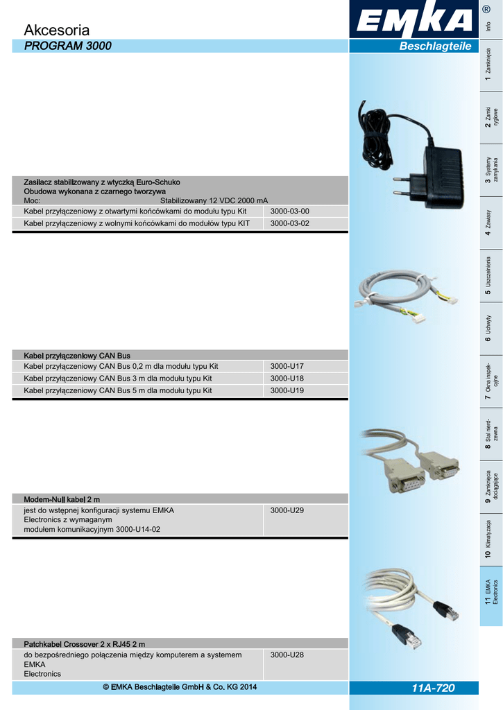 ® PROGRAM 3000 zamykania 3 Systemy ryglowe 2 Zamki Beschlagteile 1 Zamknięcia Info Akcesoria 3000-03-02 Kabel przyłączeniowy CAN Bus Kabel przyłączeniowy CAN Bus 0,2 m dla modułu typu Kit 3000-U17 Kabel przyłączeniowy CAN Bus 3 m dla modułu typu Kit 3000-U18 Kabel przyłączeniowy CAN Bus 5 m dla modułu typu Kit 3000-U19 dociągające 10 Klimatyzacja 3000-U29 11 EMKA Electronics Modem-Null kabel 2 m jest do wstępnej konfiguracji systemu EMKA Electronics z wymaganym modułem komunikacyjnym 3000-U14-02 9 Zamknięcia zewna 8 Stal nierd- cyjne 7 Okna inspek- 6 Uchwyty 5 Uszczelnienia Kabel przyłączeniowy z wolnymi końcówkami do modułów typu KIT 4 Zawiasy Zasilacz stabilizowany z wtyczką Euro-Schuko Obudowa wykonana z czarnego tworzywa Moc: Stabilizowany 12 VDC 2000 mA Kabel przyłączeniowy z otwartymi końcówkami do modułu typu Kit 3000-03-00 Patchkabel Crossover 2 x RJ45 2 m do bezpośredniego połączenia między komputerem a systemem EMKA Electronics © EMKA Beschlagteile GmbH & Co. KG 2014 3000-U28 11A-720