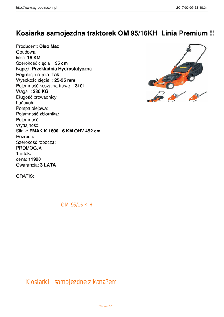 http://www.agrodom.com.pl 2017-03-06 22:10:31 Kosiarka samojezdna traktorek OM 95/16KH Linia Premium !! Producent: Oleo Mac Obudowa: Moc: 16 KM Szerokość cięcia : 95 cm Napęd: Przekładnia Hydrostatyczna Regulacja cięcia: Tak Wysokość cięcia : 25-95 mm Pojemność kosza na trawę : 310l Waga : 230 KG Długość prowadnicy: Łańcuch : Pompa olejowa: Pojemność zbiornika: Pojemność: Wydajność: Silnik: EMAK K 1600 16 KM OHV 452 cm Rozruch: Szerokość robocza: PROMOCJA 1 = tak: cena: 11990 Gwarancja: 3 LATA : GRATIS: OM 95/16 K H Kosiarki samojezdne z kana?em Strona 1/3 http://www.agrodom.com.pl 2017-03-06 22:10:31 wyrzutowym z ty?u - LINIA PREMIUM Nowa gama kosiarek samojezdnych z tylnym kana?em wyrzutowym powsta?a w odpowiedzi na oczekiwania najbardziej wymagaj?cych u?ytkowników poszukuj?cych awangardowych osi?gów roboczych podczas koszenia w po??czeniu z bezprecedensow? przyjemno?ci? prowadzenia maszyny. To wyj?tkowo wszechstronne maszyny, umo?liwiaj?ce zbieranie ?ci?tej trawy do obszernego kosza o pojemno?ci ponad 300 litrów, jej roz?adunek z ty?u lub rozdrabnianie (po w?o?eniu za?lepki stanowi?cej wyposa?enie seryjne). Nowa koncepcja platformy, zapewniaj?ca wyj?tkow? stabilno?? i odporno?? na zniekszta?cenia, gwarantuje maksymaln? przyczepno?? do nawierzchni i komfort jazdy równie? na nierównych terenach. Przyjemn? i sportow? jazd? zapewnia równie? kompaktowy kszta?t kierownicy. Ostrze uruchamiane jest przez operatora poprzez naci?ni?cie przycisku sprz?g?a elektromagnetycznego. System ten, eliminuj?c ?lizganie pasa transmisyjnego, gwarantuje precyzyjne w??czanie ostrzy bez szarpni?? za ka?dym razem Kompaktowy i przejrzysty pulpit sterowniczy. Elektroniczny wy?wietlacz umo?liwia przegl?danie przydatnych informacji, takich jak poziom na?adowania akumulatora, poziom paliwa, uruchomienie ostrzy lub otwarcie kosza (modele 95/16 H, 105, 125). Wygodne stanowisko kierowcy, dzi?ki mo?liwo?ci regulacji fotela bez u?ycia narz?dzi, umo?liwia szybkie i optymalne dostosowanie pozycji fotela do gabarytów operatora. Regulacja wysoko?ci tn?cej za pomoc? praktycznej d?wigni znajduj?cej si? w zasi?gu d?oni, ze stopniowan? skal? umo?liwiaj?c? b?yskawiczne sprawdzenie ??danej wysoko?ci ci?cia (w 7 ró?nych pozycjach w zakresie od 30 do 90 mm). Podwójny peda?, b?d?cy owocem dok?adnych bada? ergonomii, umo?liwia regulacj? pr?dko?ci i zmian? kierunku jazdy równie? podczas opró?niania kosza, zapewniaj?c intuicyjne, bezpieczne i przyjemne prowadzenie. Elektryczne opró?nianie pojemnego kosza na zbierany materia? (model 125), które mo?na wygodnie uruchamia? ze stanowiska kierowcy i które umo?liwia d?ug? autonomi? pracy. Dost?pne tak?e jako opcjonalny zestaw przeznaczony do monta?u w pozosta?ych modelach nale??cych do tej serii. Szybkoz??cze, system “ Deck Wash” znajduj?cy si? bezpo?rednio na korpusie tn?cym, umo?liwia kierowanie strumienia wody bezpo?rednio do wn?trza, u?atwiaj?c tym samym czyszczenie zespo?u tn?cego (modele 95, 105). Szeroki zderzak przedni gwarantuje wytrzyma?o?? i solidno?? w razie przypadkowych zderze?. Montowany seryjnie hak holowniczy czyni maszyn? jeszcze wszechstronniejsz? dzi?ki mo?liwo?ci ci?gni?cia wózka lub walca. Strona 2/3 http://www.agrodom.com.pl 2017-03-06 22:10:32 Pojemno?? silnika Silnik marka/model Szeroko?? koszenia Nap?d Promie? skr?tu Pojemno?? zbiornika Wymiary Ci??ar 452 cm³ Emak K 1600 AVD 95 cm hydrostatyczny 75 cm 310 L 251x117x100 cm 230 Kg Strona 3/3