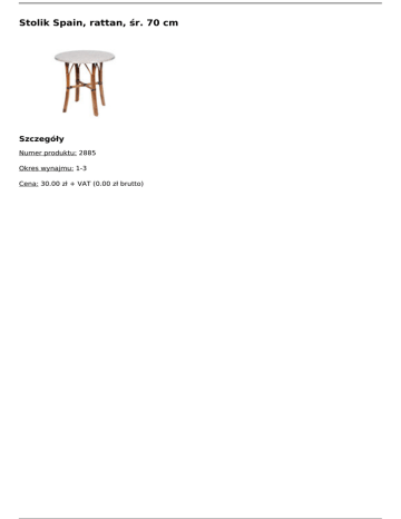Stolik Spain, rattan, śr. 70 cm Szczegóły Numer produktu: 2885 Okres wynajmu: 1-3 Cena: 30.00 zł + VAT (0.00 zł brutto) Powered by TCPDF (www.tcpdf.org)