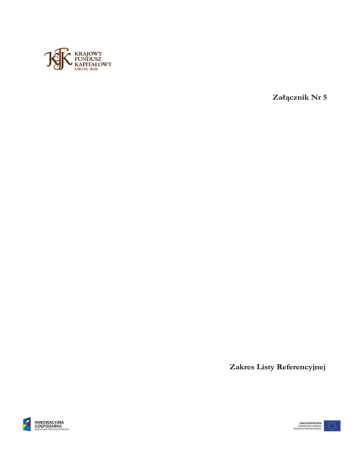 Załącznik Nr 5 Zakres Listy Referencyjnej Lista Referencyjna jest dokumentem zawierającym opis kwalifikacji, doświadczeń zawodowych oraz wykształcenia Osób Zarządzających Funduszem Kapitałowym, którzy podejmują w nim decyzje inwestycyjne, jak również uwzględnia dodatkowe informacje istotne z punktu widzenia zaangażowania się Osób Zarządzających w działalność Funduszu. Lista referencyjna wypełniania jest przez każdego z Zarządzających. Dokument powinien zawierać co najmniej: Opis wykształcenia oraz przebiegu kariery zawodowej każdej z Osób Zarządzających (CV Osób Zarządzających). Wykaz powinien zawierać informację odnośnie zdobytego wykształcenia, jak również uwzględniać nazwy firm w których pracowała każda z Osób Zarządzających, okres zaangażowania, stanowisko oraz krótki opis zakresu obowiązków; Wykaz inwestycji oraz projektów doradczych, w których brała udział każda z Osób Zarządzających, uwzględniający, jeśli dotyczy, nazwy spółek, krótki opis prowadzonej działalności, w tym branżę w której działała/działa spółka, etap inwestycji, czas trwania inwestycji, harmonogram dodatnich i ujemnych strumieni środków pieniężnych w procesie inwestycyjnym, wewnętrzną stopę zwrotu (IRR) na poziomie brutto z poszczególnych inwestycji, nazwę podmiotu, który był inwestorem w spółce oraz rolę inwestora w inwestycji, okres zaangażowania Osoby Zarządzającej w inwestycję oraz rolę, jaką dana Osoba Zarządzająca pełniła w spółce, w której dokonała inwestycji z uwzględnieniem informacji o zasiadaniu w zarządzie spółki, radzie nadzorczej lub posiadaniu akcji/udziałów podmiotu; wykaz powinien również zawierać informację o doświadczeniach Osób Zarządzających w zakresie inwestycji w przedsiębiorców innowacyjnych, prowadzących działalność badawczo – rozwojową oraz przedsiębiorców o statusie MŚP; Wykaz przedsiębiorstw funkcjonujących na rynku dłużej niż 5 lat, z wykluczeniem funduszy inwestycyjnych oraz przedsiębiorstw nieprowadzących działalności komercyjnej, założonych przez Osoby Zarządzające, w których Osoby Zarządzające zaangażowane były nie krócej niż 1 rok. Przedstawione przez Osoby Zarządzające informacje co do przedsiębiorstw założonych powinny w szczególności zawierać nazwę przedsiębiorstwa, krótki opis działalności spółki, w tym branżę w której dany podmiot prowadził/prowadzi działalność, datę założenia oraz czas funkcjonowania spółki na rynku, okres zaangażowania Osób Zarządzających oraz pełnionej przez nich roli, jak również wartość kapitałów własnych przedsiębiorstwa w ostatnim roku obrotowym, kiedy w działalność spółki zaangażowane były Osoby Zarządzające; Wykaz przedsiębiorstw, z wykluczeniem funduszy inwestycyjnych oraz przedsiębiorstw nieprowadzących działalności komercyjnej, zarządzanych nie krócej niż rok bezpośrednio przez Osoby Zarządzające. Spis powinien w szczególności zawierać nazwę podmiotu, krótki opis działalności, w tym branżę, w której działało/działa przedsiębiorstwo, okres zaangażowania Osób Zarządzających wraz z krótkim opisem ich roli, w tym z informacją odnośnie zajmowanego przez nich stanowiska. Wykaz powinien również uwzględniać wartość kapitałów własnych spółki w ostatnim roku obrotowym, w którym w jej działalność zaangażowane były Osoby Zarządzające; 2 Wykaz podmiotów, w których organach nadzorczych zasiadali/zasiadają Osoby Zarządzające oraz innych podmiotów w które zaangażowane były/są Osoby Zarządzające, a pozyskane doświadczenie jest istotne dla przyjętej strategii inwestycyjnej funduszu. Zestawienie powinno zawierać nazwę przedsiębiorstwa, krótki opis działalności, w tym branżę w której dany podmiot prowadzi/prowadził działalność, jak również okres zaangażowania Osób Zarządzających; Informację dotyczącą roli jaką Osoby Zarządzające będą pełnić w Funduszu, w tym procent czasu jaki każda z Osób Zarządzających planuje przeznaczyć na pracę w Funduszu, jak również informację wskazującą sposób i termin związania Osób Zarządzających z Oferentem (np. wynikający z umowy o pracę, umowy o zarządzanie); Informację zawierającą dane dotyczące obecnego miejsca zatrudnienia Osób Zarządzających (jeśli dotyczy) oraz inne działalności w które zaangażowany jest zarządzający, m.in. zarządy, rady nadzorcze. 3