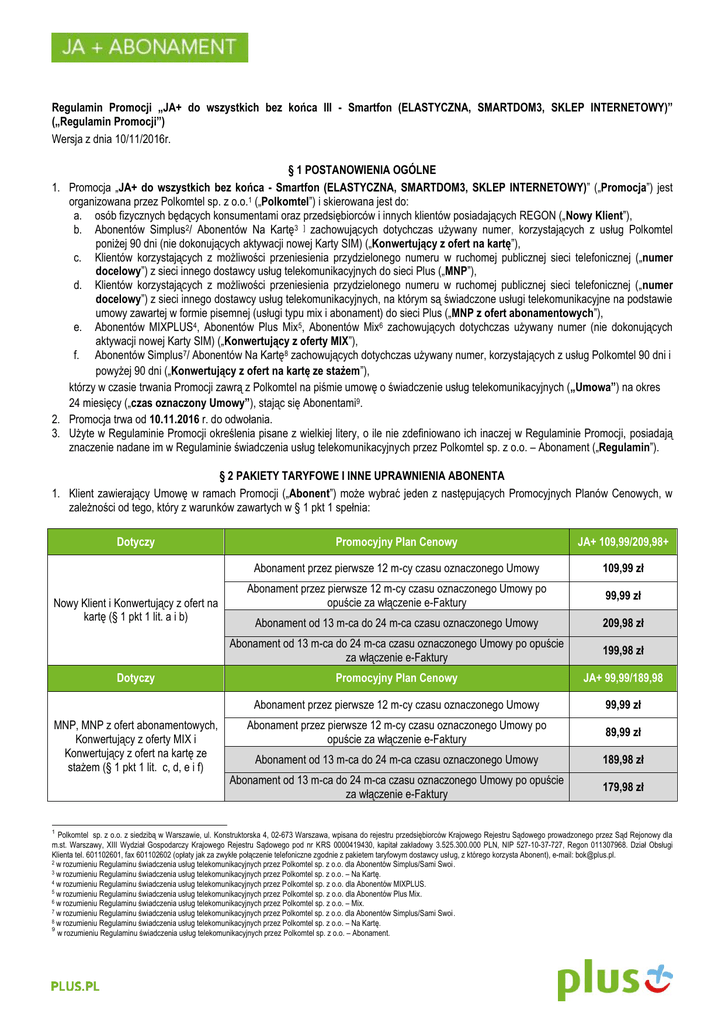 Regulamin Promocji „JA+ do wszystkich bez końca III - Smartfon (ELASTYCZNA, SMARTDOM3, SKLEP INTERNETOWY)” („Regulamin Promocji”) Wersja z dnia 10/11/2016r. § 1 POSTANOWIENIA OGÓLNE 1. Promocja „JA+ do wszystkich bez końca - Smartfon (ELASTYCZNA, SMARTDOM3, SKLEP INTERNETOWY)” („Promocja”) jest organizowana przez Polkomtel sp. z o.o.1 („Polkomtel”) i skierowana jest do: a. osób fizycznych będących konsumentami oraz przedsiębiorców i innych klientów posiadających REGON („Nowy Klient”), b. Abonentów Simplus2/ Abonentów Na Kartę3 ] zachowujących dotychczas używany numer, korzystających z usług Polkomtel poniżej 90 dni (nie dokonujących aktywacji nowej Karty SIM) („Konwertujący z ofert na kartę”), c. Klientów korzystających z możliwości przeniesienia przydzielonego numeru w ruchomej publicznej sieci telefonicznej („numer docelowy”) z sieci innego dostawcy usług telekomunikacyjnych do sieci Plus („MNP”), d. Klientów korzystających z możliwości przeniesienia przydzielonego numeru w ruchomej publicznej sieci telefonicznej („numer docelowy”) z sieci innego dostawcy usług telekomunikacyjnych, na którym są świadczone usługi telekomunikacyjne na podstawie umowy zawartej w formie pisemnej (usługi typu mix i abonament) do sieci Plus („MNP z ofert abonamentowych”), e. Abonentów MIXPLUS4, Abonentów Plus Mix5, Abonentów Mix6 zachowujących dotychczas używany numer (nie dokonujących aktywacji nowej Karty SIM) („Konwertujący z oferty MIX”), f. Abonentów Simplus7/ Abonentów Na Kartę8 zachowujących dotychczas używany numer, korzystających z usług Polkomtel 90 dni i powyżej 90 dni („Konwertujący z ofert na kartę ze stażem”), którzy w czasie trwania Promocji zawrą z Polkomtel na piśmie umowę o świadczenie usług telekomunikacyjnych („Umowa”) na okres 24 miesięcy („czas oznaczony Umowy”), stając się Abonentami9. 2. Promocja trwa od 10.11.2016 r. do odwołania. 3. Użyte w Regulaminie Promocji określenia pisane z wielkiej litery, o ile nie zdefiniowano ich inaczej w Regulaminie Promocji, posiadają znaczenie nadane im w Regulaminie świadczenia usług telekomunikacyjnych przez Polkomtel sp. z o.o. – Abonament („Regulamin”). § 2 PAKIETY TARYFOWE I INNE UPRAWNIENIA ABONENTA 1. Klient zawierający Umowę w ramach Promocji („Abonent”) może wybrać jeden z następujących Promocyjnych Planów Cenowych, w zależności od tego, który z warunków zawartych w § 1 pkt 1 spełnia: Dotyczy Nowy Klient i Konwertujący z ofert na kartę (§ 1 pkt 1 lit. a i b) Dotyczy MNP, MNP z ofert abonamentowych, Konwertujący z oferty MIX i Konwertujący z ofert na kartę ze stażem (§ 1 pkt 1 lit. c, d, e i f) 1 Promocyjny Plan Cenowy JA+ 109,99/209,98+ Abonament przez pierwsze 12 m-cy czasu oznaczonego Umowy 109,99 zł Abonament przez pierwsze 12 m-cy czasu oznaczonego Umowy po opuście za włączenie e-Faktury 99,99 zł Abonament od 13 m-ca do 24 m-ca czasu oznaczonego Umowy 209,98 zł Abonament od 13 m-ca do 24 m-ca czasu oznaczonego Umowy po opuście za włączenie e-Faktury 199,98 zł Promocyjny Plan Cenowy JA+ 99,99/189,98 Abonament przez pierwsze 12 m-cy czasu oznaczonego Umowy 99,99 zł Abonament przez pierwsze 12 m-cy czasu oznaczonego Umowy po opuście za włączenie e-Faktury 89,99 zł Abonament od 13 m-ca do 24 m-ca czasu oznaczonego Umowy 189,98 zł Abonament od 13 m-ca do 24 m-ca czasu oznaczonego Umowy po opuście za włączenie e-Faktury 179,98 zł Polkomtel sp. z o.o. z siedzibą w Warszawie, ul. Konstruktorska 4, 02-673 Warszawa, wpisana do rejestru przedsiębiorców Krajowego Rejestru Sądowego prowadzonego przez Sąd Rejonowy dla m.st. Warszawy, XIII Wydział Gospodarczy Krajowego Rejestru Sądowego pod nr KRS 0000419430, kapitał zakładowy 3.525.300.000 PLN, NIP 527-10-37-727, Regon 011307968. Dział Obsługi Klienta tel. 601102601, fax 601102602 (opłaty jak za zwykłe połączenie telefoniczne zgodnie z pakietem taryfowym dostawcy usług, z którego korzysta Abonent), e-mail: [email protected]. 2 w rozumieniu Regulaminu świadczenia usług telekomunikacyjnych przez Polkomtel sp. z o.o. dla Abonentów Simplus/Sami Swoi. 3 w rozumieniu Regulaminu świadczenia usług telekomunikacyjnych przez Polkomtel sp. z o.o. – Na Kartę. 4 w rozumieniu Regulaminu świadczenia usług telekomunikacyjnych przez Polkomtel sp. z o.o. dla Abonentów MIXPLUS. 5 w rozumieniu Regulaminu świadczenia usług telekomunikacyjnych przez Polkomtel sp. z o.o. dla Abonentów Plus Mix. 6 w rozumieniu Regulaminu świadczenia usług telekomunikacyjnych przez Polkomtel sp. z o.o. – Mix. 7 w rozumieniu Regulaminu świadczenia usług telekomunikacyjnych przez Polkomtel sp. z o.o. dla Abonentów Simplus/Sami Swoi. 8 w rozumieniu Regulaminu świadczenia usług telekomunikacyjnych przez Polkomtel sp. z o.o. – Na Kartę. 9 w rozumieniu Regulaminu świadczenia usług telekomunikacyjnych przez Polkomtel sp. z o.o. – Abonament. 2. Wszystkie podane w Regulaminie Promocji kwoty uwzględniają podatek od towarów i usług. 3. Promocyjna opłata aktywacyjna wynosi 0 zł. 4. W ramach Promocji Abonent spełniający warunki opisane w § 1 pkt. 1 lit. d, tj. MNP z ofert abonamentowych otrzyma opust 100% na abonament przez 3 pierwsze pełne okresy rozliczeniowe od momentu aktywacji karty SIM/USIM w ramach Umowy 5. Liczbę minut wliczonych w abonament oraz usługi/pakiety dodatkowe w poszczególnych Promocyjnych Planach Cenowych przedstawia tabela poniżej: Promocyjny Plan Cenowy JA+ 109,99/209,98+ JA+ 99,99/189,98 Usługa „Połączenia bez limitu do wszystkich sieci komórkowych”10 Bezpłatnie przez cały okres świadczenia Usług11 Liczba minut do krajowych sieci stacjonarnych12 Bez Limitu Liczba SMS oraz MMS do wszystkich krajowych sieci komórkowych13 Bez Limitu Pakiet Internetowy Non Stop 10 GB Usługa „Nielimitowany Internet LTE” Bezpłatnie przez cały okres świadczenia Usług Pakiet Internetowy w Roamingu 