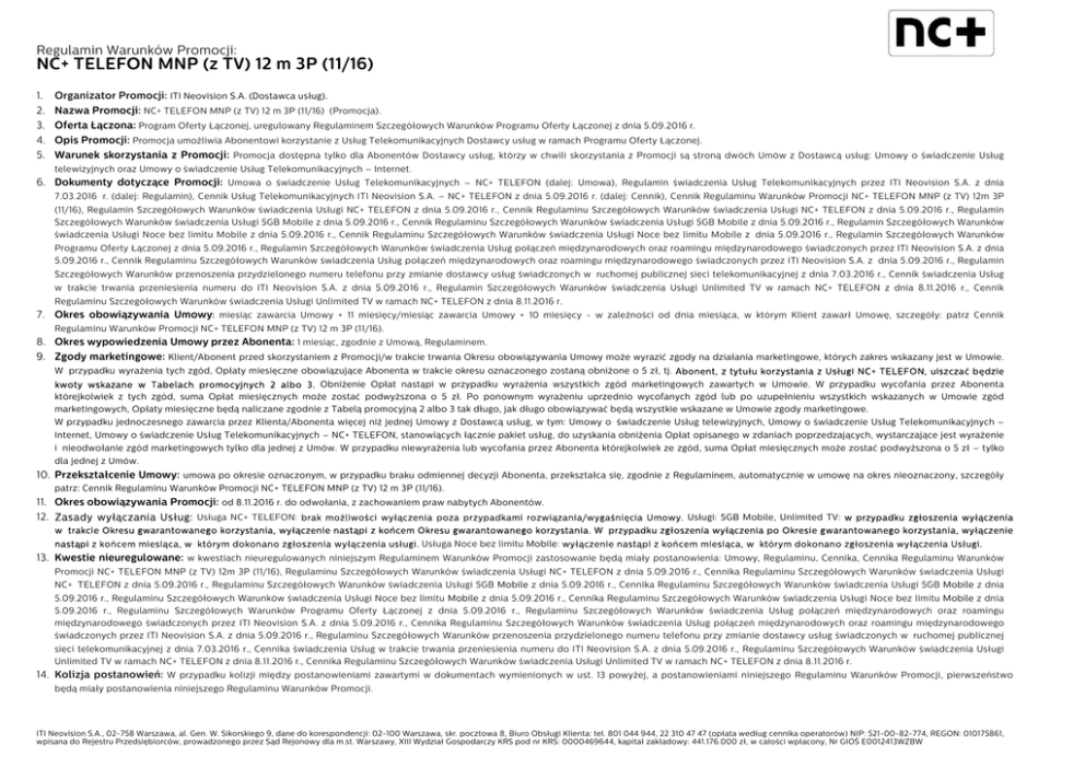 Regulamin Warunków Promocji: NC+ TELEFON MNP (z TV) 12 m 3P (11/16) 1. 2. 3. 4. 5. Organizator Promocji: ITI Neovision S.A. (Dostawca usług). Nazwa Promocji: NC+ TELEFON MNP (z TV) 12 m 3P (11/16) (Promocja). Oferta Łączona: Program Oferty Łączonej, uregulowany Regulaminem Szczegółowych Warunków Programu Oferty Łączonej z dnia 5.09.2016 r. Opis Promocji: Promocja umożliwia Abonentowi korzystanie z Usług Telekomunikacyjnych Dostawcy usług w ramach Programu Oferty Łączonej. Warunek skorzystania z Promocji: Promocja dostępna tylko dla Abonentów Dostawcy usług, którzy w chwili skorzystania z Promocji są stroną dwóch Umów z Dostawcą usług: Umowy o świadczenie Usług telewizyjnych oraz Umowy o świadczenie Usług Telekomunikacyjnych – Internet. 6. Dokumenty dotyczące Promocji: Umowa o świadczenie Usług Telekomunikacyjnych – NC+ TELEFON (dalej: Umowa), Regulamin świadczenia Usług Telekomunikacyjnych przez ITI Neovision S.A. z dnia 7.03.2016 r. (dalej: Regulamin), Cennik Usług Telekomunikacyjnych ITI Neovision S.A. – NC+ TELEFON z dnia 5.09.2016 r. (dalej: Cennik), Cennik Regulaminu Warunków Promocji NC+ TELEFON MNP (z TV) 12m 3P (11/16), Regulamin Szczegółowych Warunków świadczenia Usługi NC+ TELEFON z dnia 5.09.2016 r., Cennik Regulaminu Szczegółowych Warunków świadczenia Usługi NC+ TELEFON z dnia 5.09.2016 r., Regulamin Szczegółowych Warunków świadczenia Usługi 5GB Mobile z dnia 5.09.2016 r., Cennik Regulaminu Szczegółowych Warunków świadczenia Usługi 5GB Mobile z dnia 5.09.2016 r., Regulamin Szczegółowych Warunków świadczenia Usługi Noce bez limitu Mobile z dnia 5.09.2016 r., Cennik Regulaminu Szczegółowych Warunków świadczenia Usługi Noce bez limitu Mobile z dnia 5.09.2016 r., Regulamin Szczegółowych Warunków Programu Oferty Łączonej z dnia 5.09.2016 r., Regulamin Szczegółowych Warunków świadczenia Usług połączeń międzynarodowych oraz roamingu międzynarodowego świadczonych przez ITI Neovision S.A. z dnia 5.09.2016 r., Cennik Regulaminu Szczegółowych Warunków świadczenia Usług połączeń międzynarodowych oraz roamingu międzynarodowego świadczonych przez ITI Neovision S.A. z dnia 5.09.2016 r., Regulamin Szczegółowych Warunków przenoszenia przydzielonego numeru telefonu przy zmianie dostawcy usług świadczonych w ruchomej publicznej sieci telekomunikacyjnej z dnia 7.03.2016 r., Cennik świadczenia Usług w trakcie trwania przeniesienia numeru do ITI Neovision S.A. z dnia 5.09.2016 r., Regulamin Szczegółowych Warunków świadczenia Usługi Unlimited TV w ramach NC+ TELEFON z dnia 8.11.2016 r., Cennik Regulaminu Szczegółowych Warunków świadczenia Usługi Unlimited TV w ramach NC+ TELEFON z dnia 8.11.2016 r. 7. Okres obowiązywania Umowy: miesiąc zawarcia Umowy + 11 miesięcy/miesiąc zawarcia Umowy + 10 miesięcy - w zależności od dnia miesiąca, w którym Klient zawarł Umowę, szczegóły: patrz Cennik Regulaminu Warunków Promocji NC+ TELEFON MNP (z TV) 12 m 3P (11/16). 8. Okres wypowiedzenia Umowy przez Abonenta: 1 miesiąc, zgodnie z Umową, Regulaminem. 9. Zgody marketingowe: Klient/Abonent przed skorzystaniem z Promocji/w trakcie trwania Okresu obowiązywania Umowy może wyrazić zgody na działania marketingowe, których zakres wskazany jest w Umowie. W przypadku wyrażenia tych zgód, Opłaty miesięczne obowiązujące Abonenta w trakcie okresu oznaczonego zostaną obniżone o 5 zł, tj. Abonent, z tytułu korzystania z Usługi NC+ TELEFON, uiszczać będzie kwoty wskazane w Tabelach promocyjnych 2 albo 3. Obniżenie Opłat nastąpi w przypadku wyrażenia wszystkich zgód marketingowych zawartych w Umowie. W przypadku wycofania przez Abonenta którejkolwiek z tych zgód, suma Opłat miesięcznych może zostać podwyższona o 5 zł. Po ponownym wyrażeniu uprzednio wycofanych zgód lub po uzupełnieniu wszystkich wskazanych w Umowie zgód marketingowych, Opłaty miesięczne będą naliczane zgodnie z Tabelą promocyjną 2 albo 3 tak długo, jak długo obowiązywać będą wszystkie wskazane w Umowie zgody marketingowe. W przypadku jednoczesnego zawarcia przez Klienta/Abonenta więcej niż jednej Umowy z Dostawcą usług, w tym: Umowy o świadczenie Usług telewizyjnych, Umowy o świadczenie Usług Telekomunikacyjnych – Internet, Umowy o świadczenie Usług Telekomunikacyjnych – NC+ TELEFON, stanowiących łącznie pakiet usług, do uzyskania obniżenia Opłat opisanego w zdaniach poprzedzających, wystarczające jest wyrażenie i nieodwołanie zgód marketingowych tylko dla jednej z Umów. W przypadku niewyrażenia lub wycofania przez Abonenta którejkolwiek ze zgód, suma Opłat miesięcznych może zostać podwyższona o 5 zł – tylko dla jednej z Umów. 10. Przekształcenie Umowy: umowa po okresie oznaczonym, w przypadku braku odmiennej decyzji Abonenta, przekształca się, zgodnie z Regulaminem, automatycznie w umowę na okres nieoznaczony, szczegóły patrz: Cennik Regulaminu Warunków Promocji NC+ TELEFON MNP (z TV) 12 m 3P (11/16). 11. Okres obowiązywania Promocji: od 8.11.2016 r. do odwołania, z zachowaniem praw nabytych Abonentów. 12. Zasady wyłączania Usług: Usługa NC+ TELEFON: brak możliwości wyłączenia poza przypadkami rozwiązania/wygaśnięcia Umowy. Usługi: 5GB Mobile, Unlimited TV: w przypadku zgłoszenia wyłączenia w trakcie Okresu gwarantowanego korzystania, wyłączenie nastąpi z końcem Okresu gwarantowanego korzystania. W przypadku zgłoszenia wyłączenia po Okresie gwarantowanego korzystania, wyłączenie nastąpi z końcem miesiąca, w którym dokonano zgłoszenia wyłączenia usługi. Usługa Noce bez limitu Mobile: wyłączenie nastąpi z końcem miesiąca, w którym dokonano zgłoszenia wyłączenia Usługi. 13. Kwestie nieuregulowane: w kwestiach nieuregulowanych niniejszym Regulaminem Warunków Promocji zastosowanie będą miały postanowienia: Umowy, Regulaminu, Cennika, Cennika Regulaminu Warunków Promocji NC+ TELEFON MNP (z TV) 1
